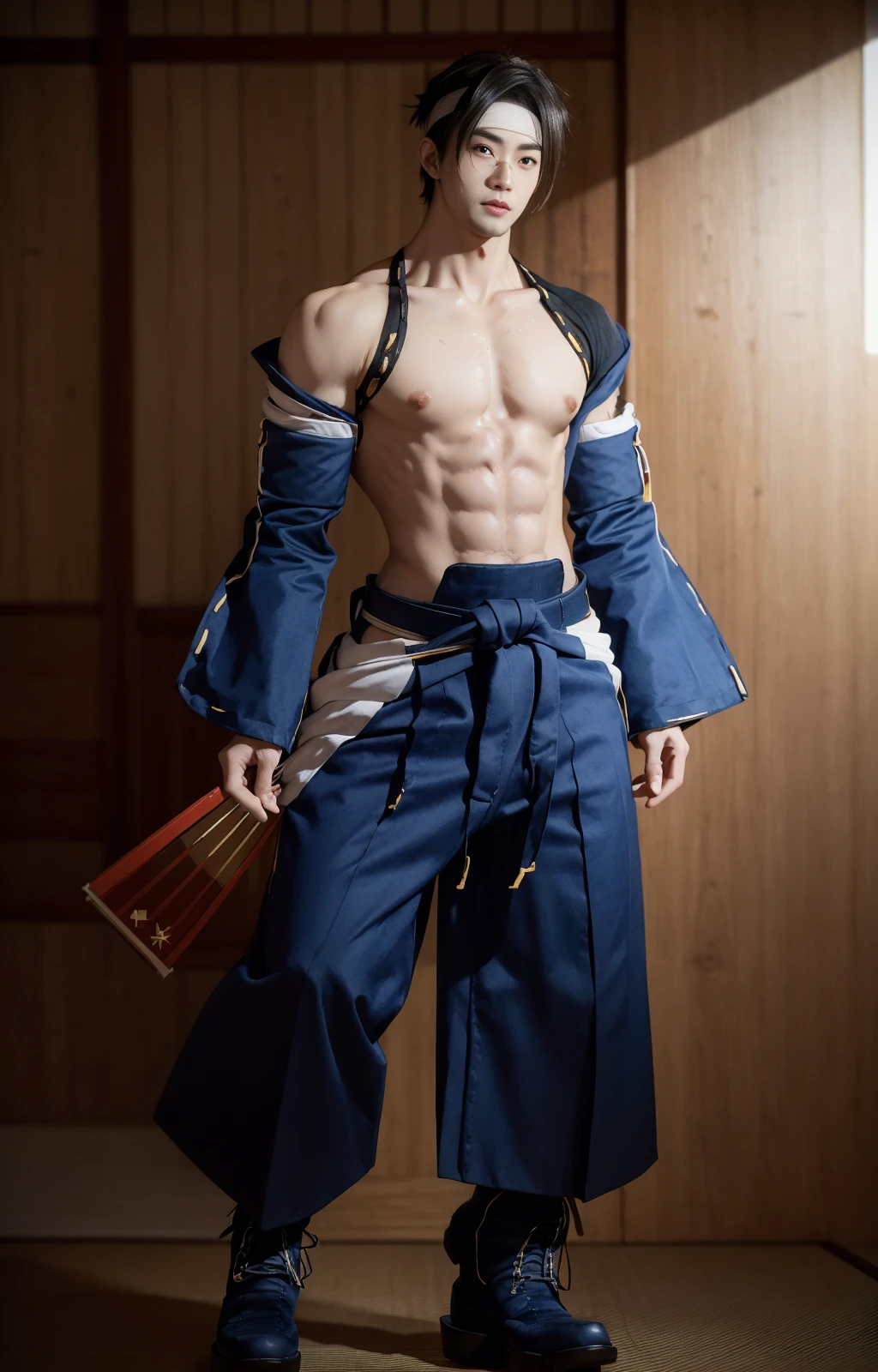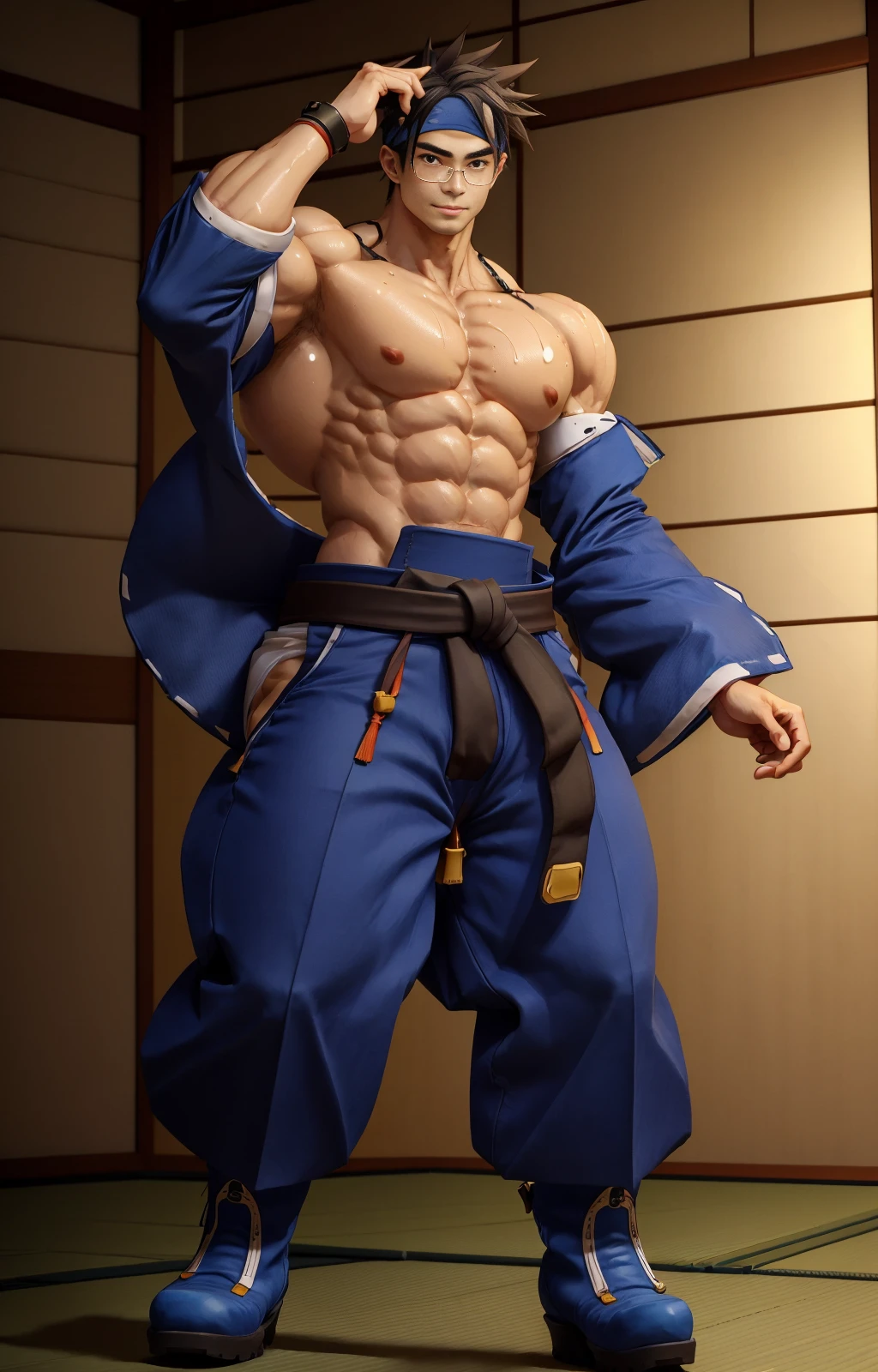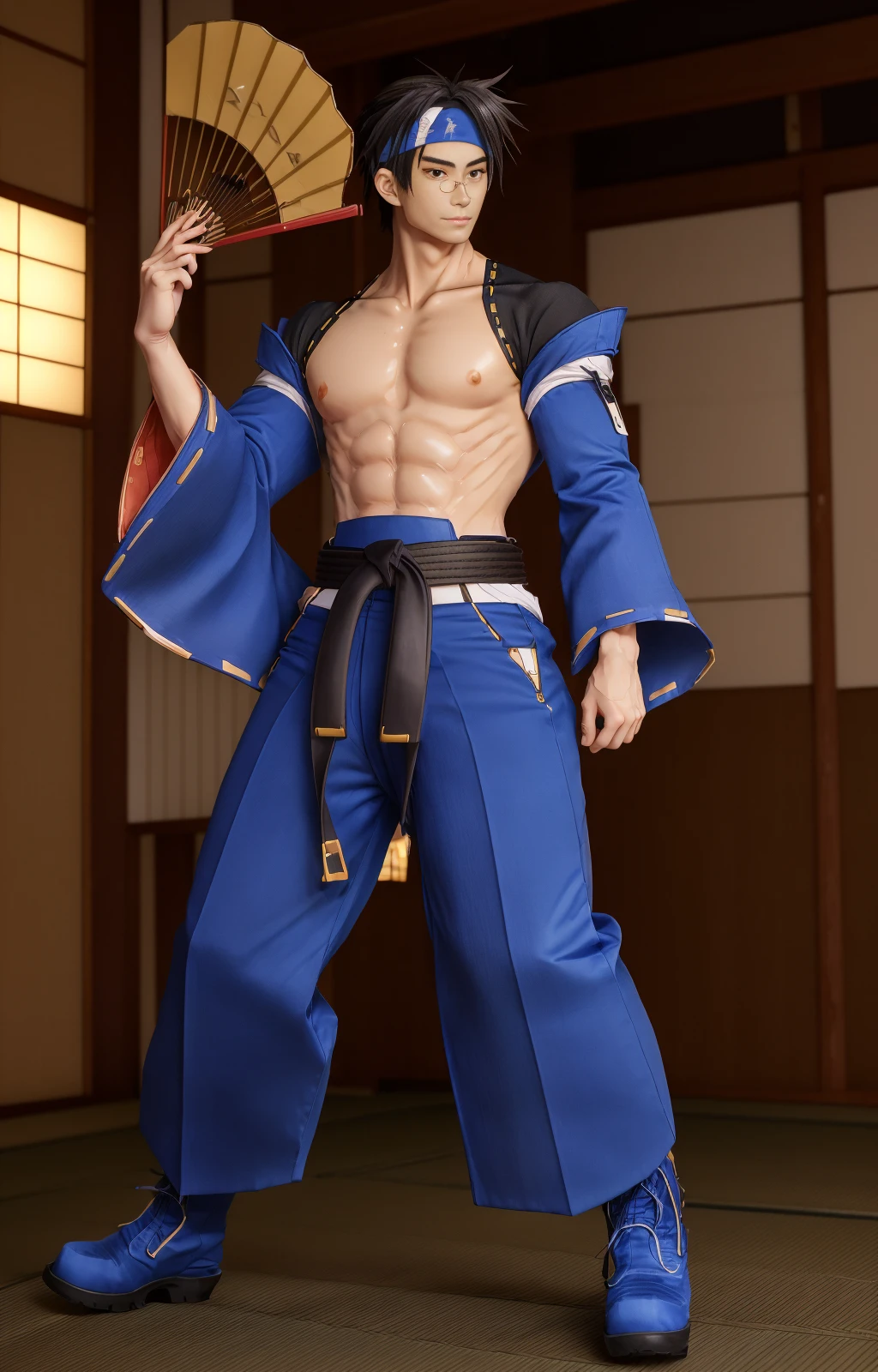 anjimito, japanese pants, long sleeves, belt, abs, big male breats, headband, eyeglasses, nipples, wristbands, spiked hair, japanese boots, fans,