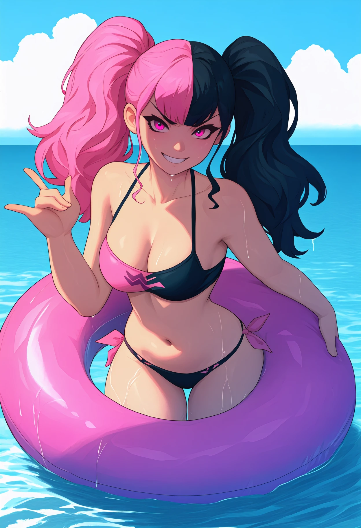 Appearance: long hair, split-color hair, black hair, pink hair, twintails, pink eyes