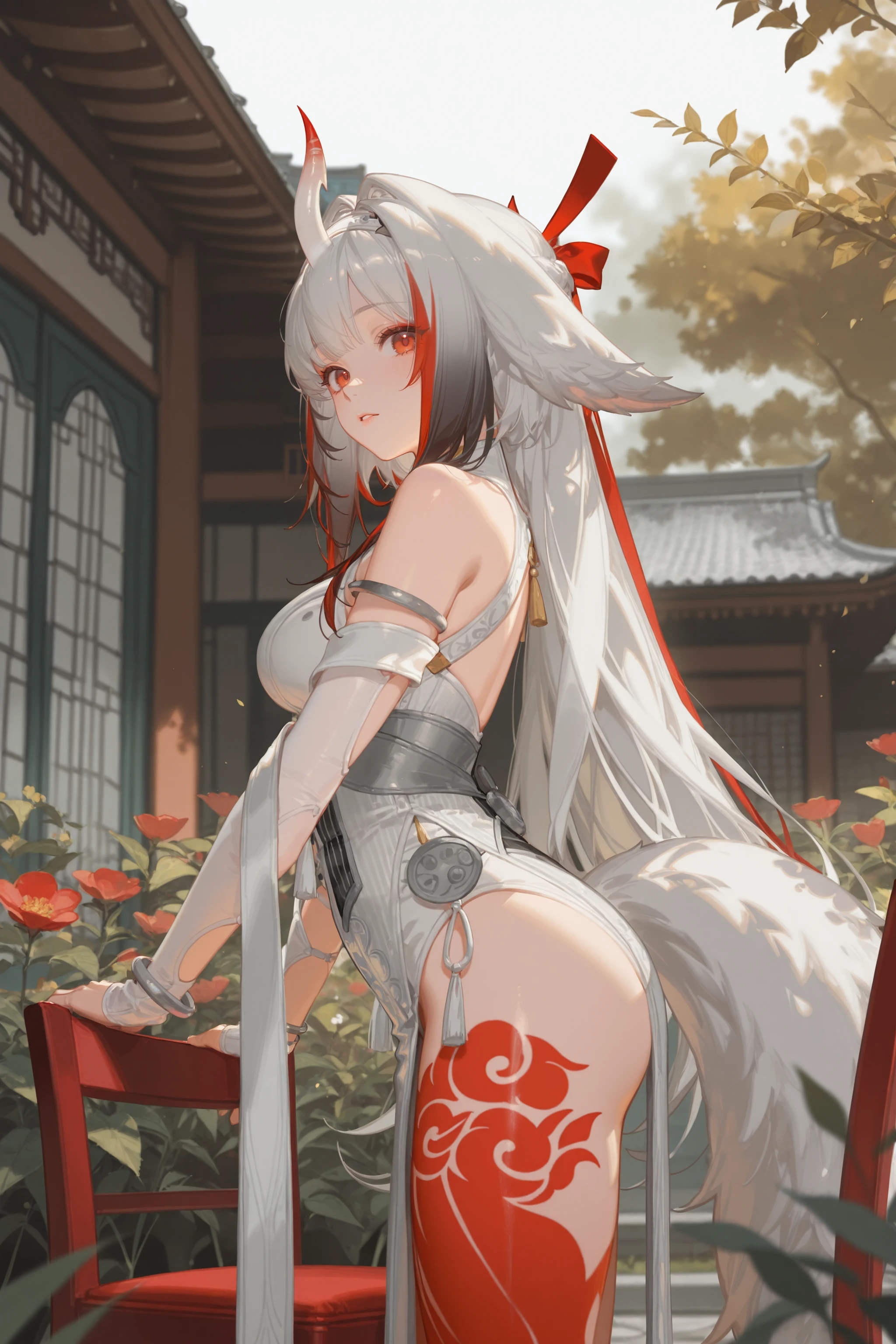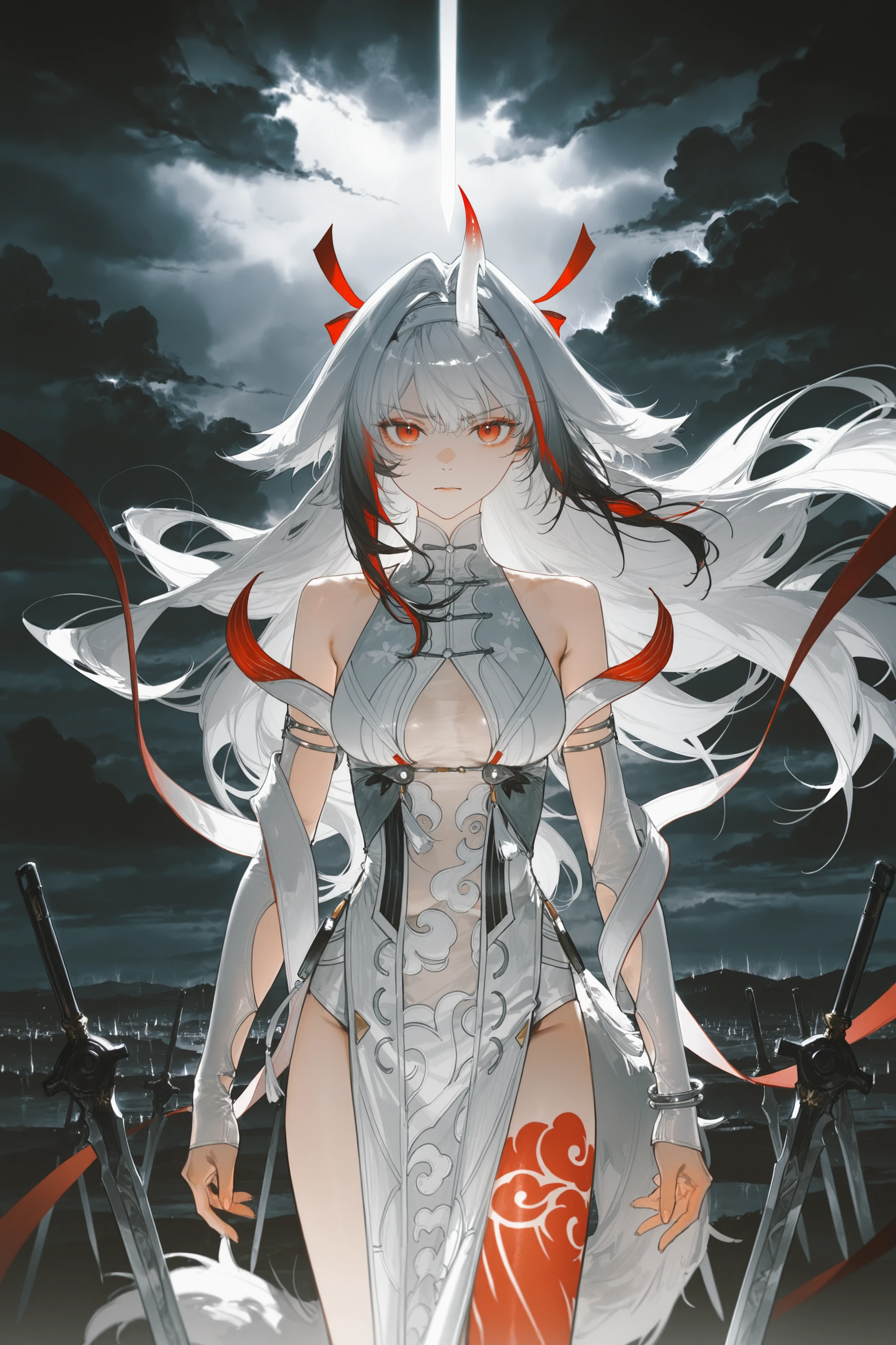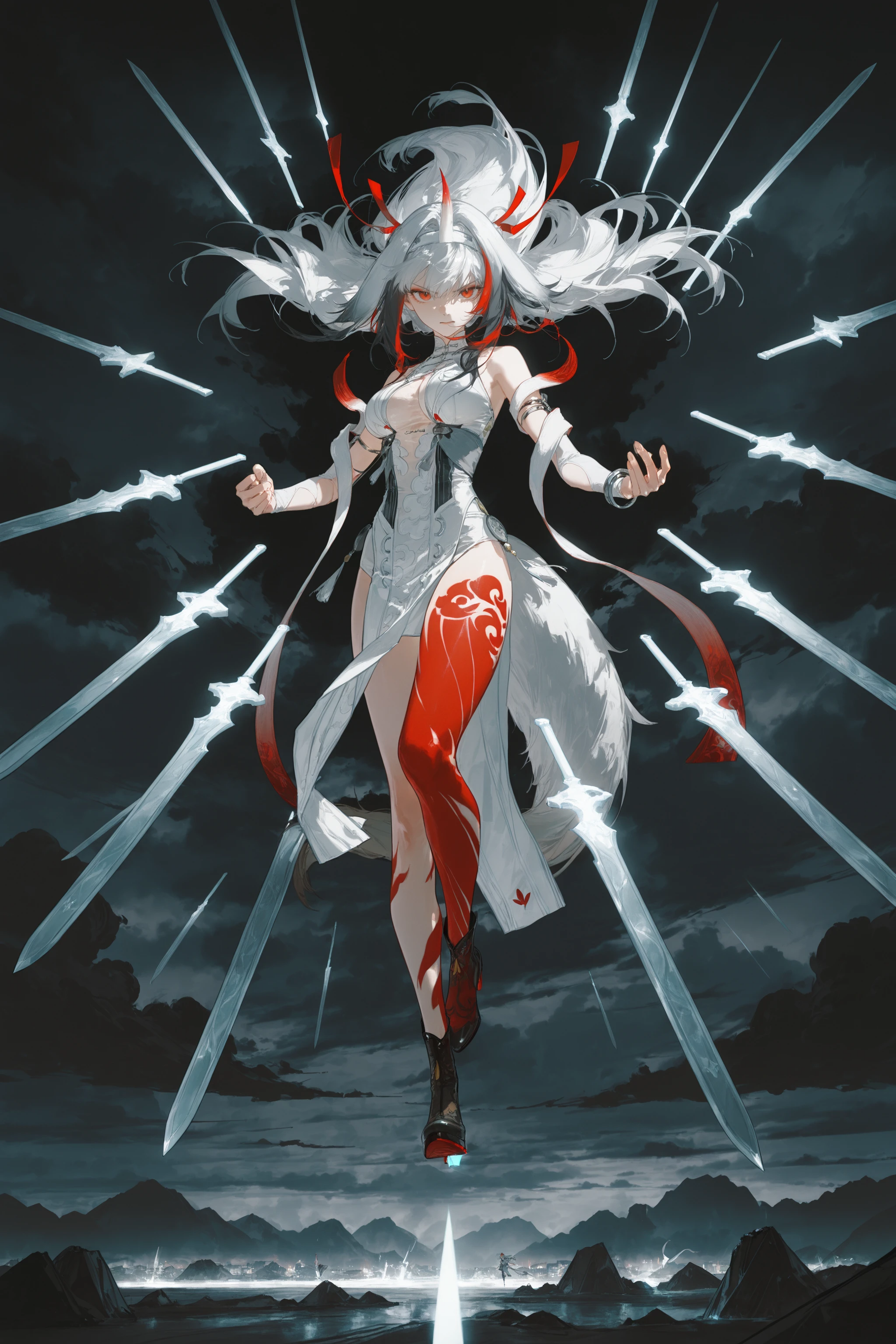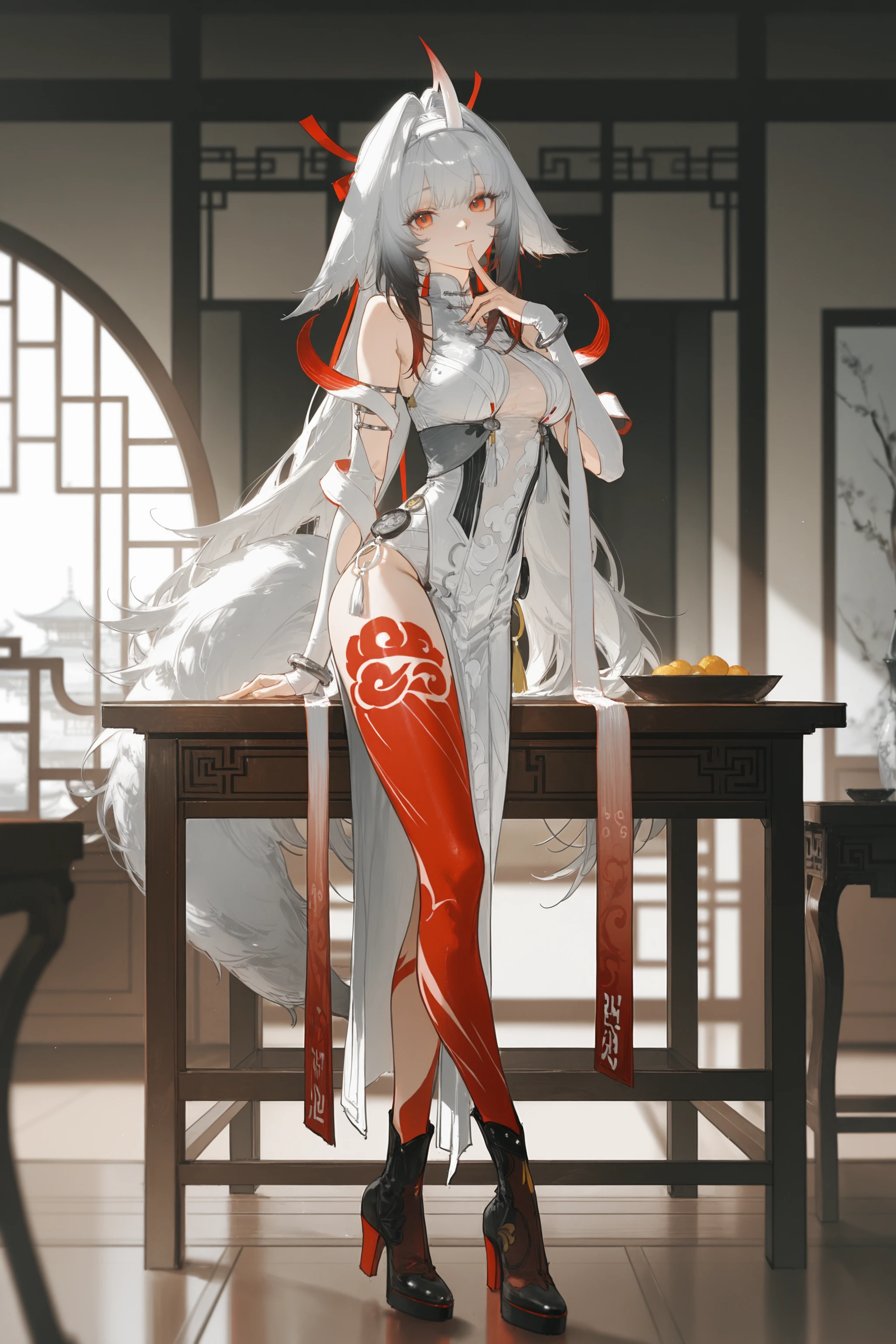 Additional prompts for the white hair version: white hair, single horn, white hairband, red hair ribbon, white sleeveless china dress, white detached sleeves, arm shawl, silver bracelet, tail, bodypaint, high heel boots