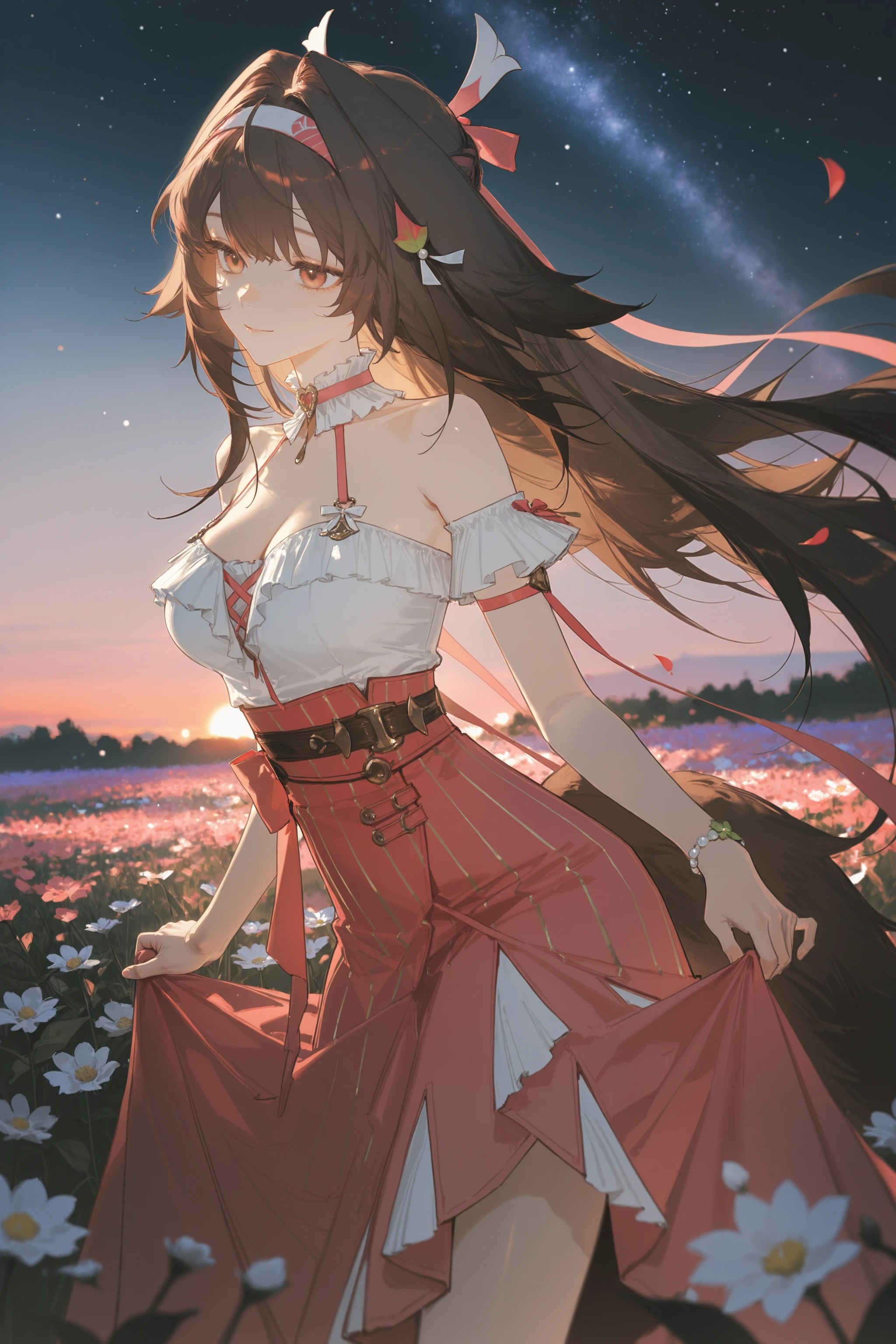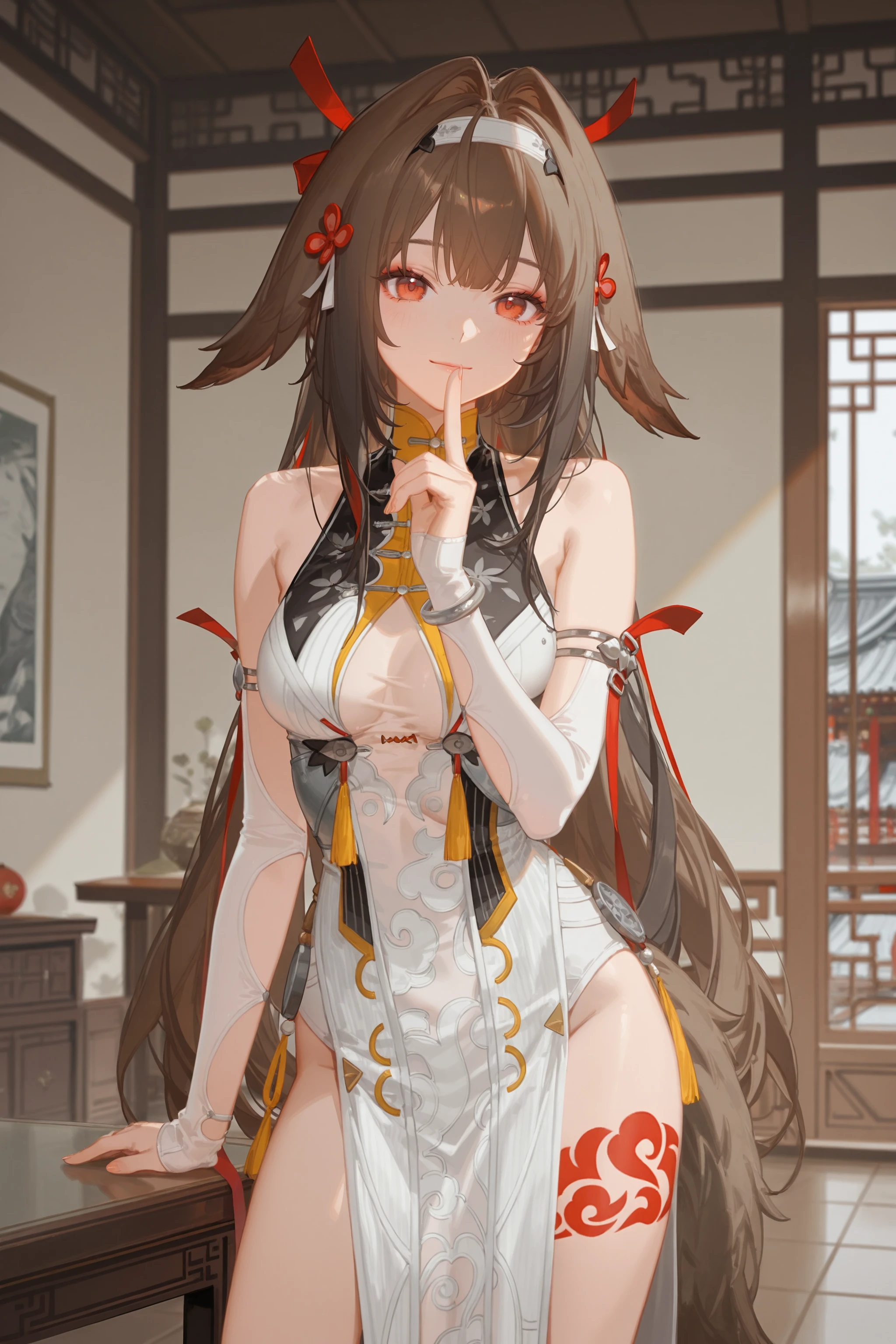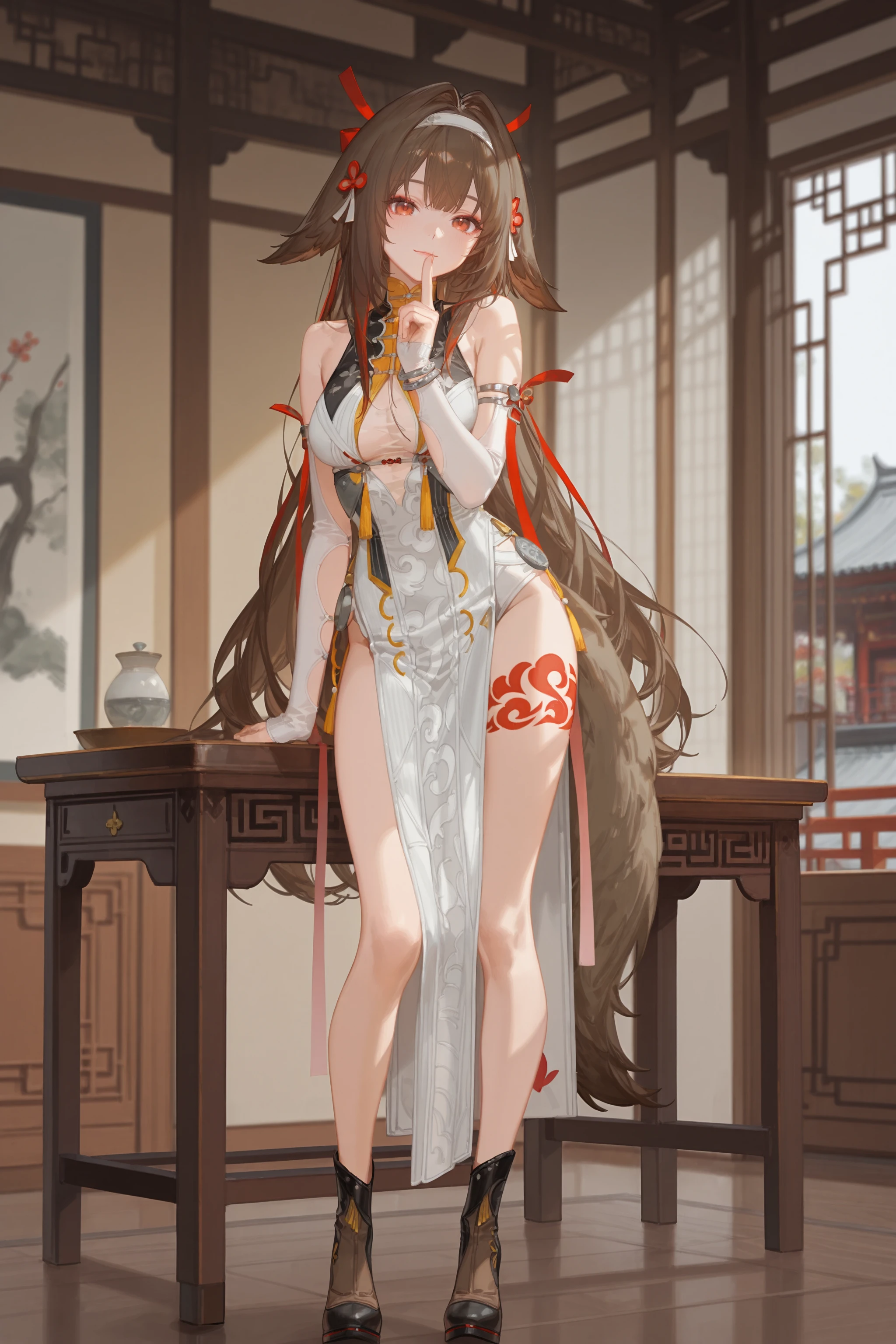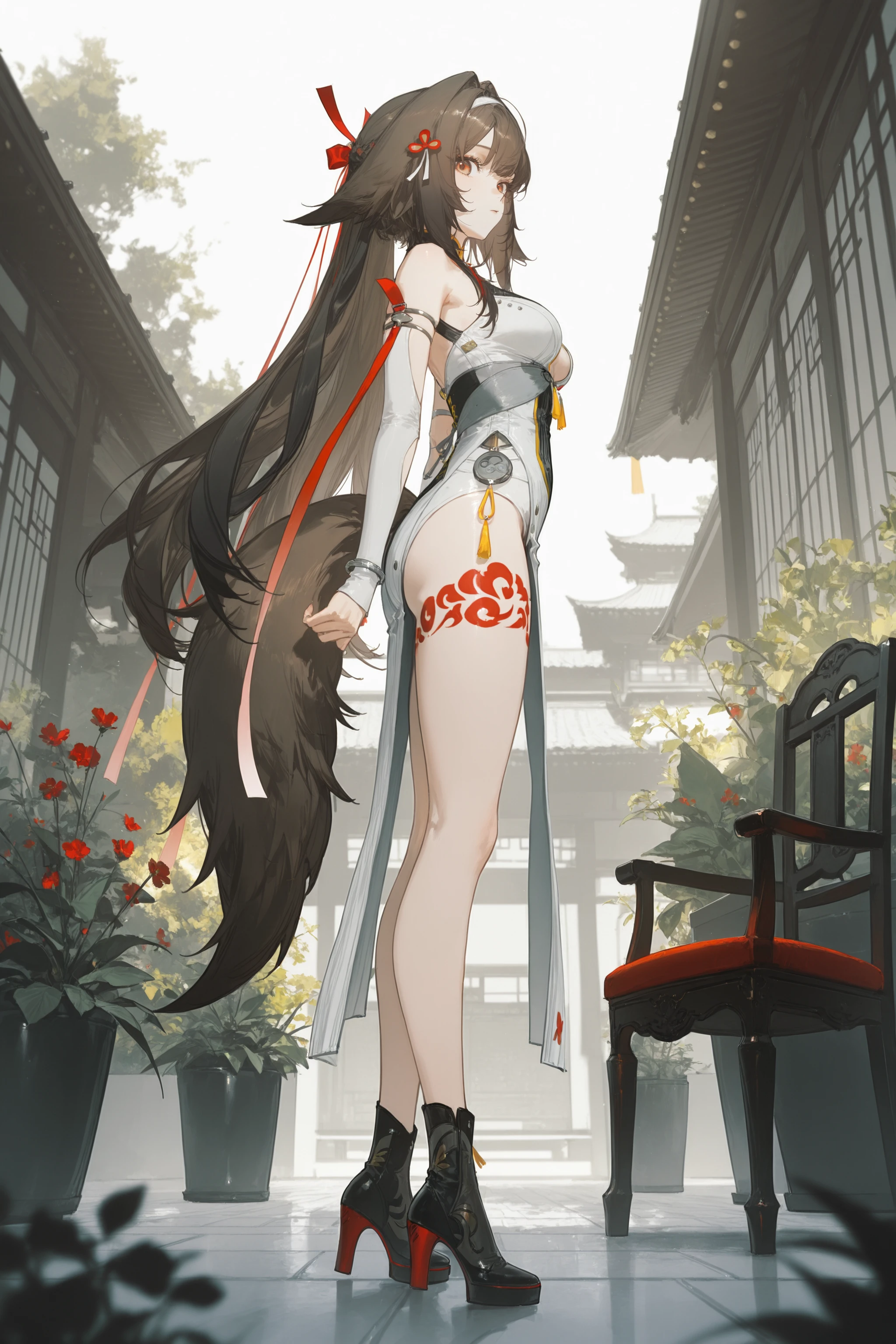 Additional prompts for default costume Clouddrift Illumination: white hairband, clover hair ornament, red hair ribbon, sleeveless china dress, white detached sleeves, arm ribbon, silver bracelet, tail, leg tattoo, high heel boots