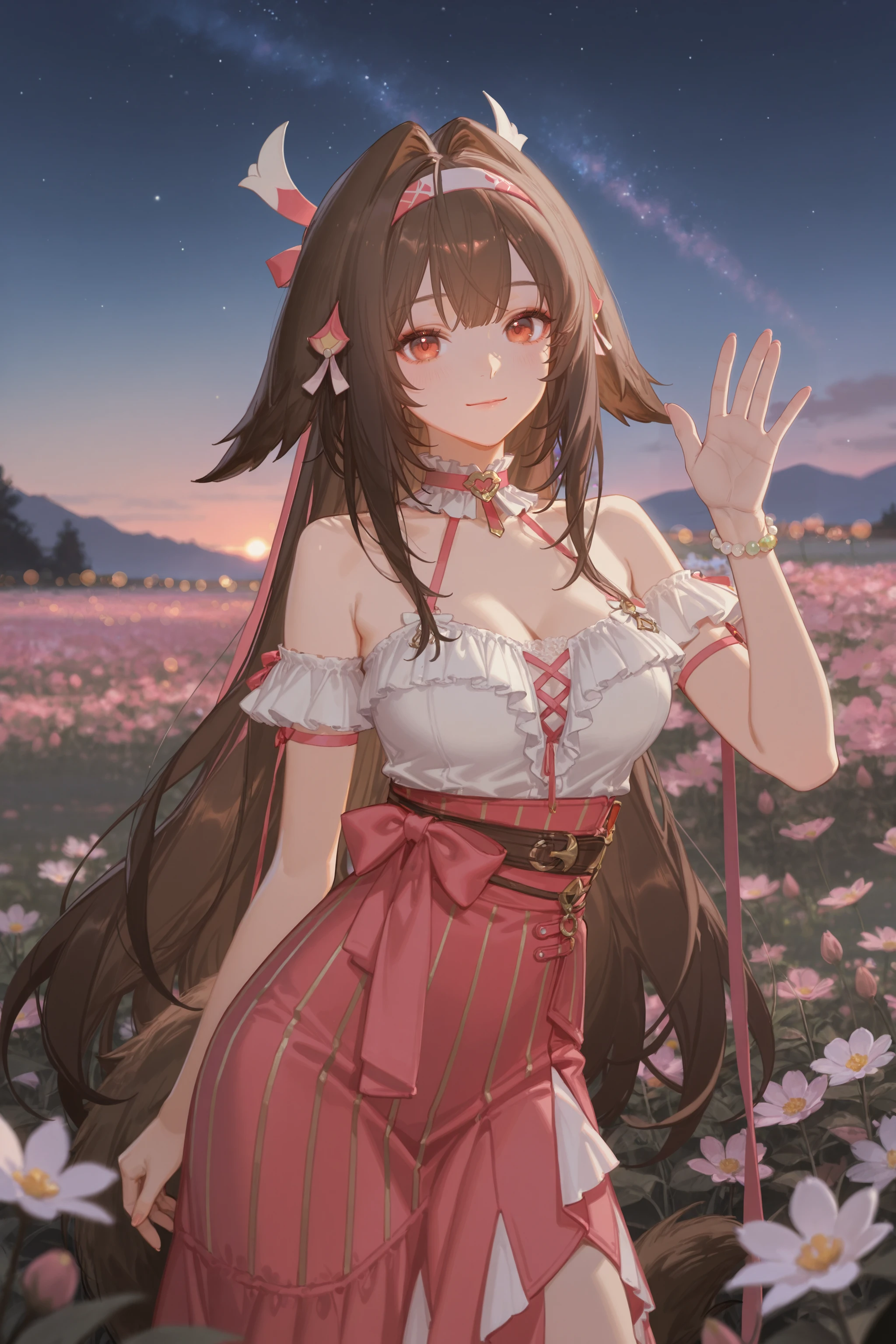Additional prompts for the "Touch of Dawnlight": pink hairband, leaf hair ornament, pink hair ribbon, frilled collar, frilled halter shirt, arm garter, pink arm ribbon, bead bracelet, tail, pink long skirt, lace socks, red strappy heels