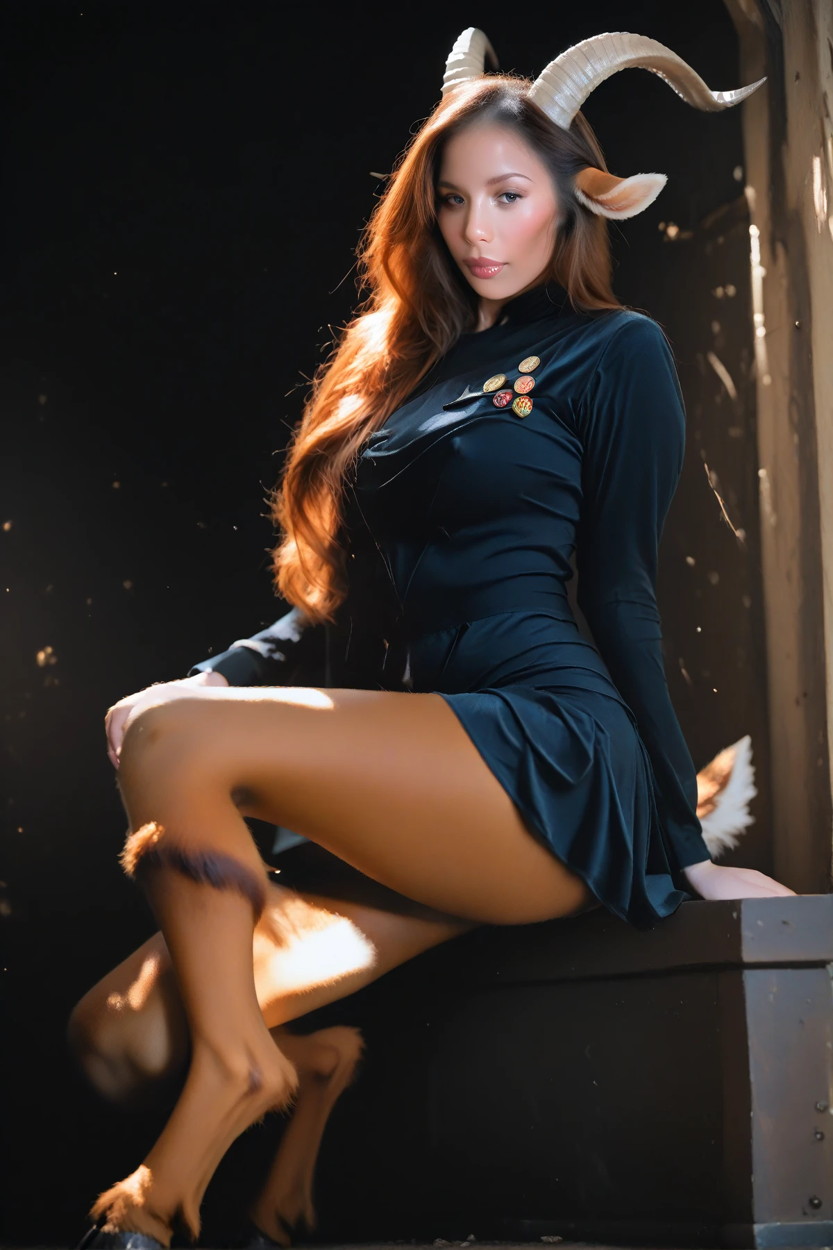 goat horns, goat ears, furry goat legs, hooves, goat tail