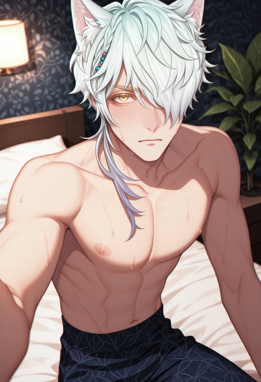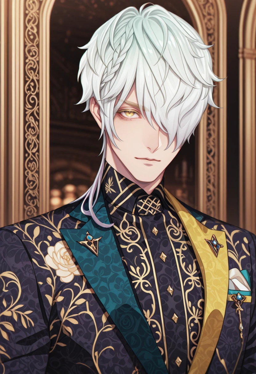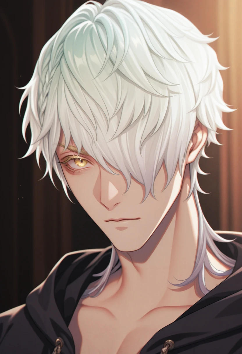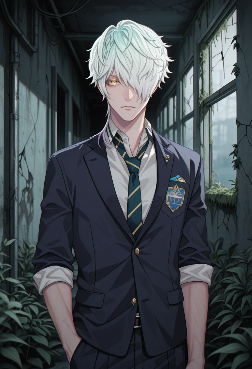 CPSASDPeter, 1boy, male focus, yellow eyes, hair over one eye, gradient hair, white hair, short hair