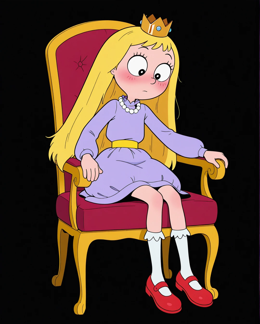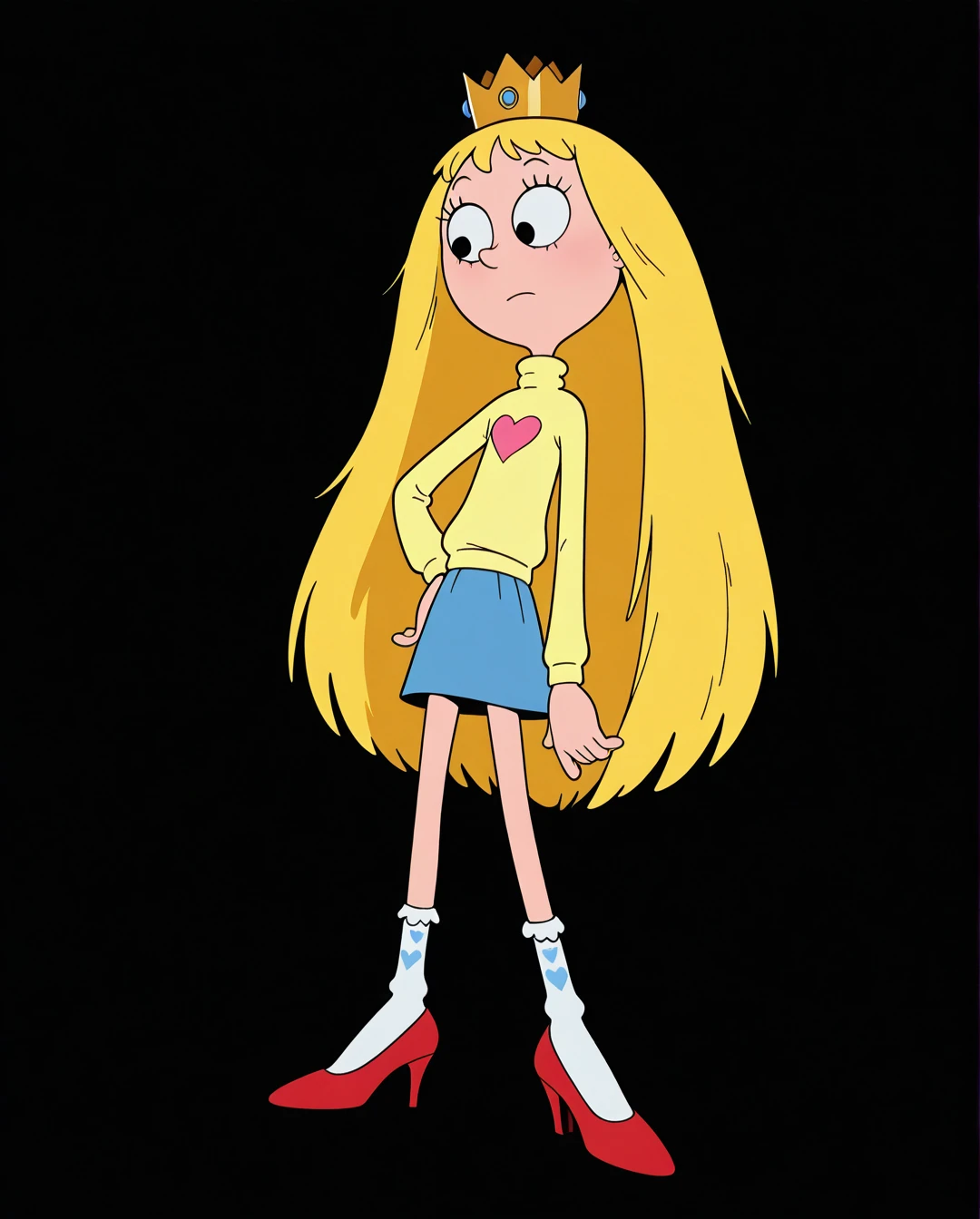 Princess_Giant, crown, blonde hair, very long hair, turtleneck, heart print, long sleeves, skirt, socks,shoes, red footwear, socks, shoes, high heels,