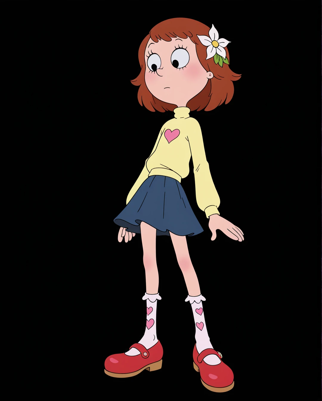 Lily_Duncan, hort hair, brown hair, hair ornament, hair flower, turtleneck, heart print, long sleeves, skirt, socks,shoes, mary janes,