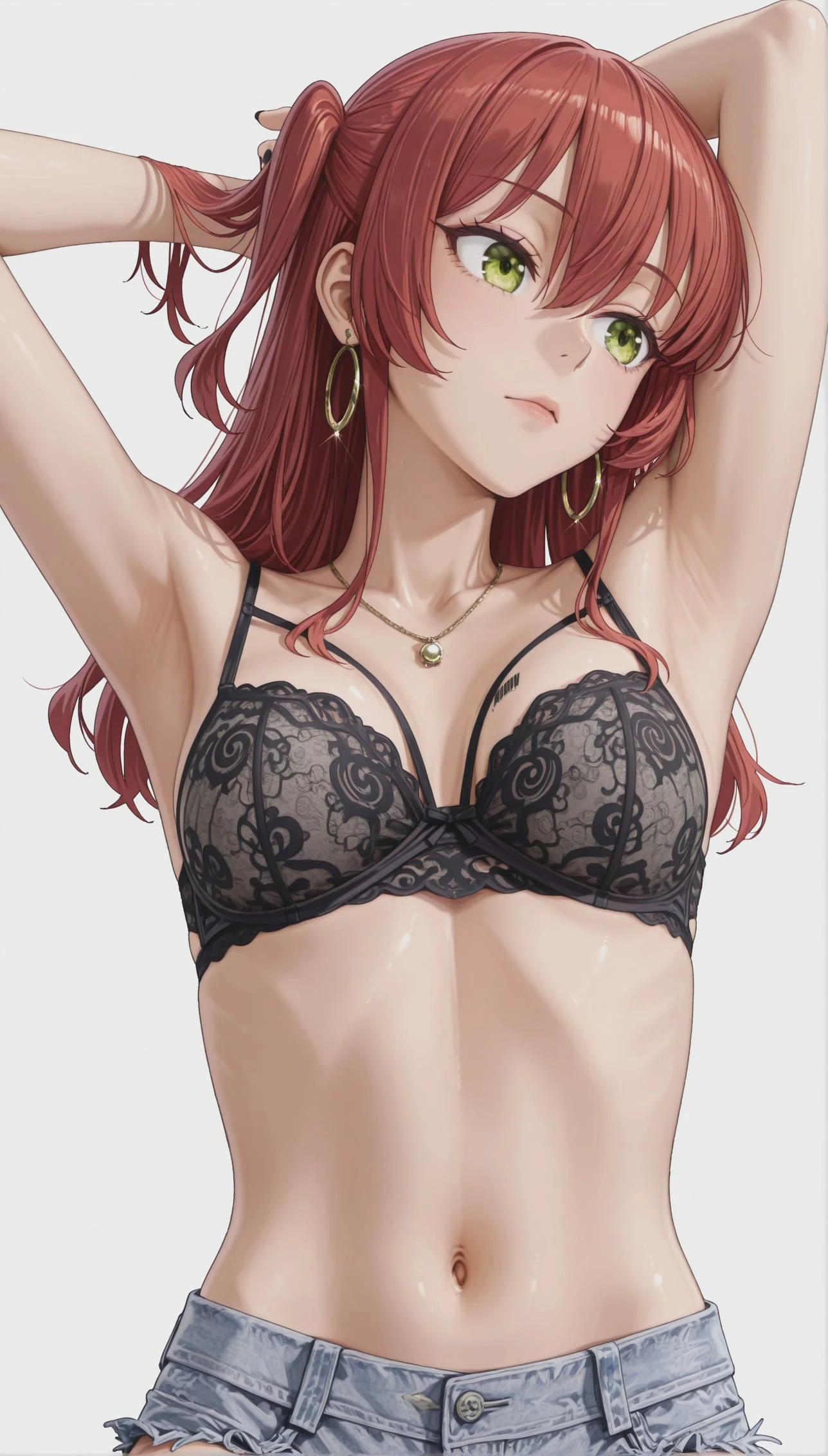 red lips, eyeshadow, hoop earrings, necklace, chest_tattoo, barcode_tattoo, black nails,
