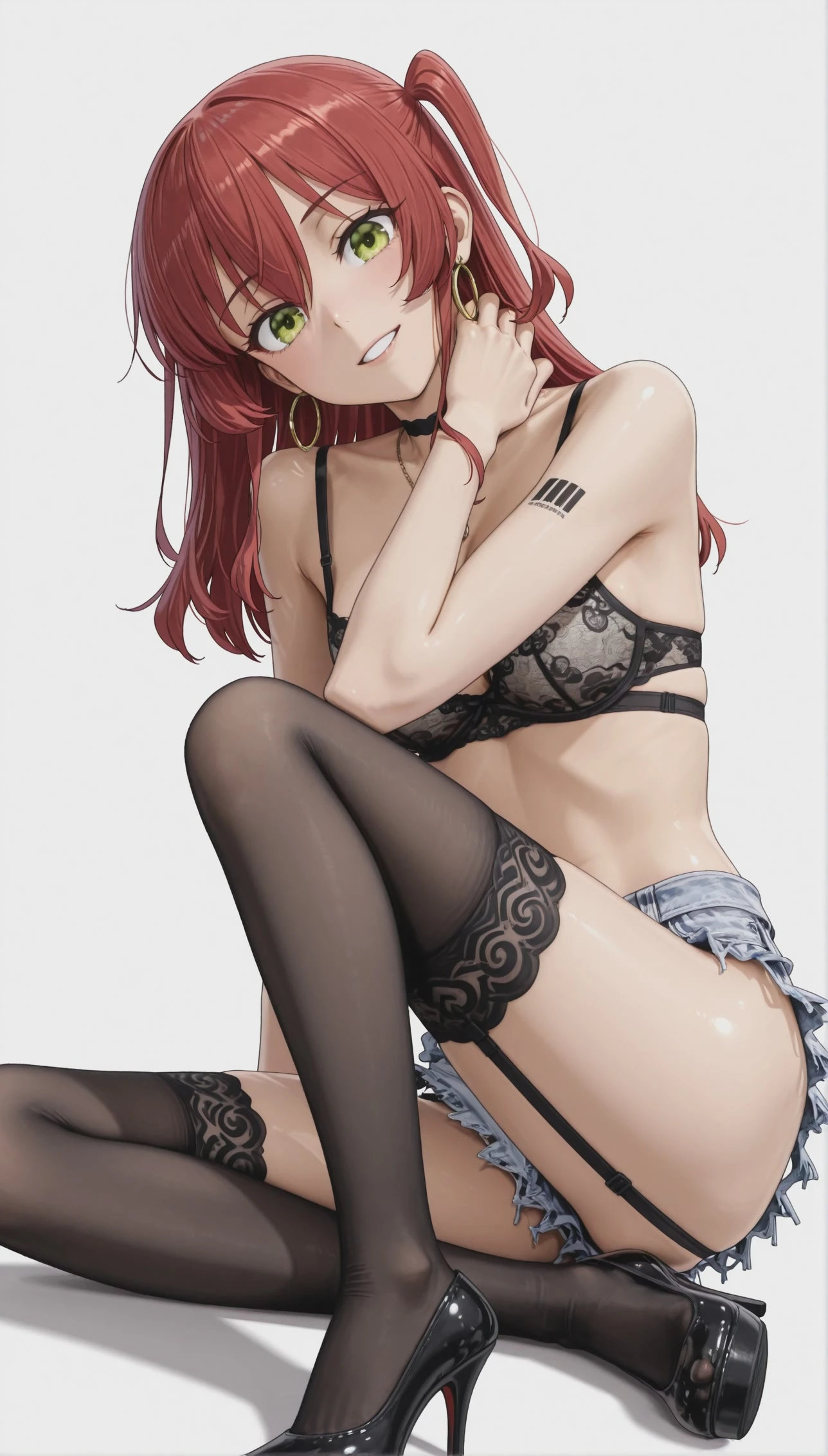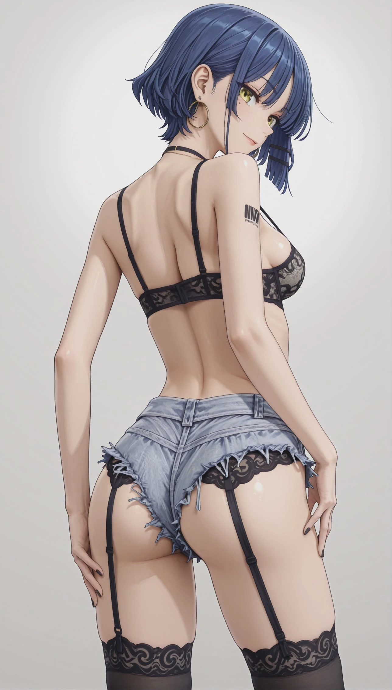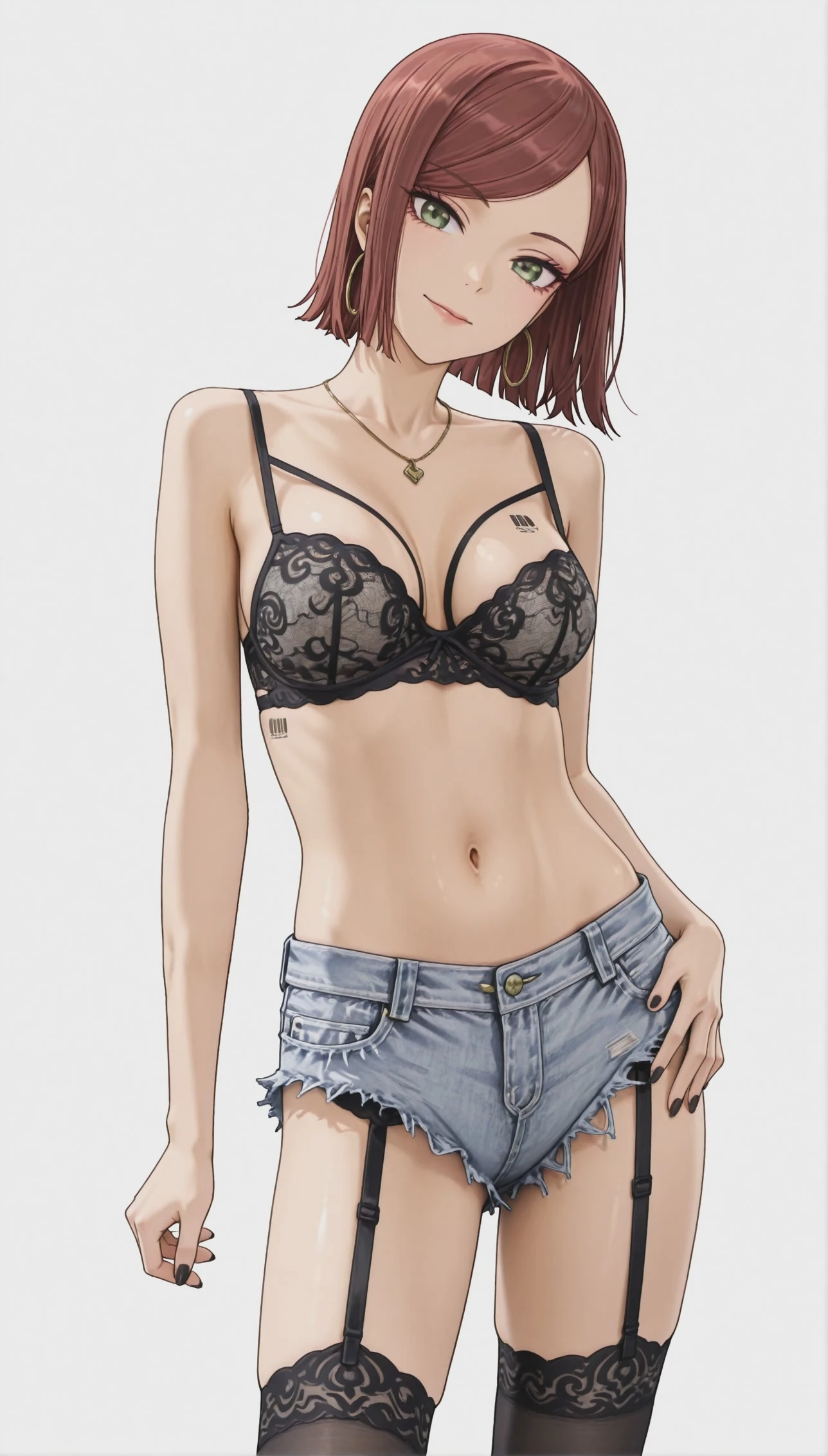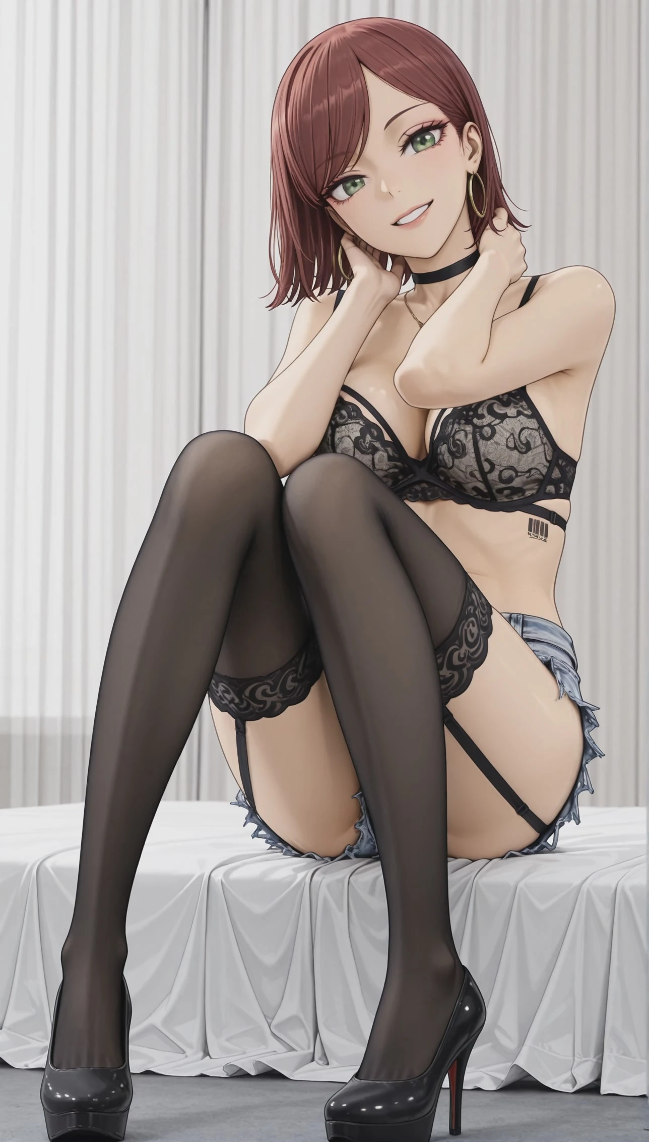 denim shorts, short shorts, garter belt, black thighhighs, black stockings, lace-trimmed legwear, garter straps, high_heels,