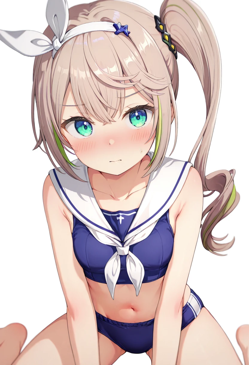 1girl ,aqua eyes ,bare arms ,bare legs ,bare shoulders ,blue buruma ,blue tank top ,brown hair ,crop top ,midriff ,navel ,sailor bikini ,shakry\(mod3\) ,side ponytail ,sidelocks ,simple background ,solo ,stomach ,streaked hair ,swimsuit ,white hairband ,white neckerchief