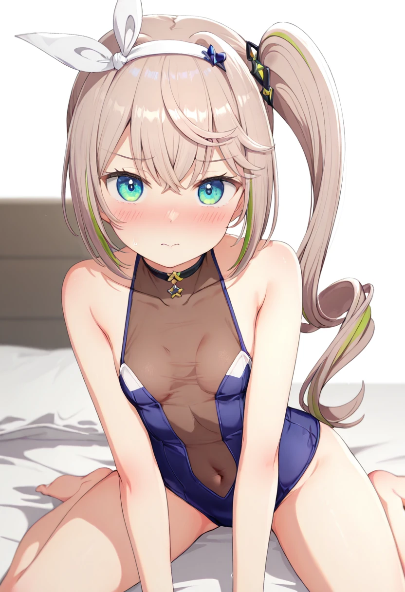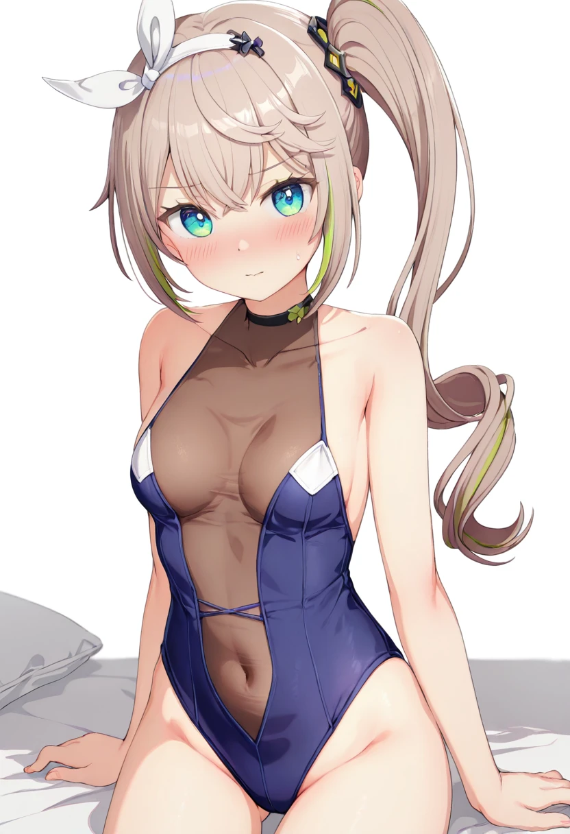 1girl ,aqua eyes ,bare arms ,bare shoulders ,blue one-piece swimsuit ,bodystocking ,brown hair ,collarbone ,covered navel ,one-piece swimsuit ,see-through ,shakry\(mod1\) ,side ponytail ,sidelocks ,simple background ,solo ,streaked hair ,swimsuit ,white background ,white hairband ,white ribbon