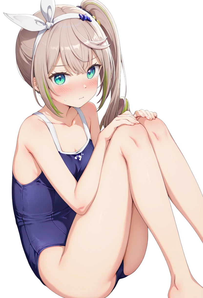 1girl ,aqua eyes ,bare arms ,bare legs ,bare shoulders ,blue one-piece swimsuit ,brown hair ,one-piece swimsuit ,shakry\(mod2\) ,side ponytail ,sidelocks ,simple background ,solo ,streaked hair ,swimsuit ,white background ,white hairband ,long hair