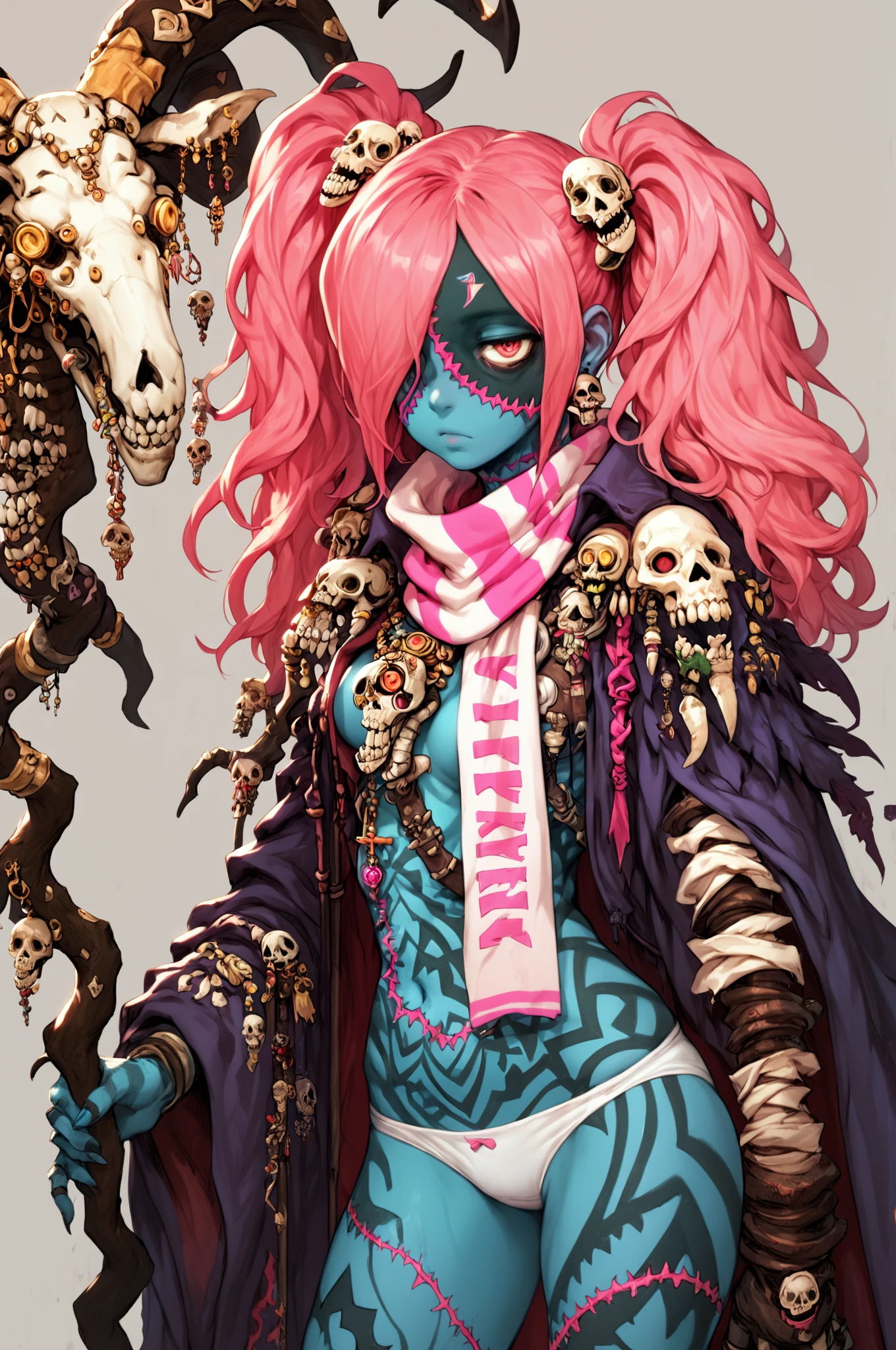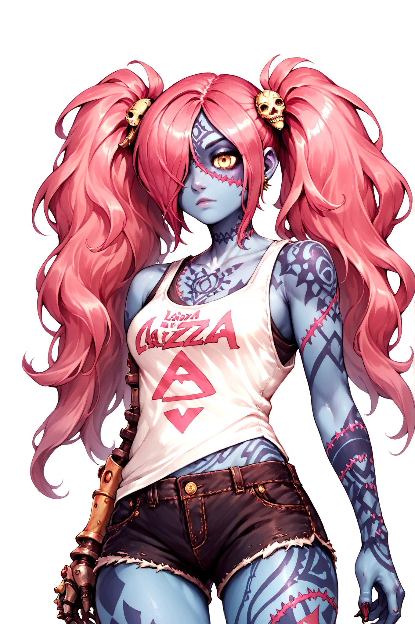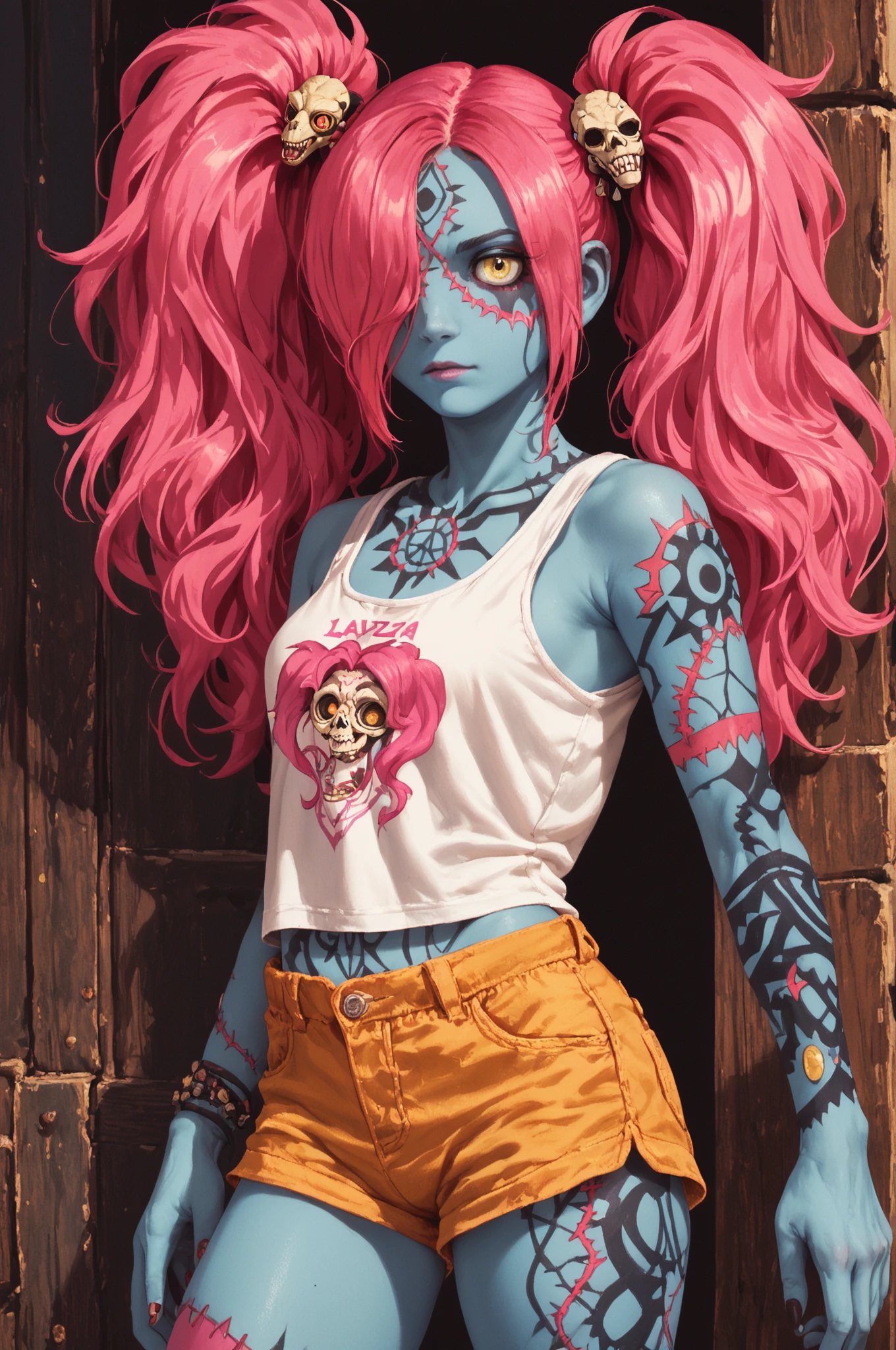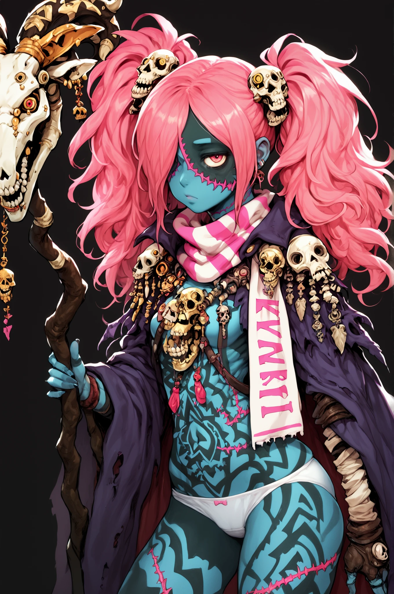 Basic Prompt: <lora:LadyZozoV2:1> ladyzozo, (blue_skin:1.2), scarf, pink_hair, twintails, skull_hair_ornament, yellow_eyes, hair_over_one_eye, panties