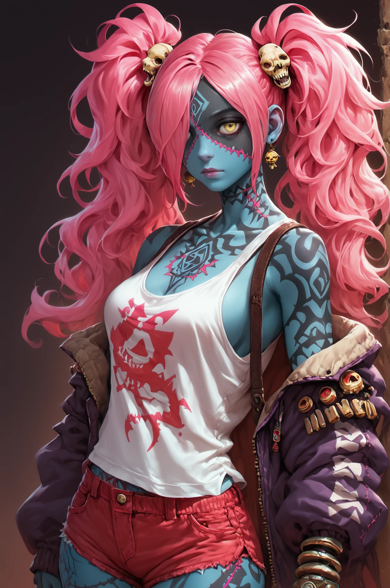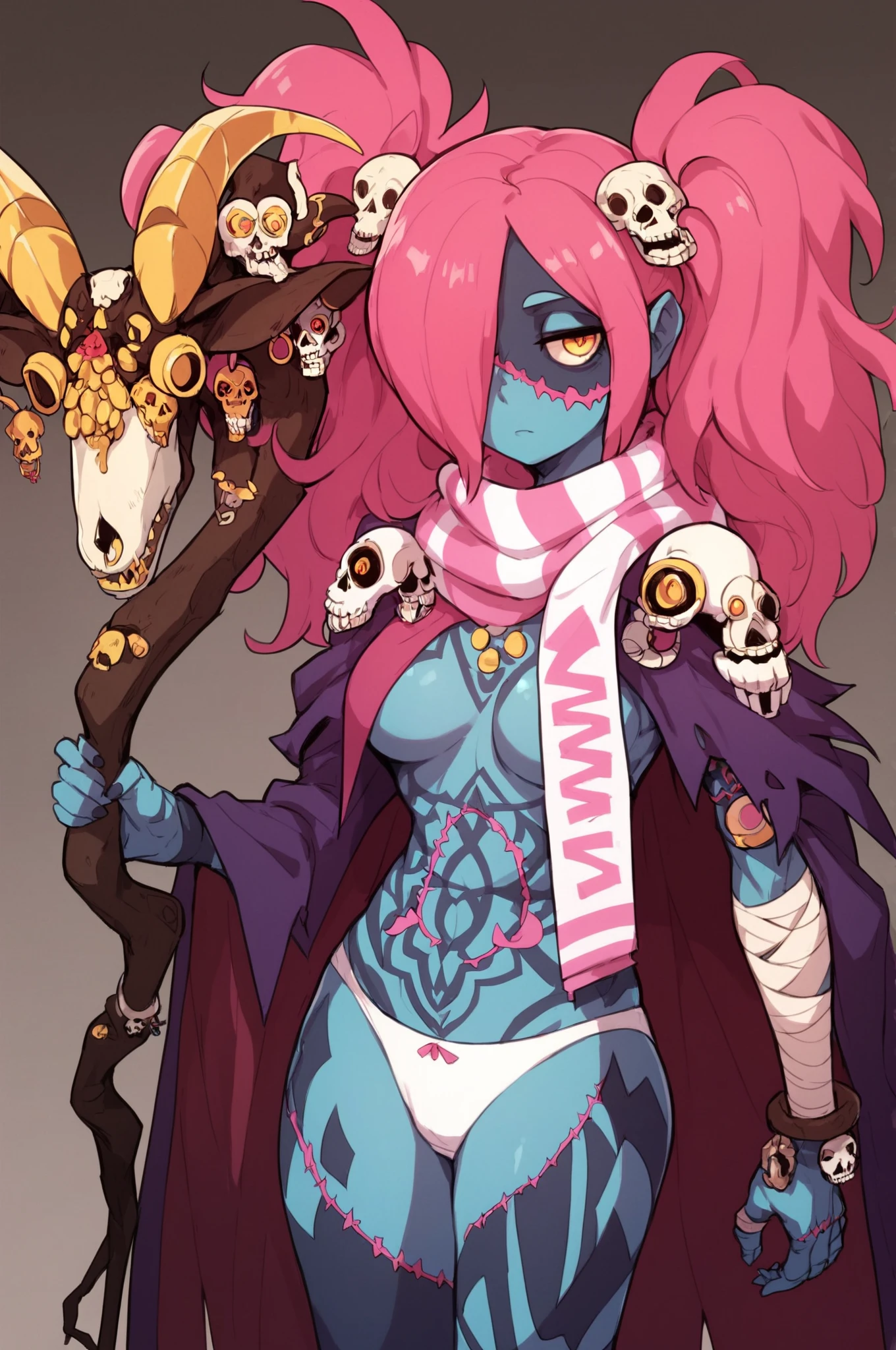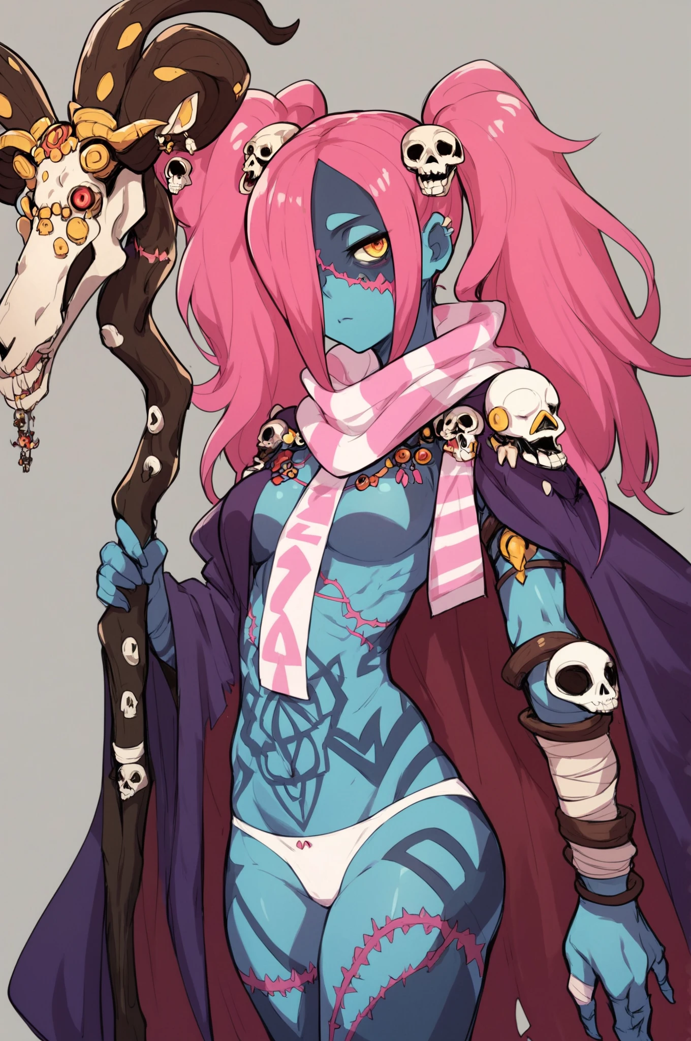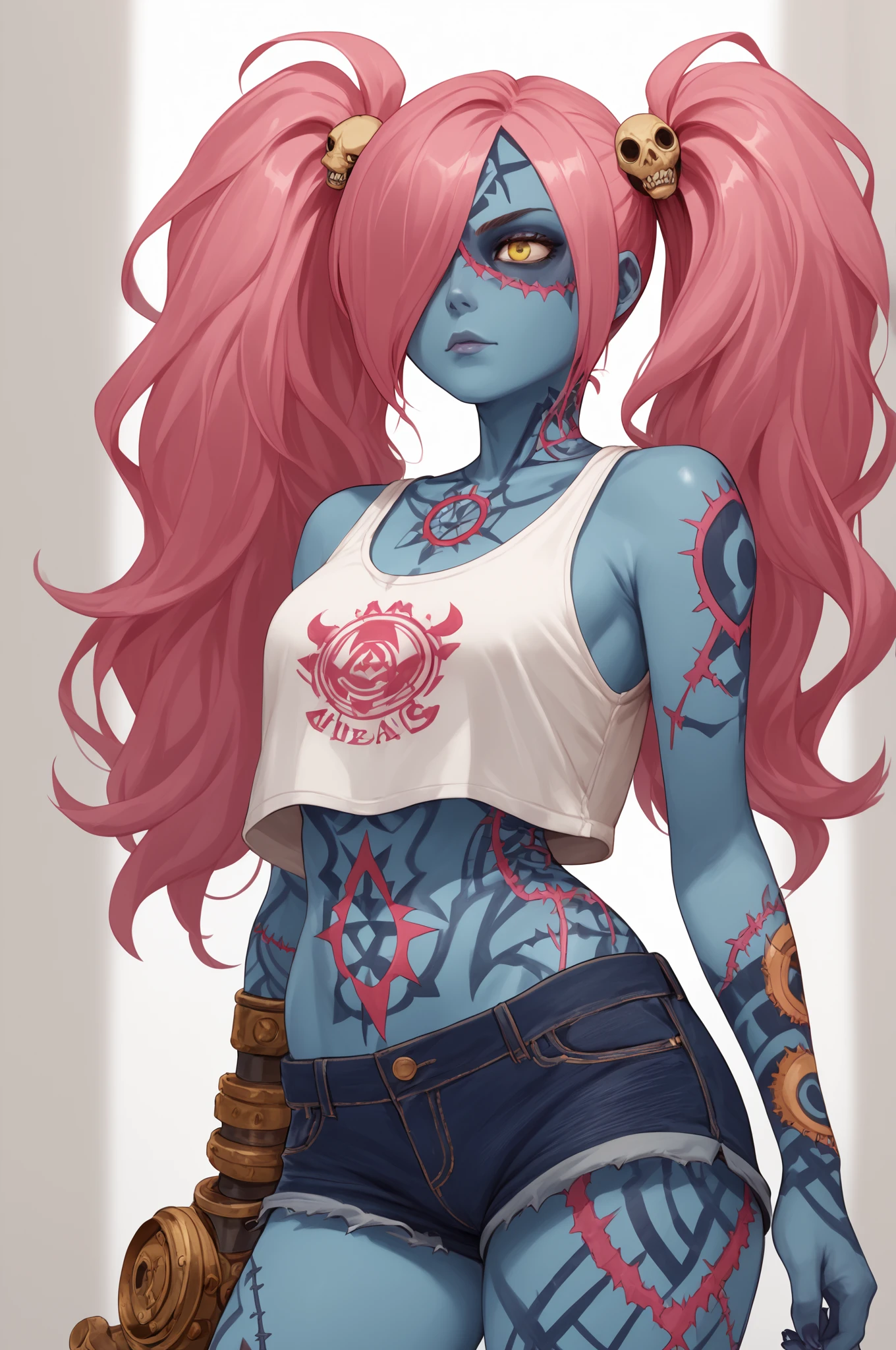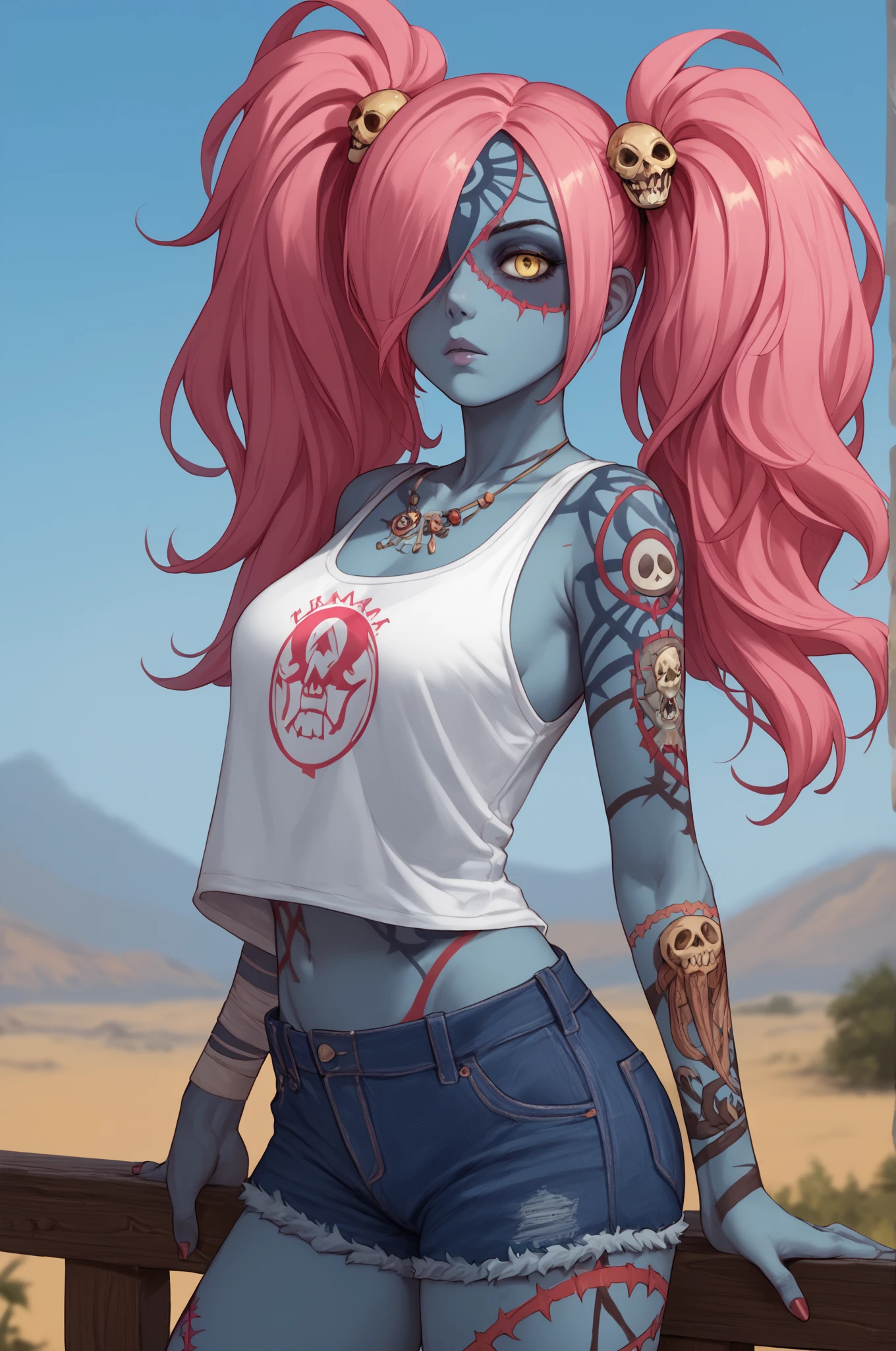 Basic Prompt: <lora:LadyZozoV2:1> ladyzozo, (blue_skin:1.2), scarf, pink_hair, twintails, skull_hair_ornament, yellow_eyes, hair_over_one_eye, panties