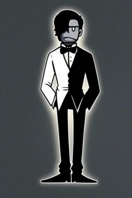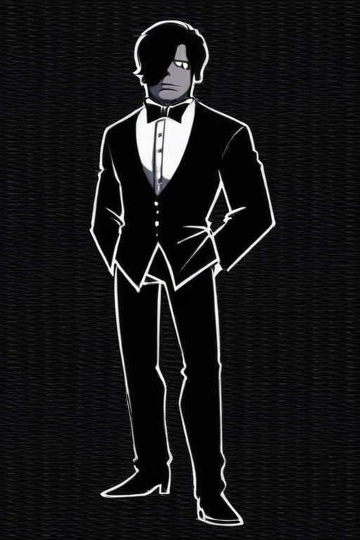Cesar Torres, 1boy, solo, black hair, grey skin, white eyes, black suit, white shirt, black bowtie, black pants, black shoes, hair over one eye, black background