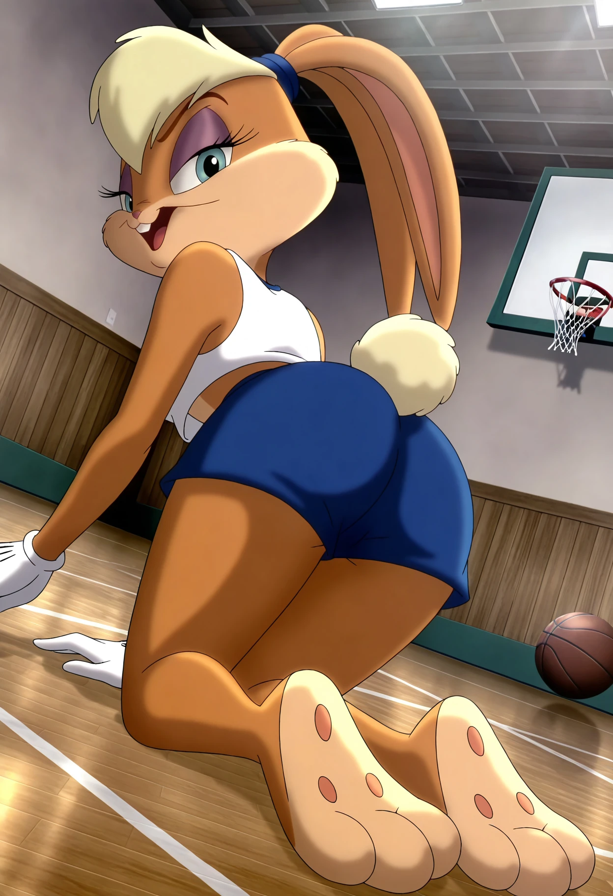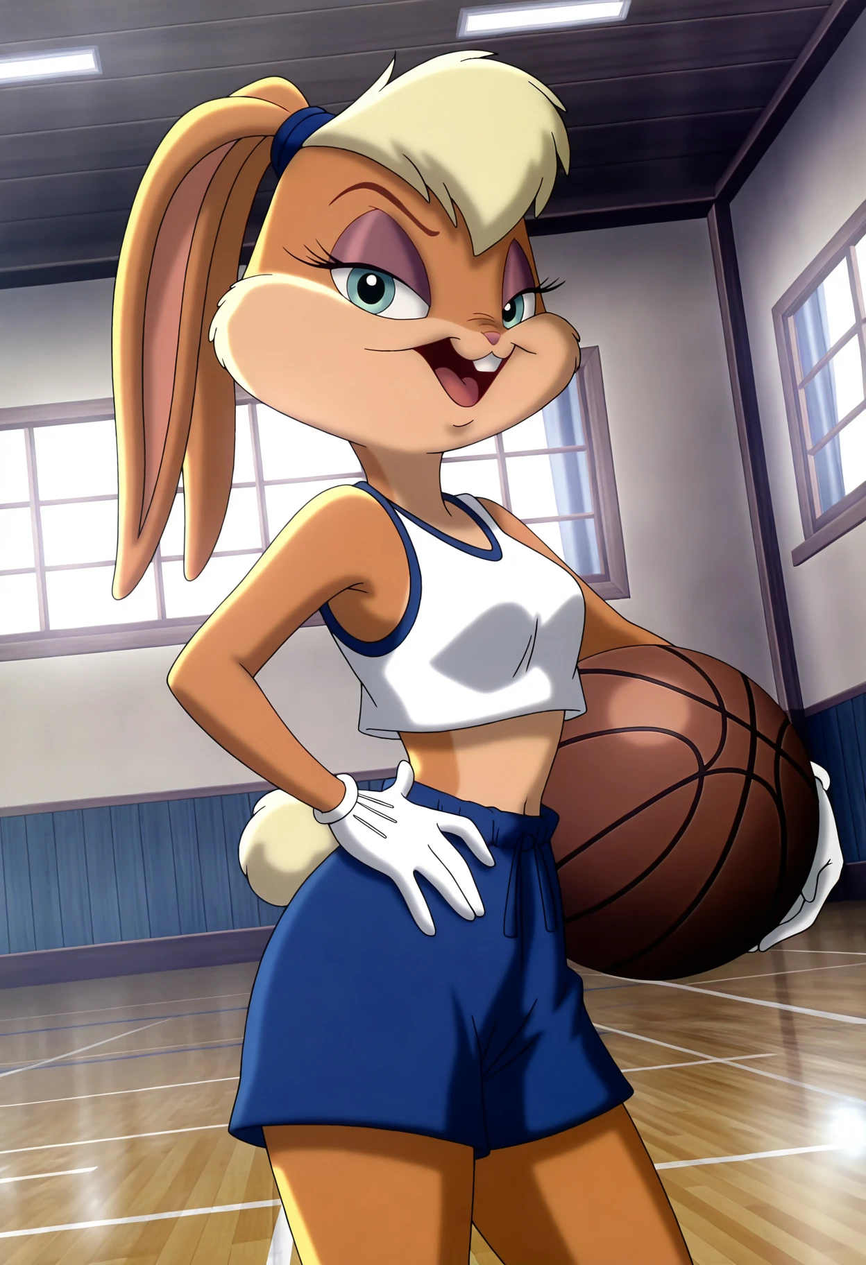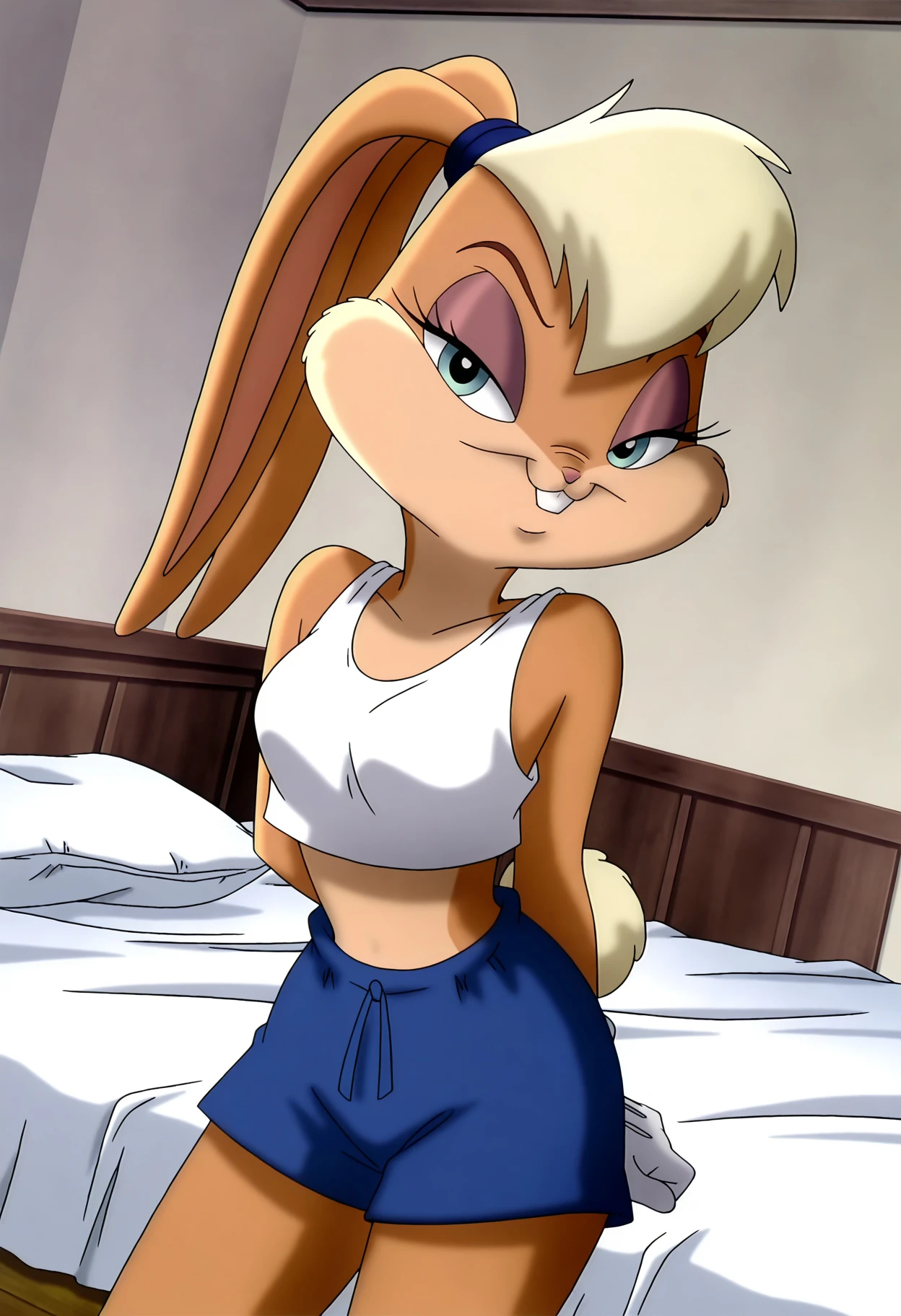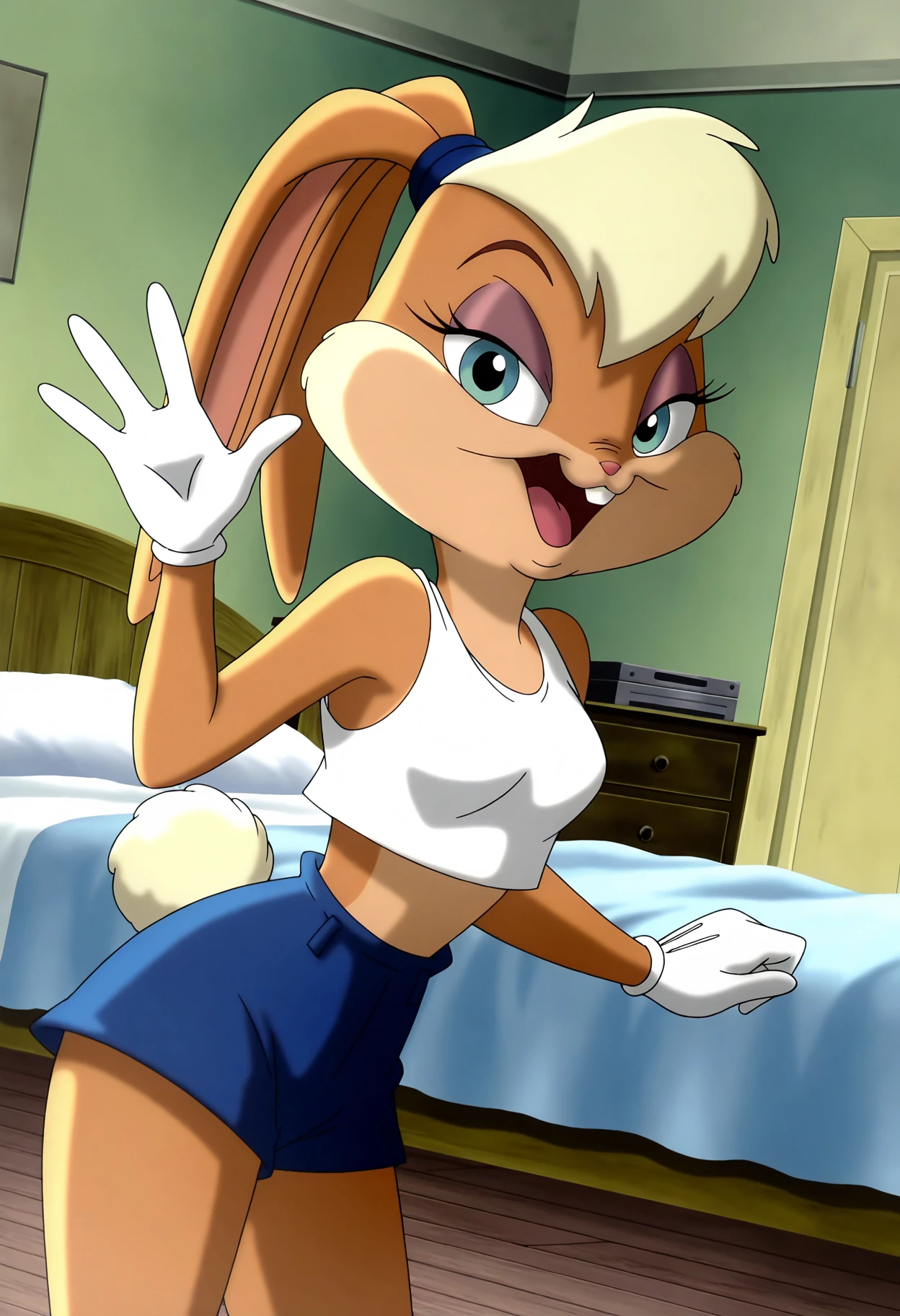 lola bunny, anthro, furry, furry female, rabbit girl, rabbit ears, rabbit tail, blue eyes, buck teeth, hair tie, white gloves, crop top, white tank top, midriff, shorts, blue shorts