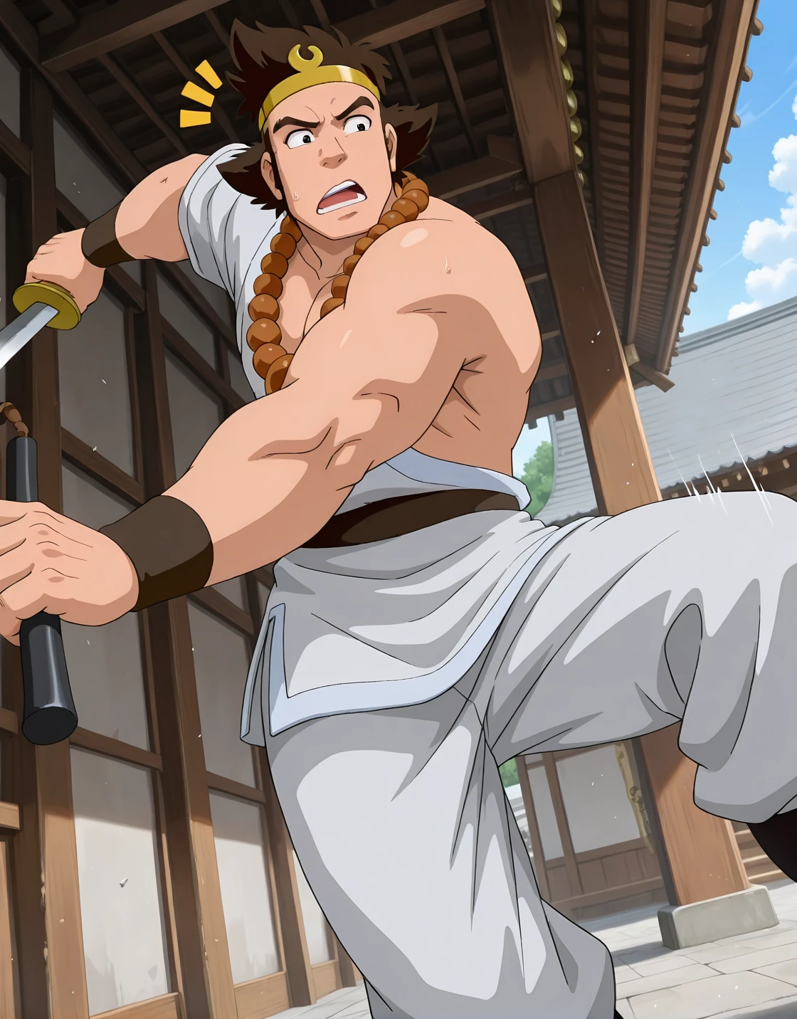 沙僧,brown hair,jewelry,sideburns,bead necklace,muscular,single bare shoulder,large pectorals,white pants,