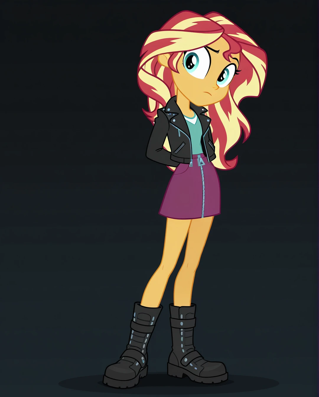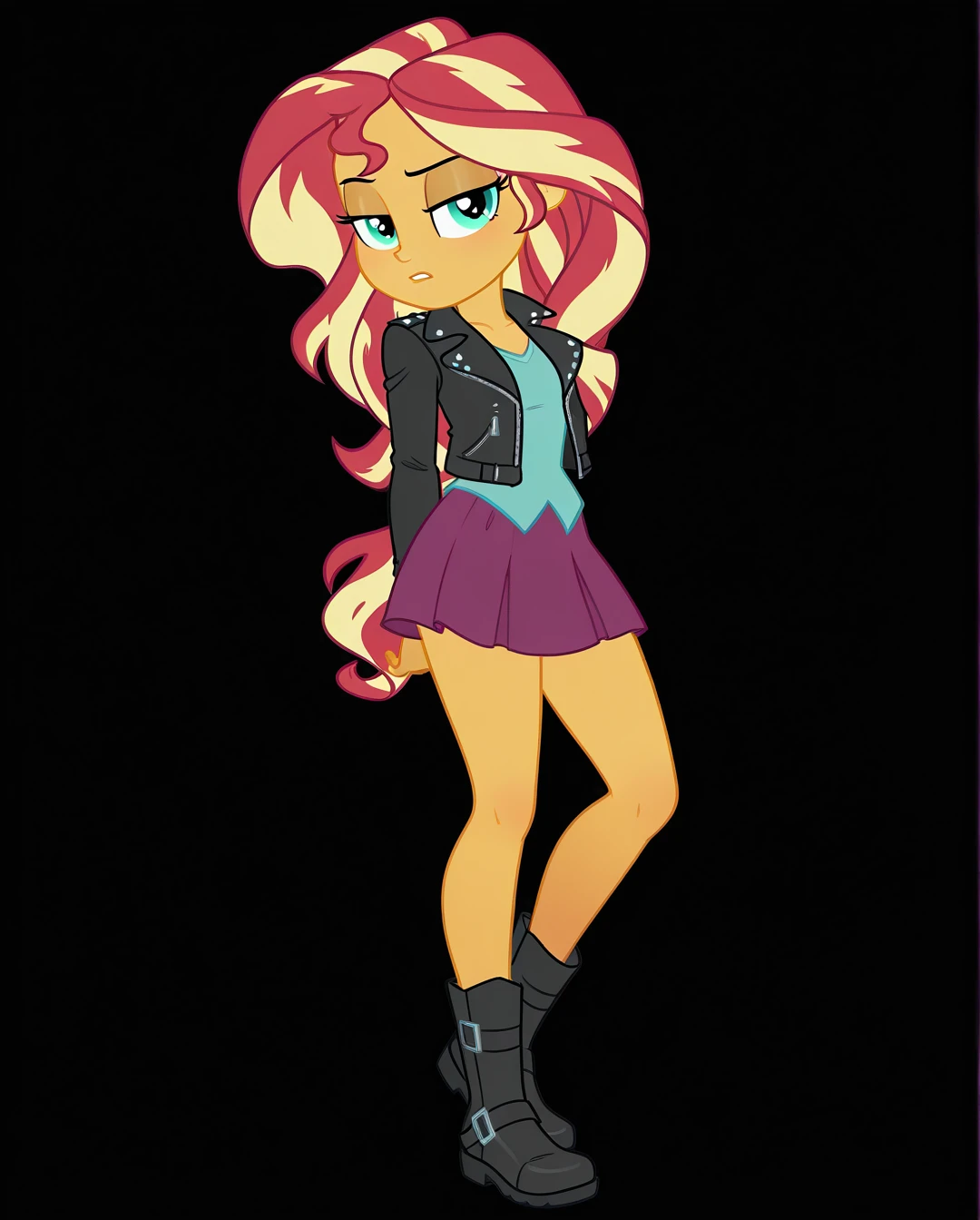 sunset_shimmer_(human), purple skirt, blonde hair, boots, long hair, black footwear, orange skin, multicolored hair, vest, shirt, zipper, leather jacket,