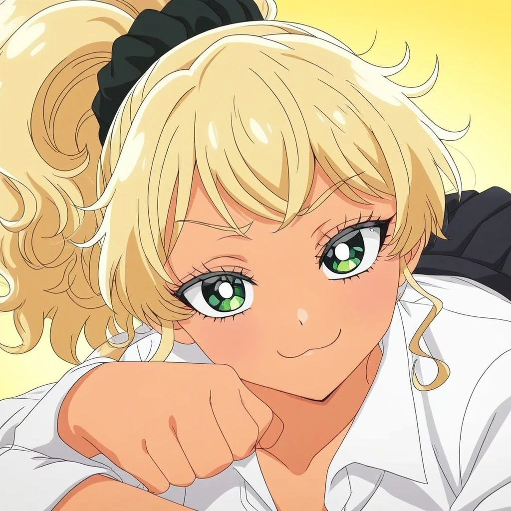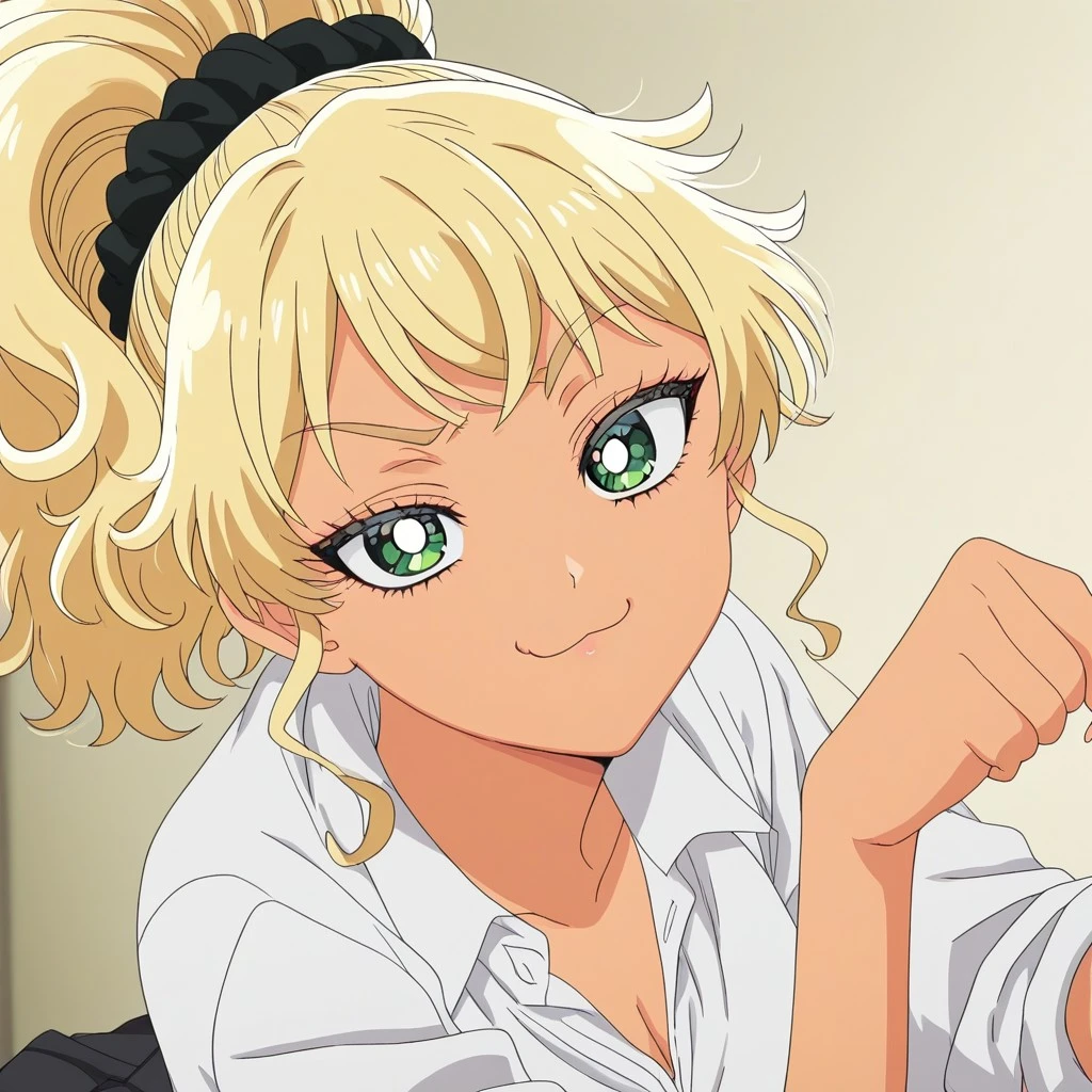 ijichikotoko, masterpiece, best quality, amazing quality,, cowboy shot, solo, looking at viewer, kotoko ijichi, blonde hair, hair ornament, green eyes, ponytail, scrunchie, tan, hair scrunchie, gyaru, black scrunchie, kogal, bright pupils, medium breasts, anime screencap, shirt, skirt, jewelry, pleated skirt, collared shirt, black skirt