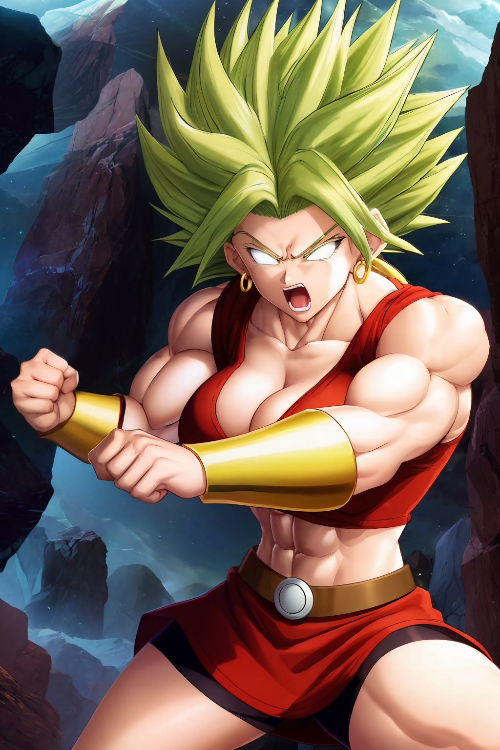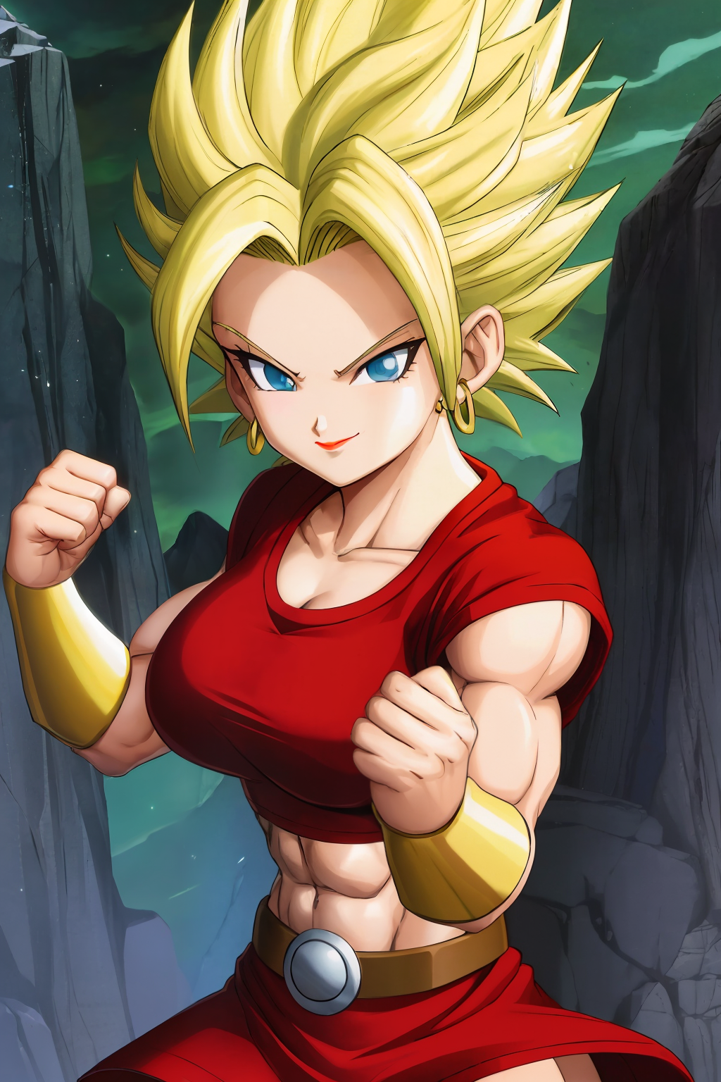 red shirt, red miniskirt, grey short tights, golden bracers, golden boots, golden earrings