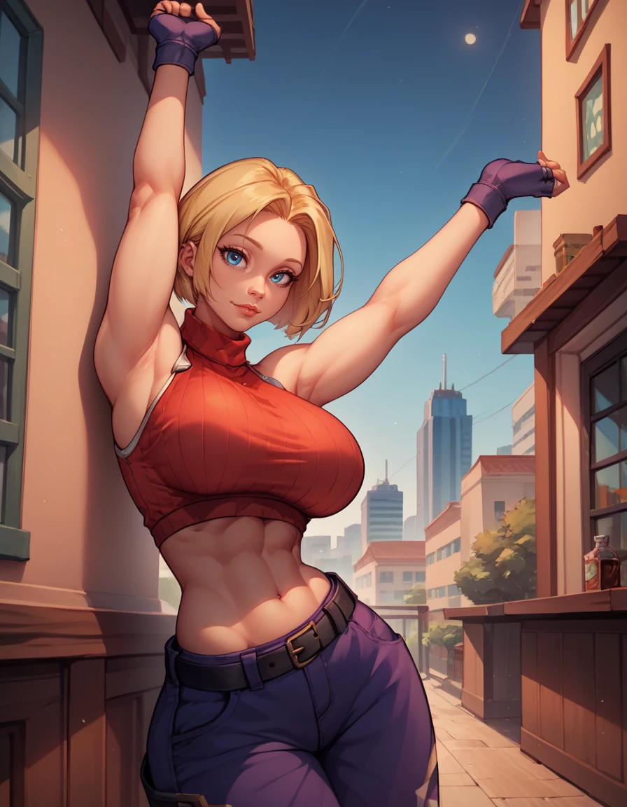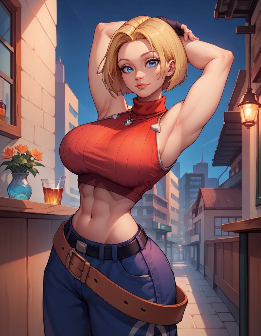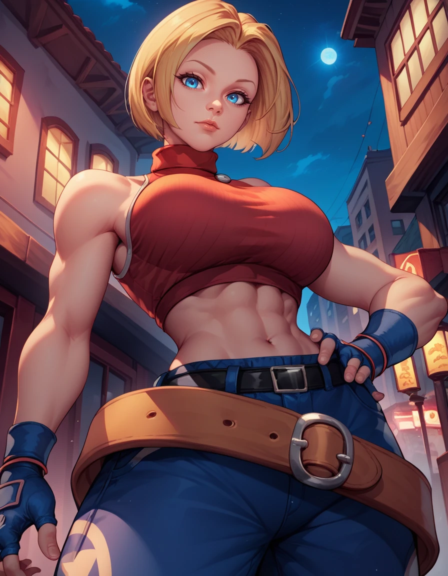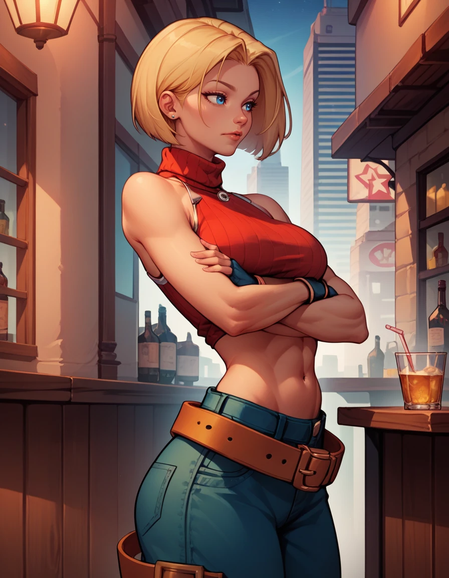 sleeveless turtleneck, sleeveless, baggy pants, loose belt, crop top, blue_Pants, fingerless gloves, sneakers,