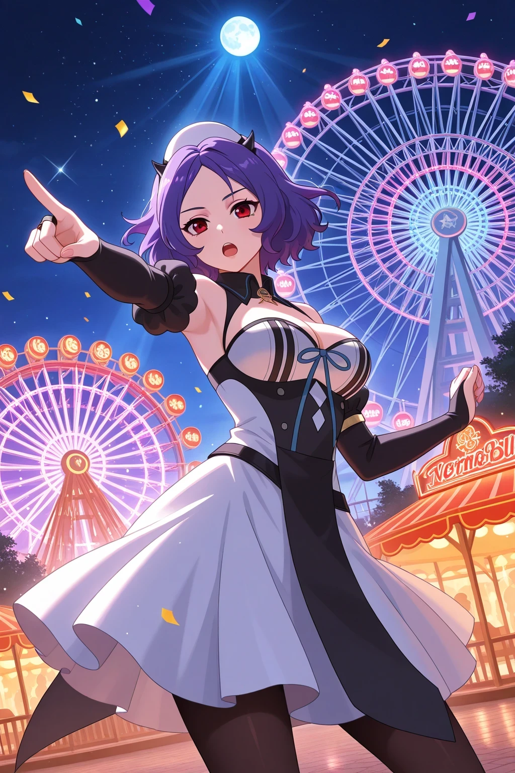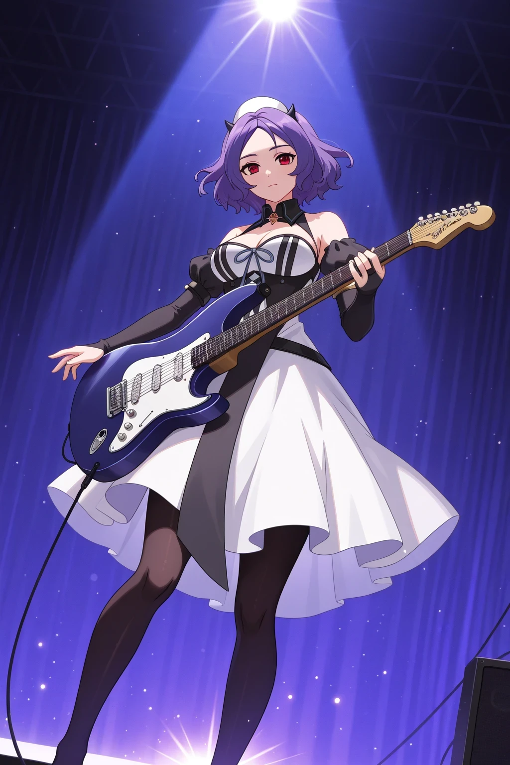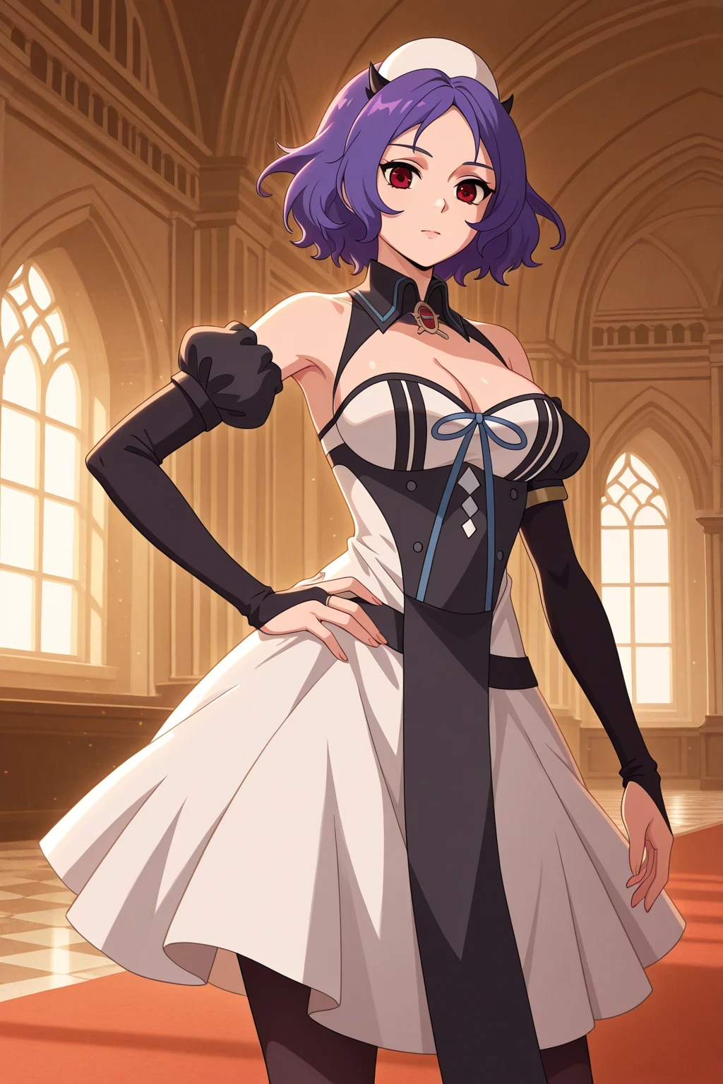 1girl, solo, onseraphchessbelle, red eyes, purple hair, short hair, cap, black horns