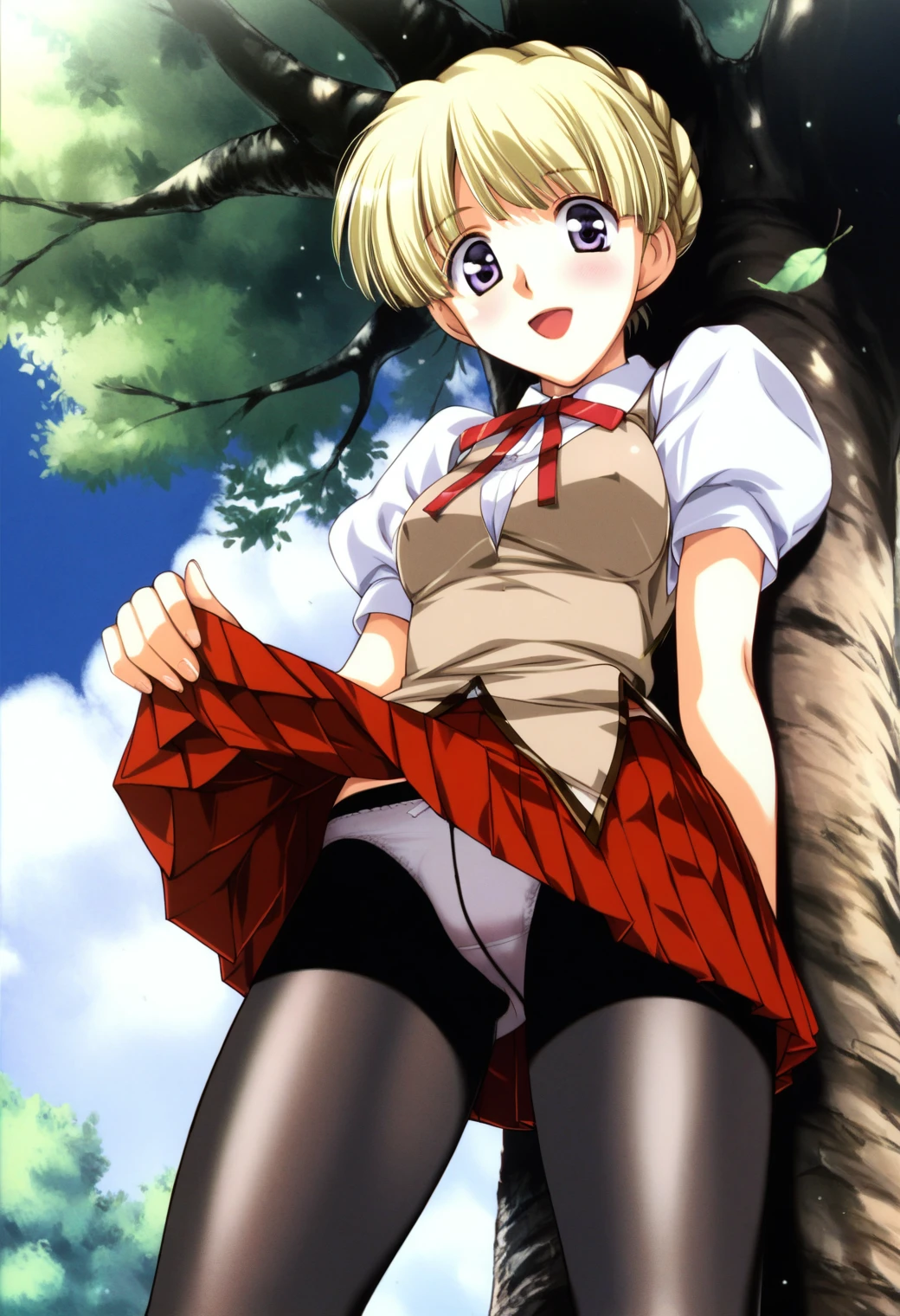 sadiemus, solo, purple eyes, blonde hair, short hair, braided bun, french braid, single hair bun