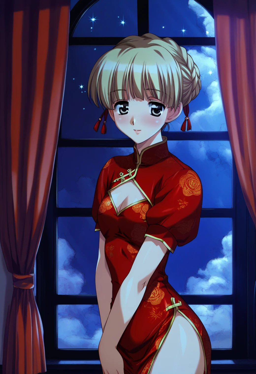 sadiemus, solo, grey eyes, blonde hair, short hair, braided bun, french braid, single hair bun