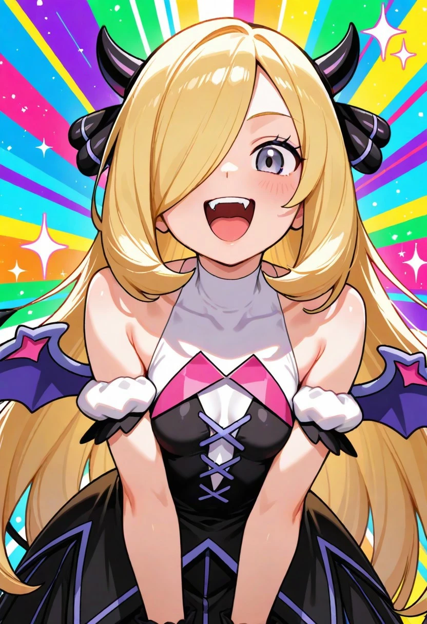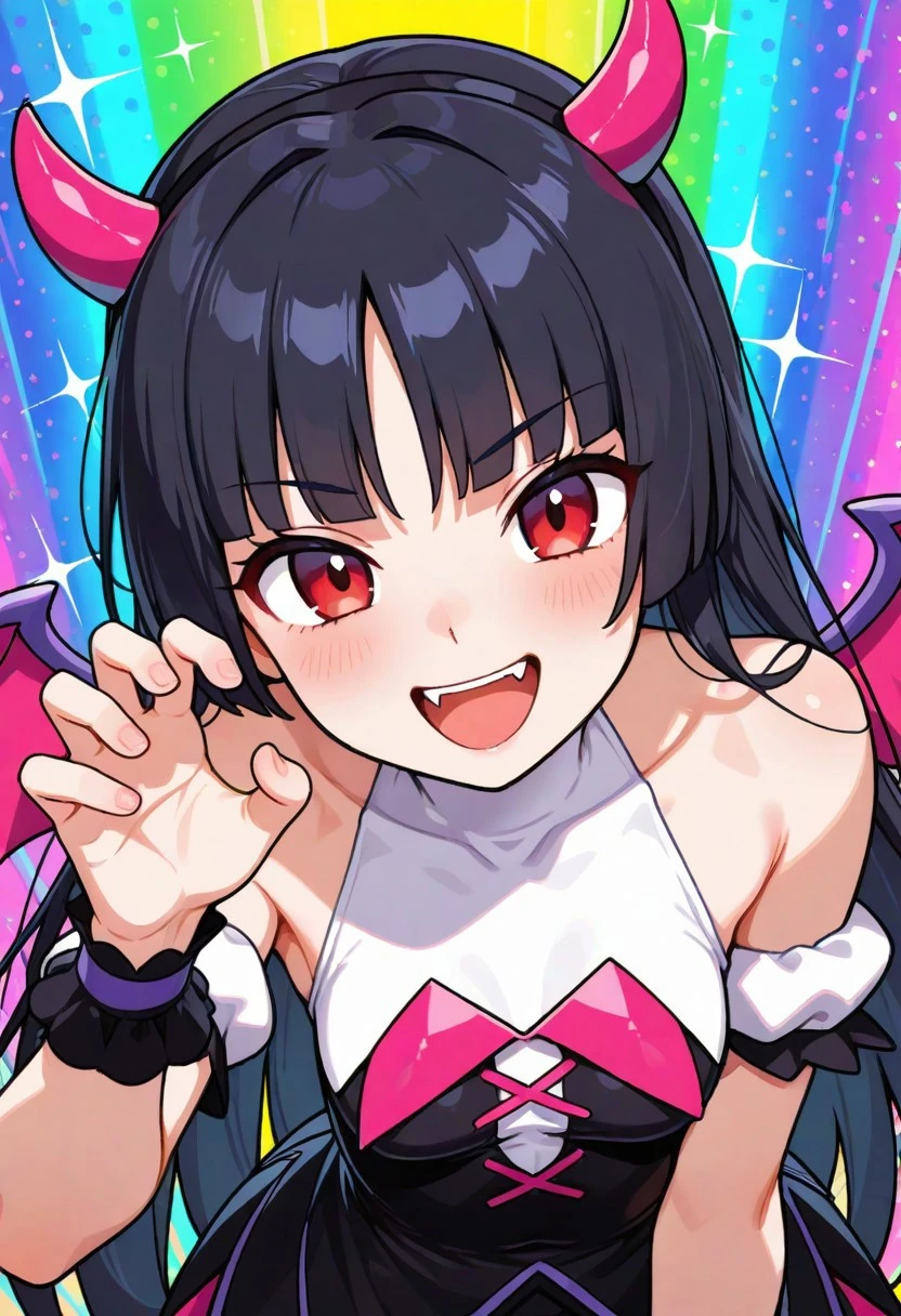 fake horns, halter dress, multicolored dress, white halterneck, bare shoulders, detached sleeves, short sleeves, wrist cuffs, fake wings, fake tail, black socks, shoes, mary janes, pink footwear