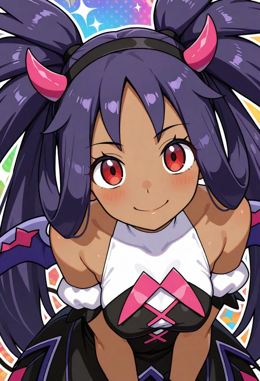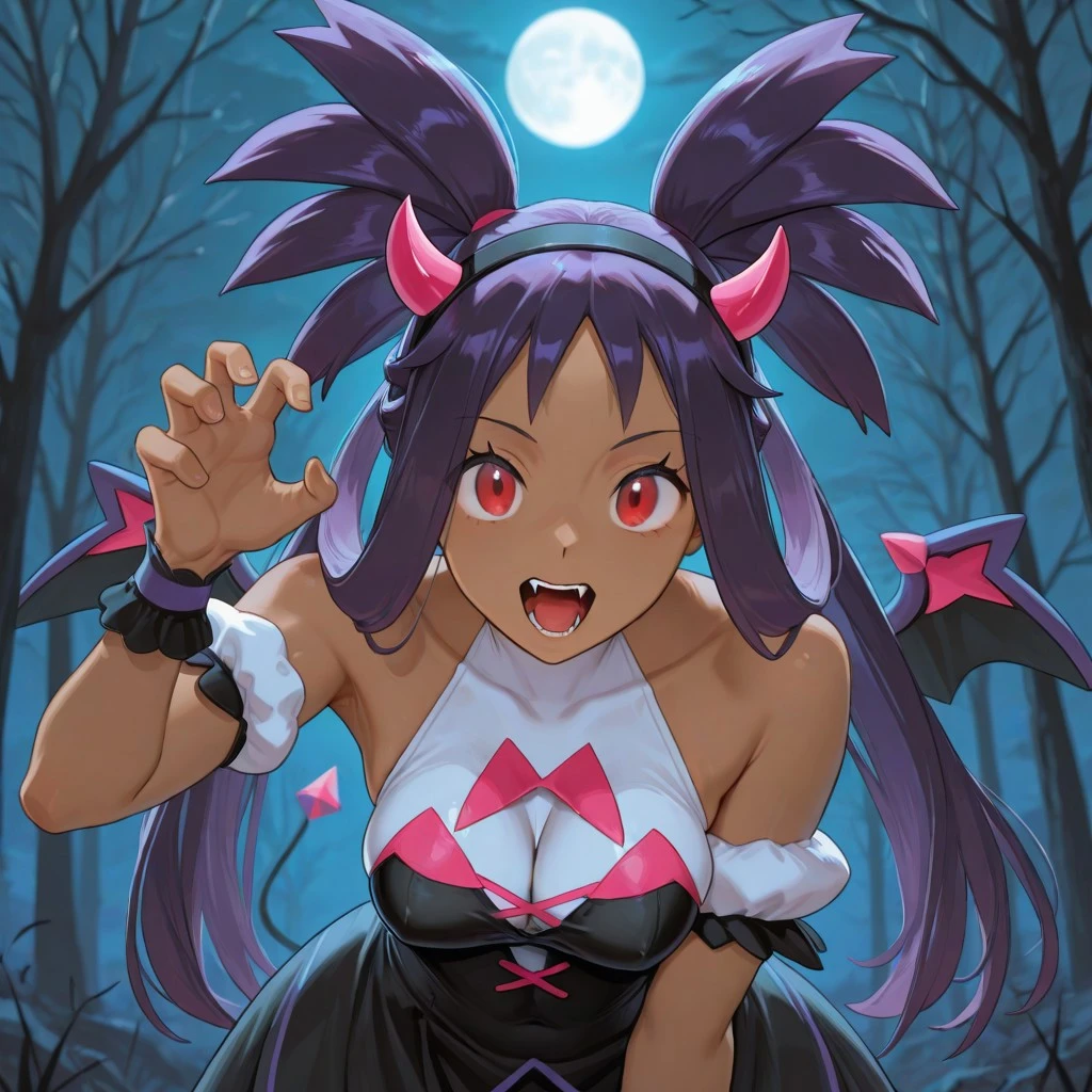 falliris, aged up, iris \(pokemon\), red eyes, purple hair, long hair, hair rings, twintails, dark-skinned female