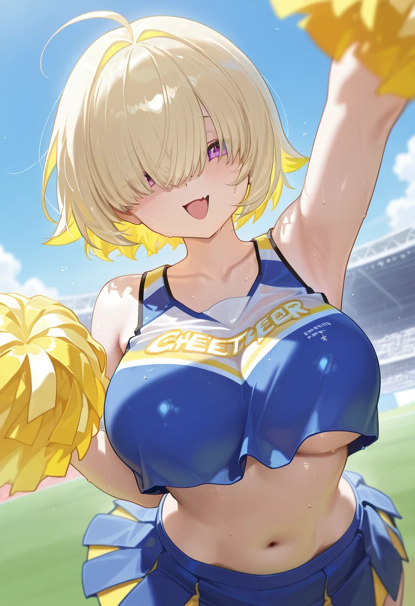 Tags for her look: 1girl, solo, short hair, large breasts, blonde hair, ahoge, multicolored hair, two-tone hair, skin fang, long bangs, hair over eyes, thick thighs,
