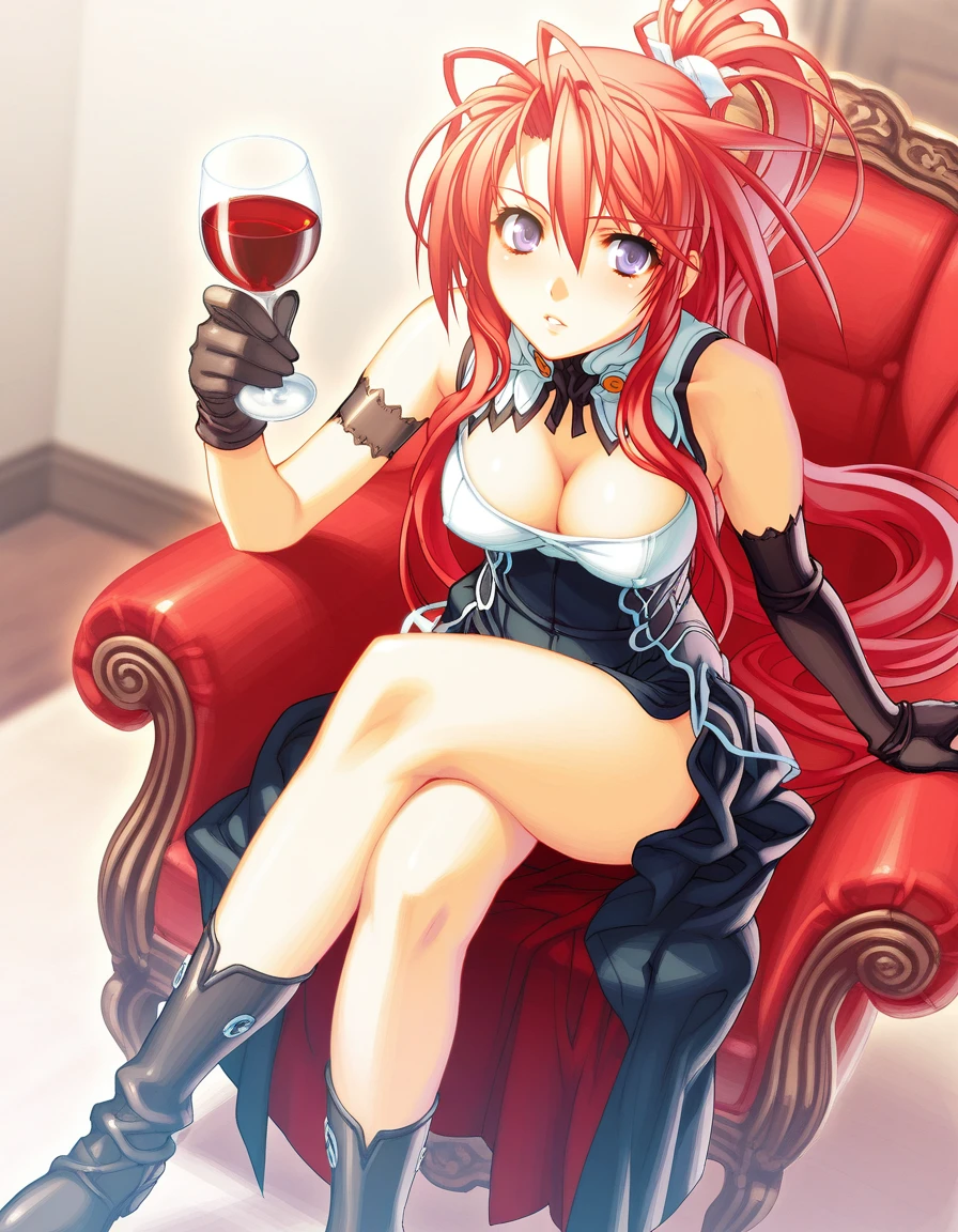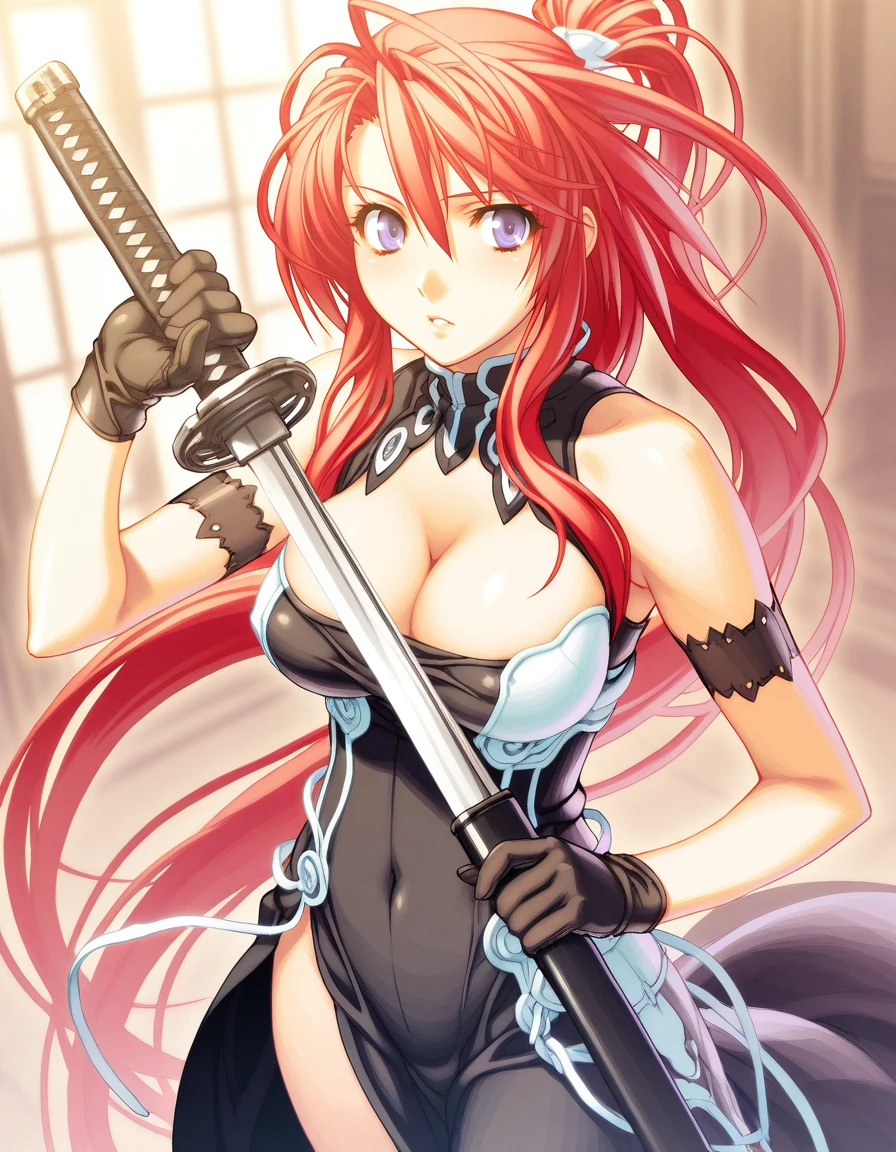 mai_jmyou,mai_Ignisjm,game_cg,very_long_hair,red_hair,purple_eyes,ponytail,large_breasts,black_dress,gloves,black_boots,holding_katana