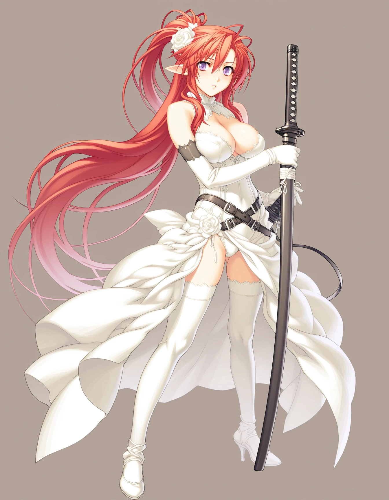 mai_jmyou,mai_Ignisjm,game_cg,very_long_hair,red_hair,purple_eyes,ponytail,large_breasts,black_dress,gloves,black_boots,holding_katanaKaze no Ushiro wo Ayumumono 风のうしろを歩むもの