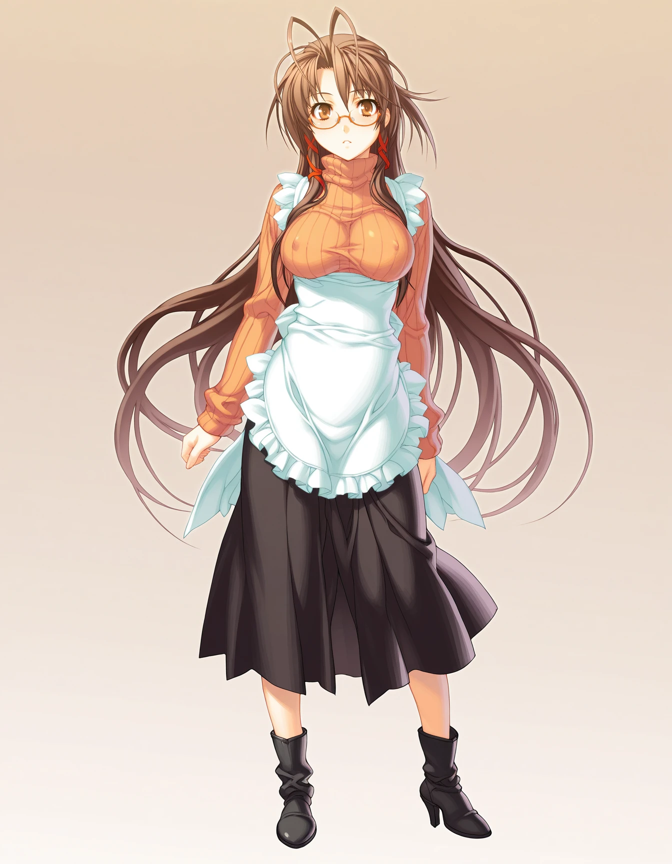 mai_jmyou,mai_hanawajm,game_cg,very_long_hair,antenna_hair,brown_hair,brown_eyes,large_breasts,glasses,ribbon,ribbed_sweater,turtleneck,apron,long_skirt,high_heels_boots