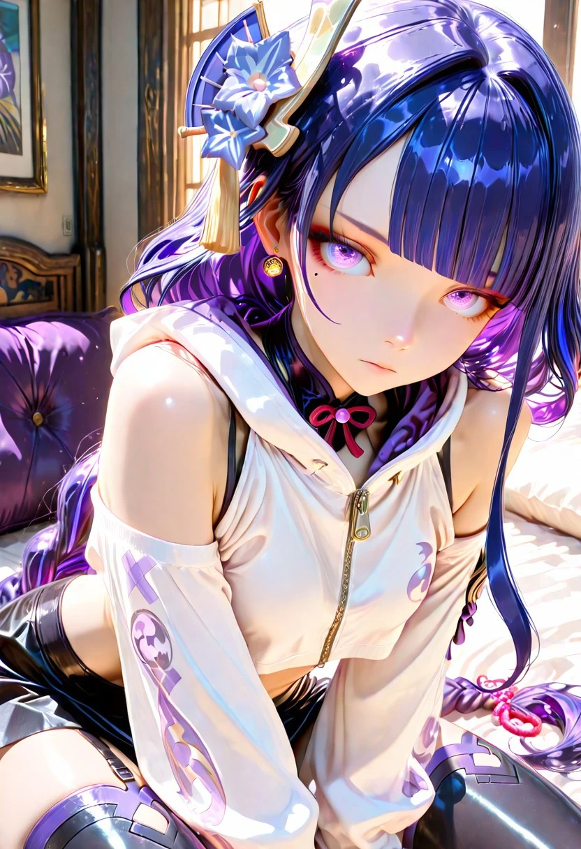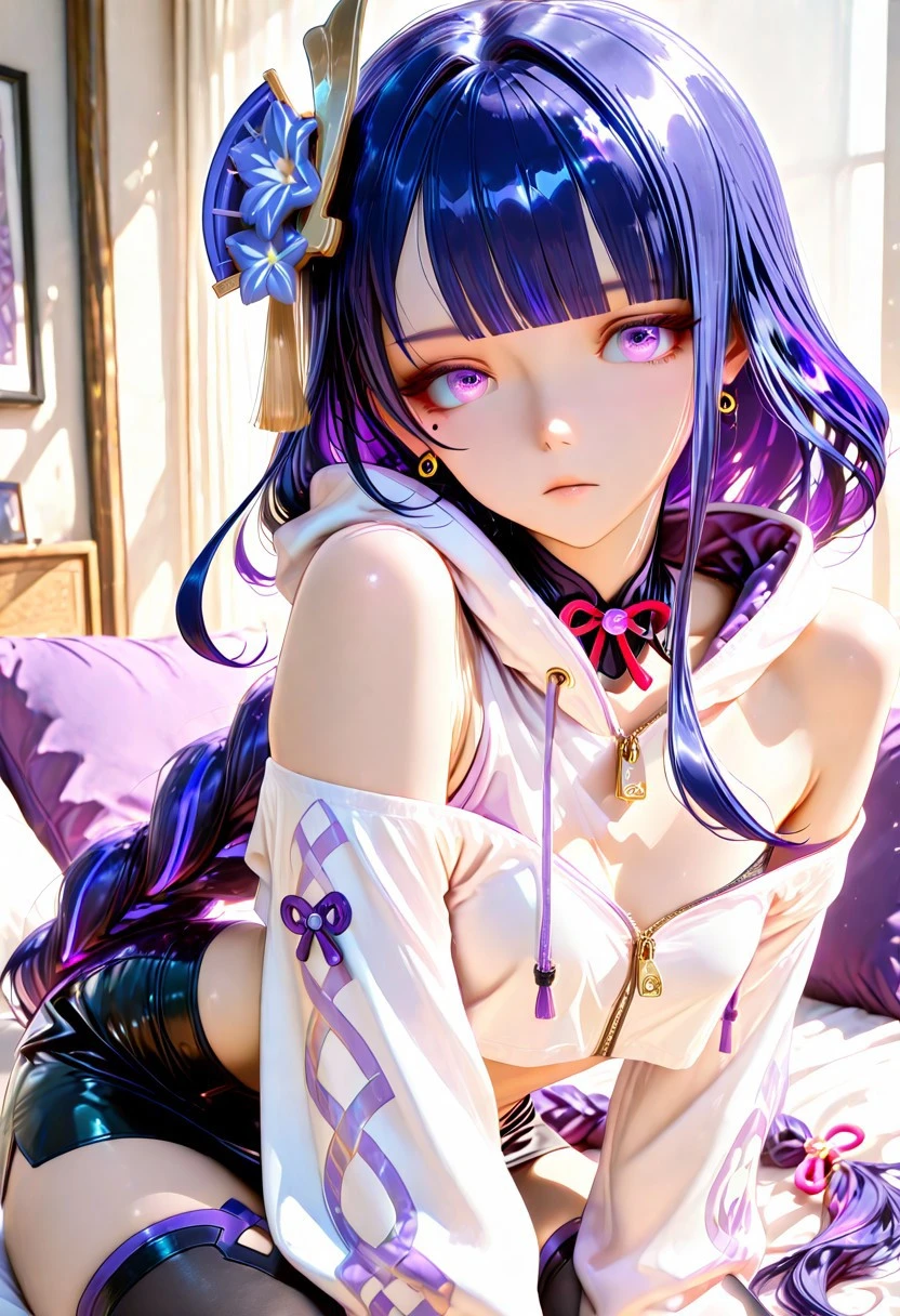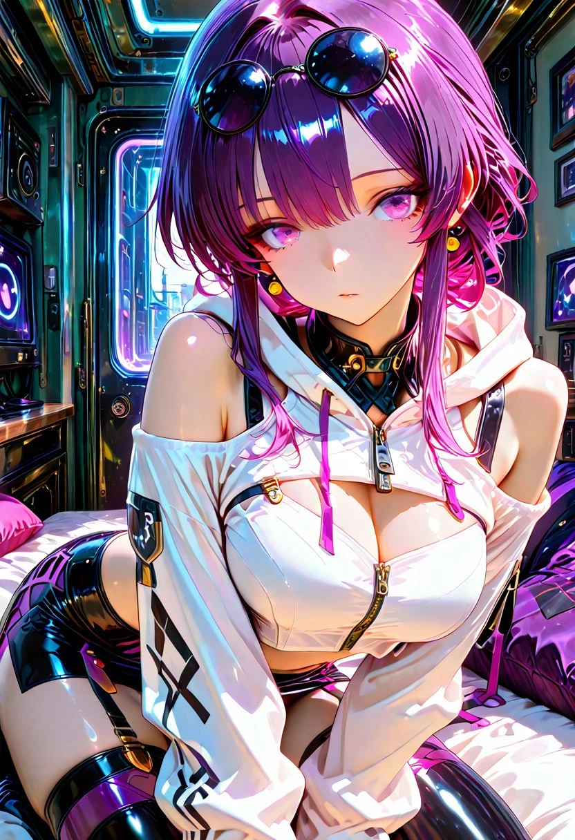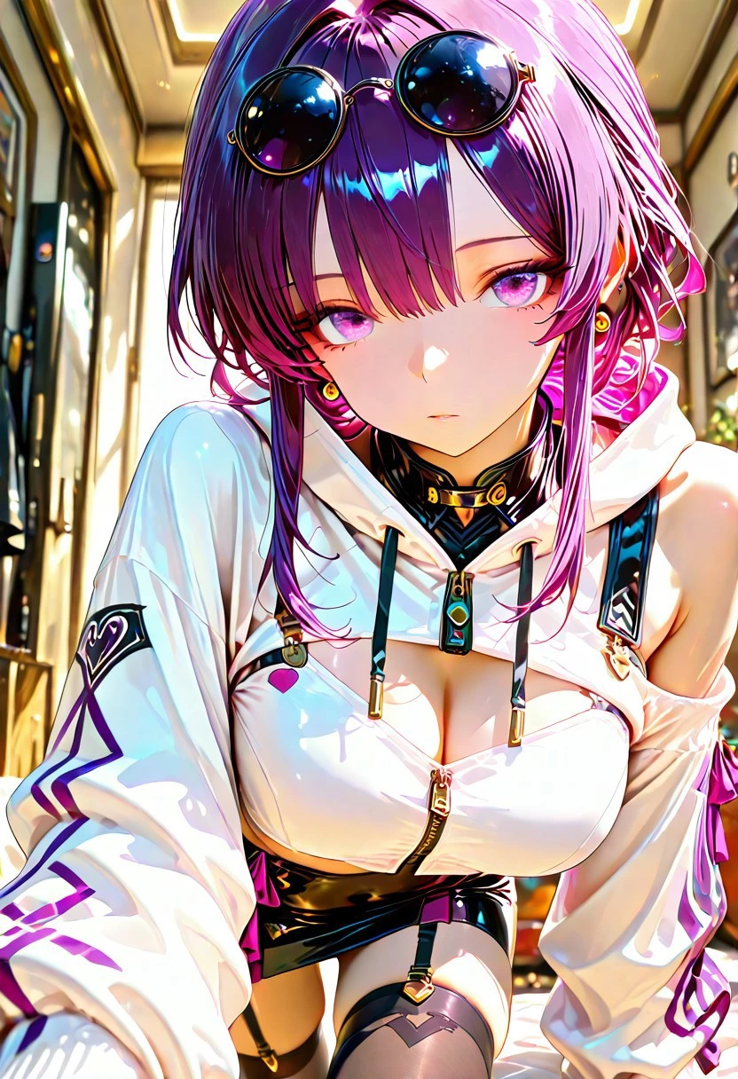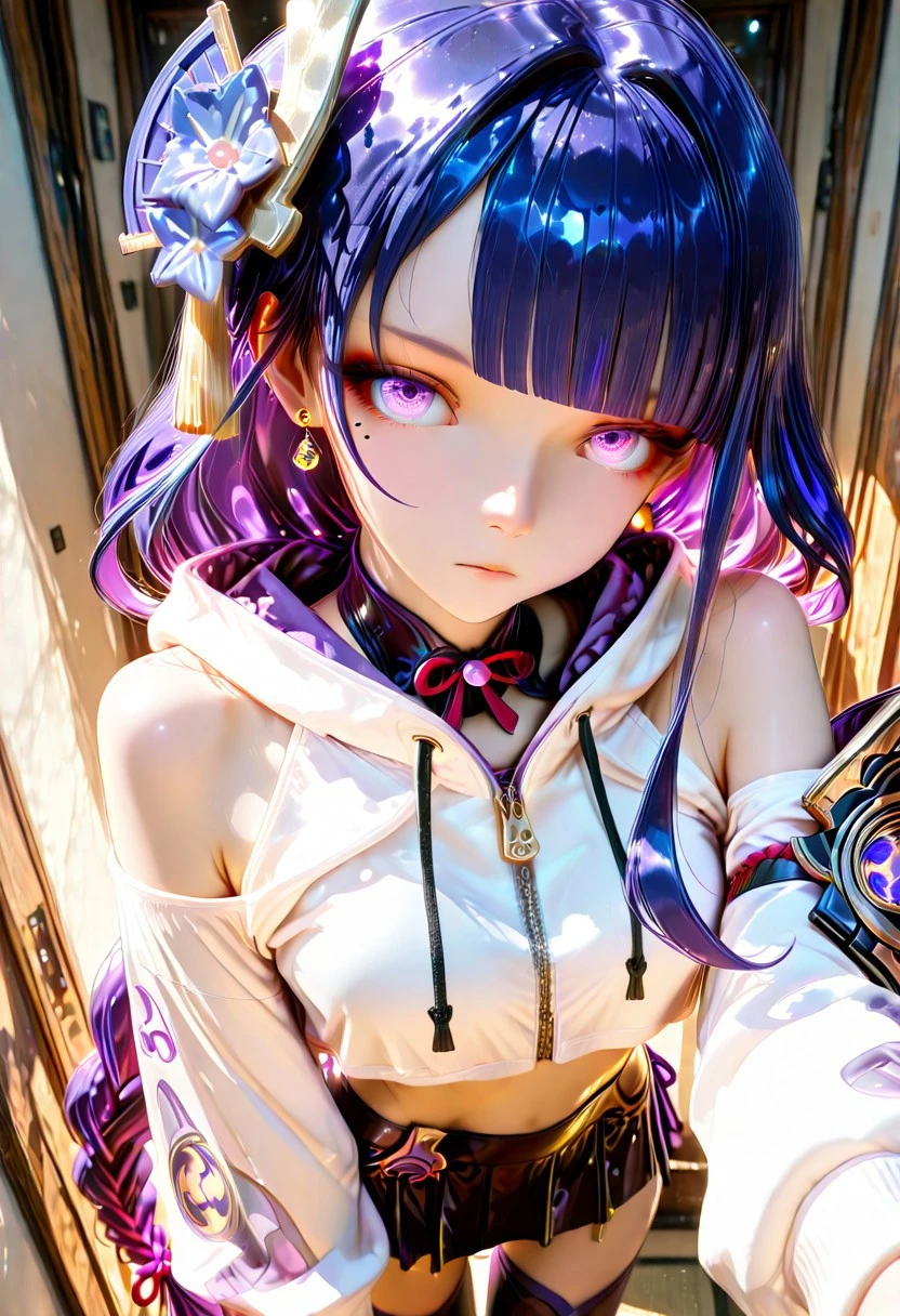 white cropped sleeveless hoodie with front zipper, Long sleeves,bare shoulders, black mini skirt, black thigh-high stockings with purple details