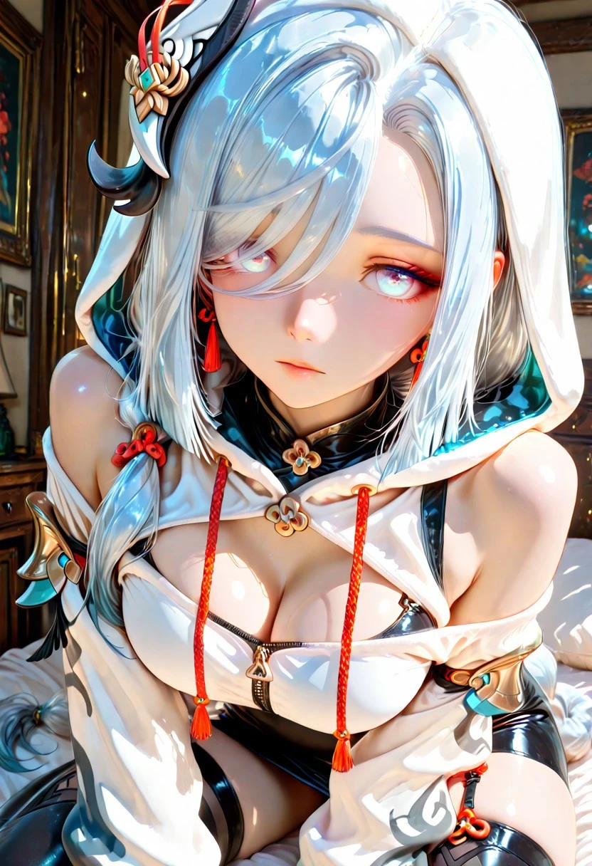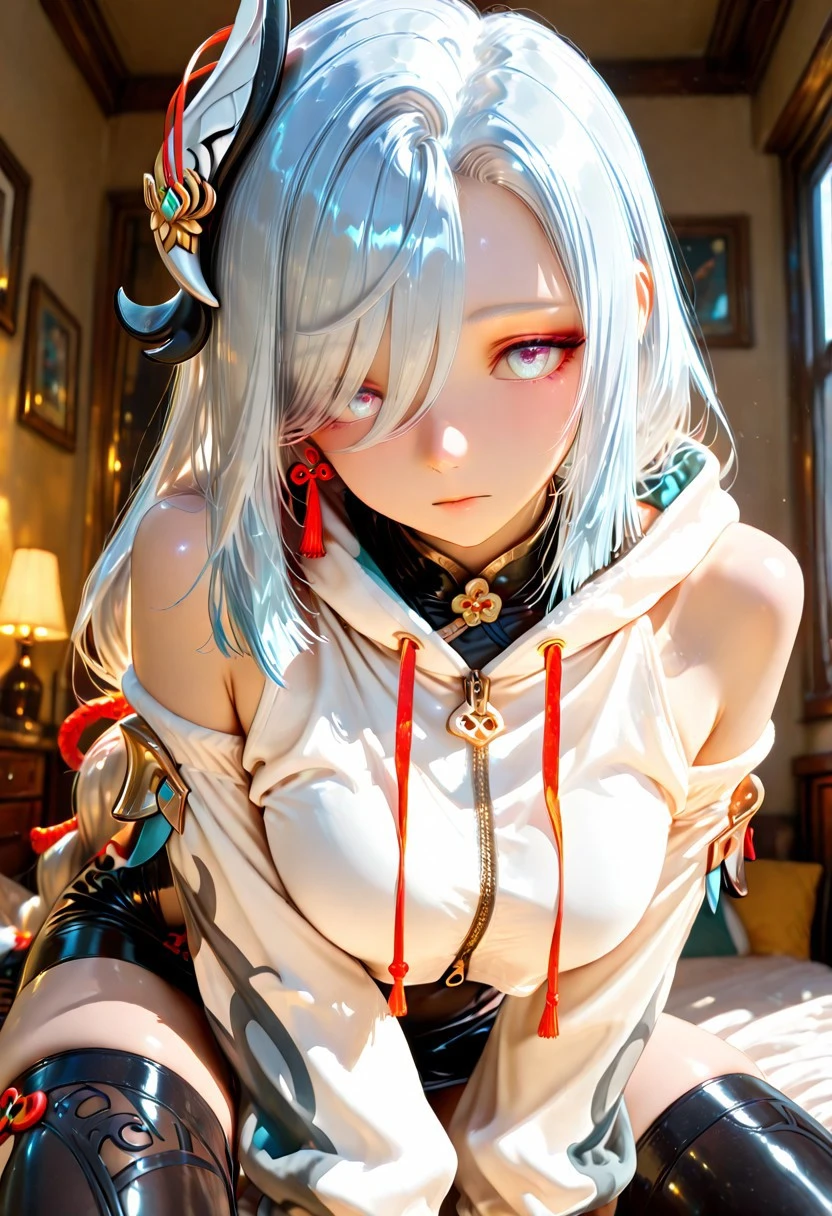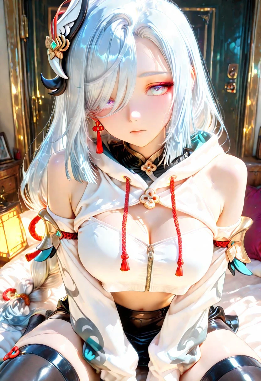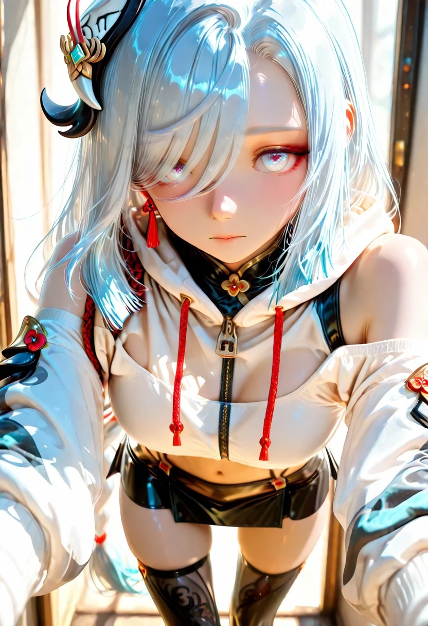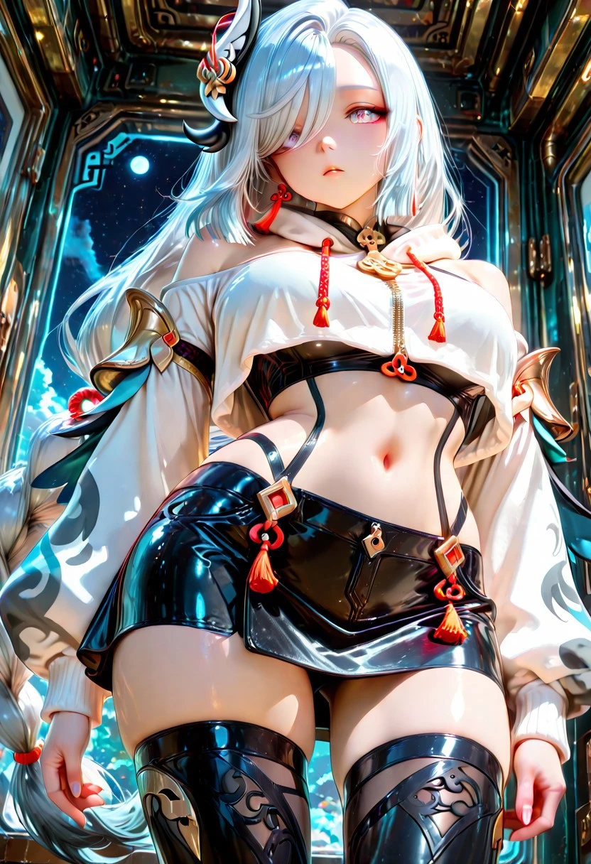 white cropped sleeveless hoodie with front zipper, Long sleeves,bare shoulders, black mini skirt, black thigh-high stockings with purple details