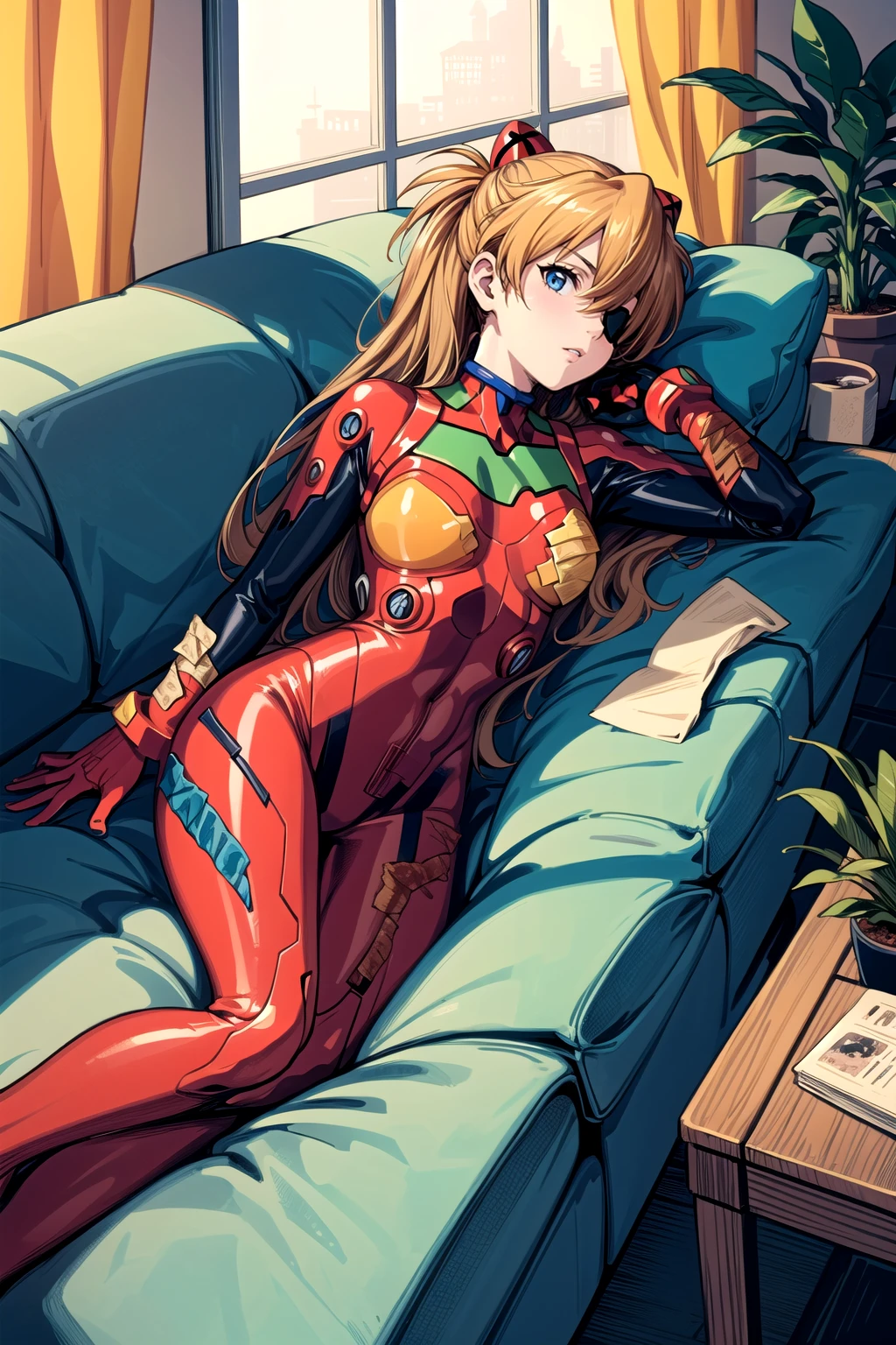 New plugsuit from Rebuild 3.0 - souryuu asuka langley, interface headset, multicolored bodysuit, eyepatch. Adding red plugsuit to negatives sumewhat helps.
