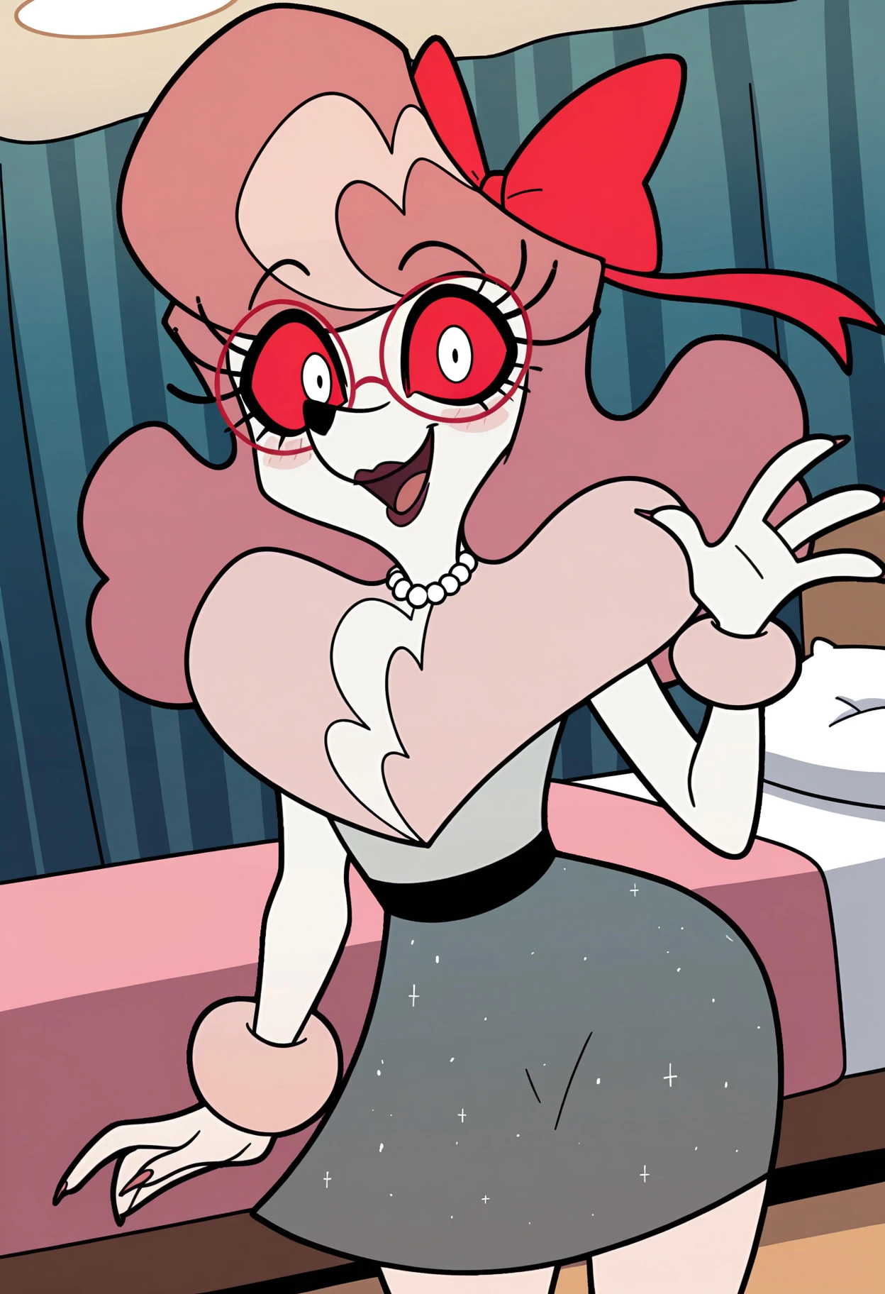 vikkiHB, furry female, furry, colored sclera, red sclera, glasses, red-framed eyewear, animal nose, bow, hair bow, red bow, jewelry, necklace, dress, skirt, grey skirt