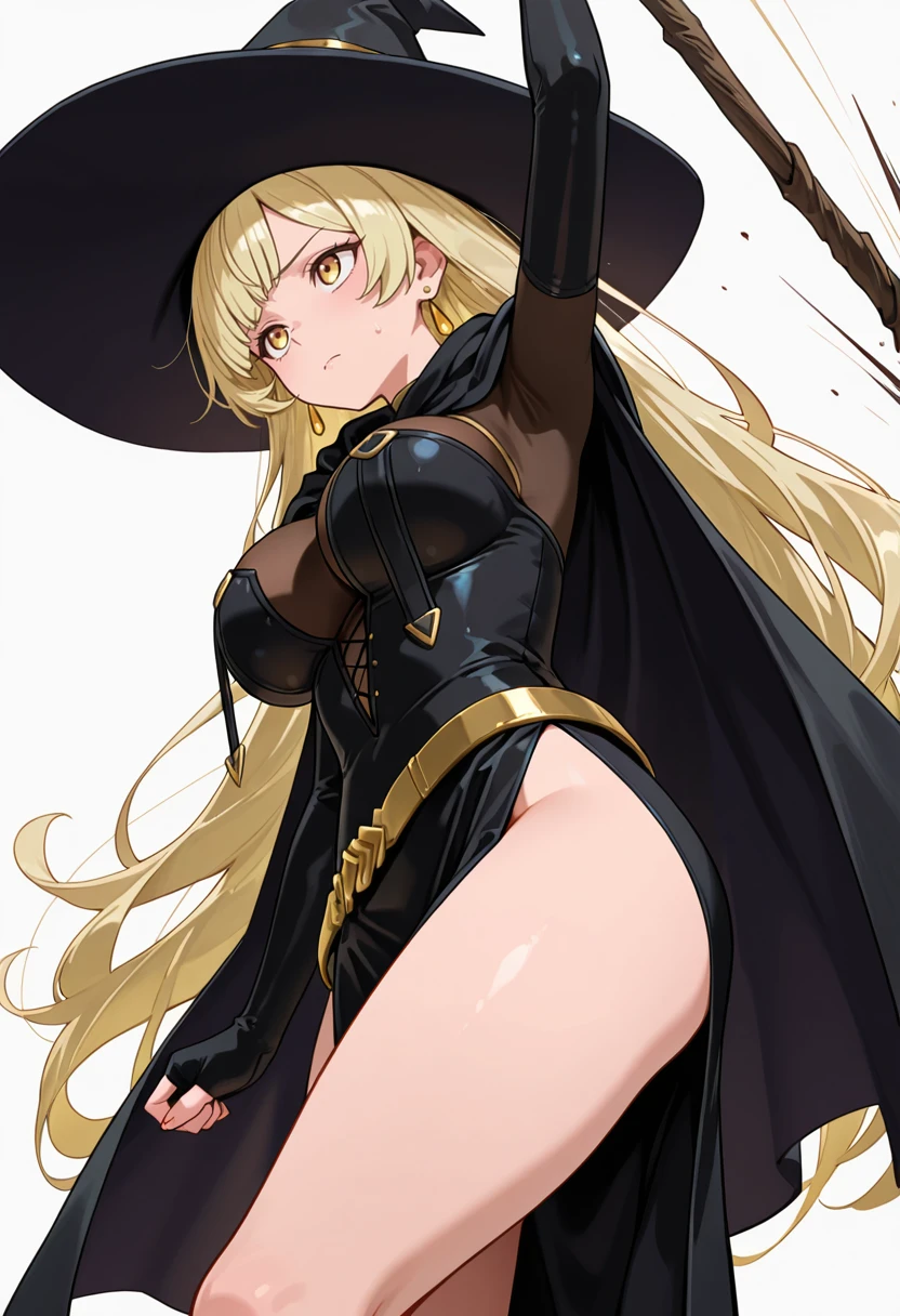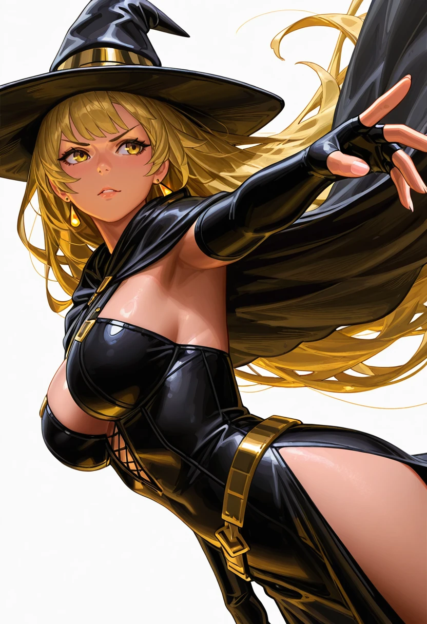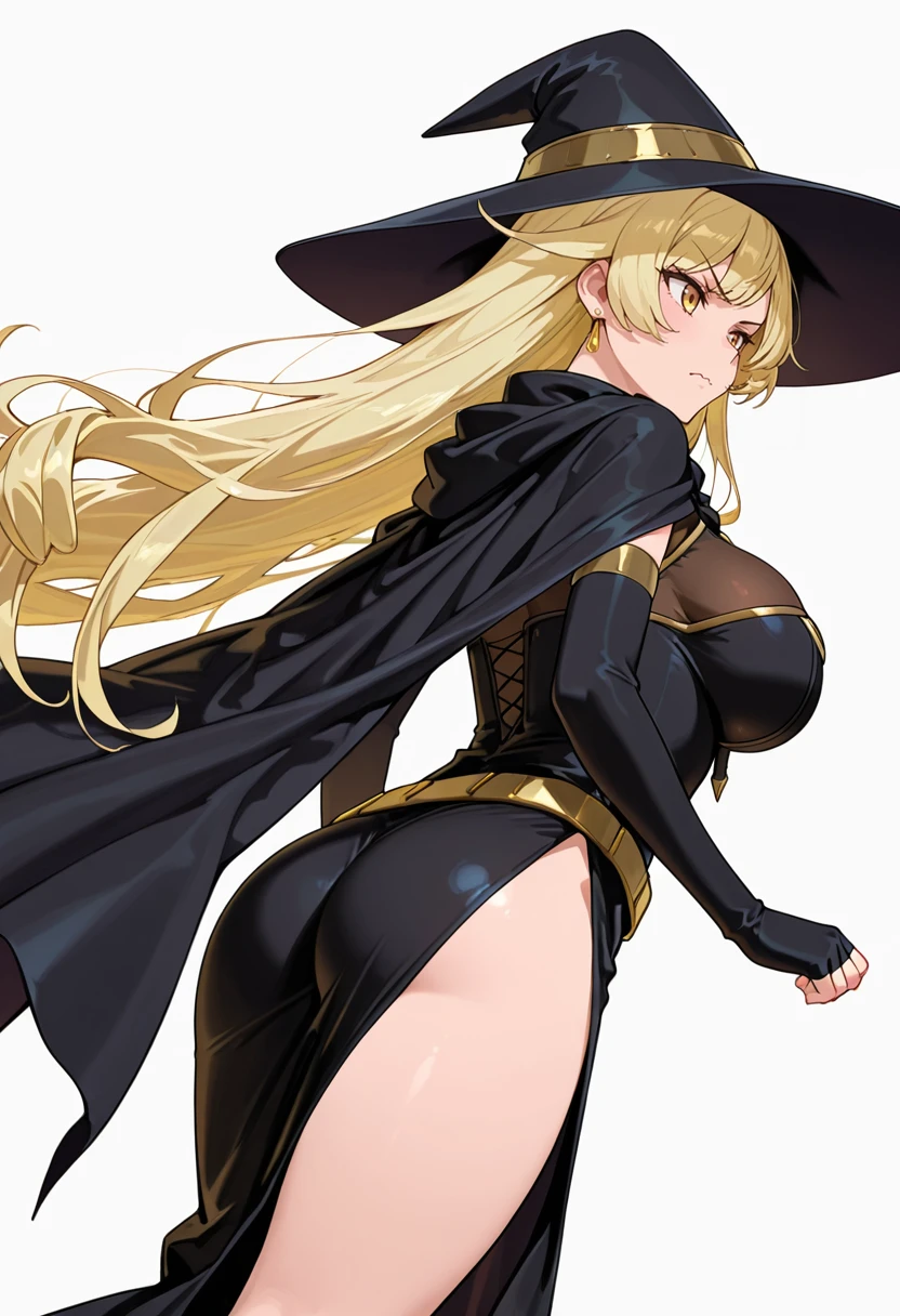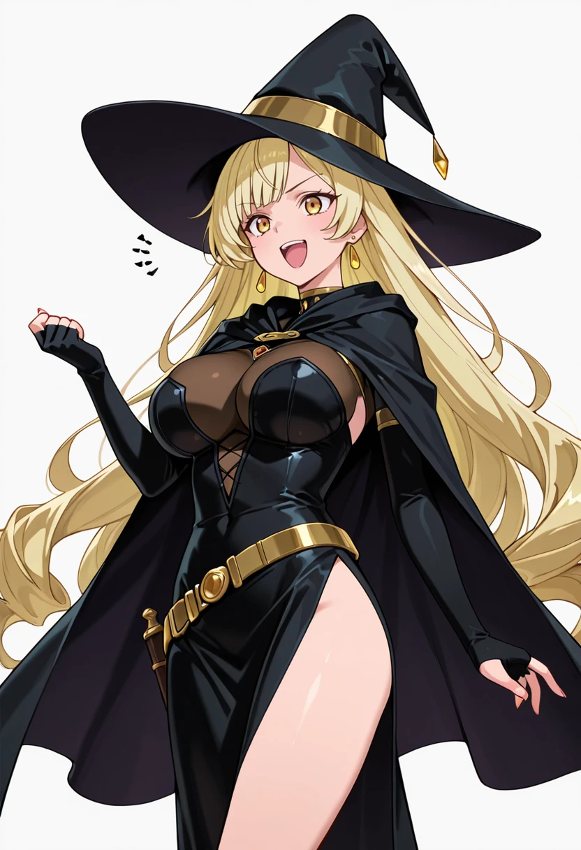 black witch hat,black dress, side slit, cape, black cape,fingerless gloves, black elbow gloves, belt, earrings,witch, Explanation and notes below👇