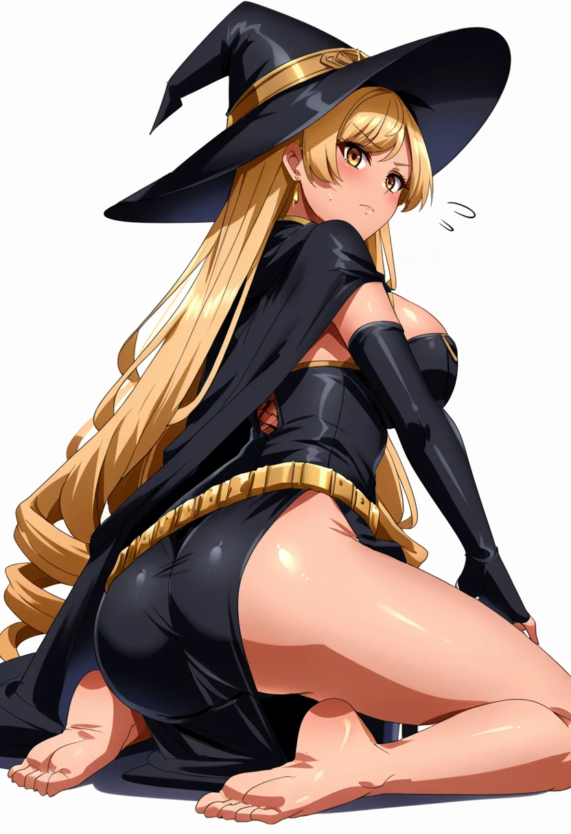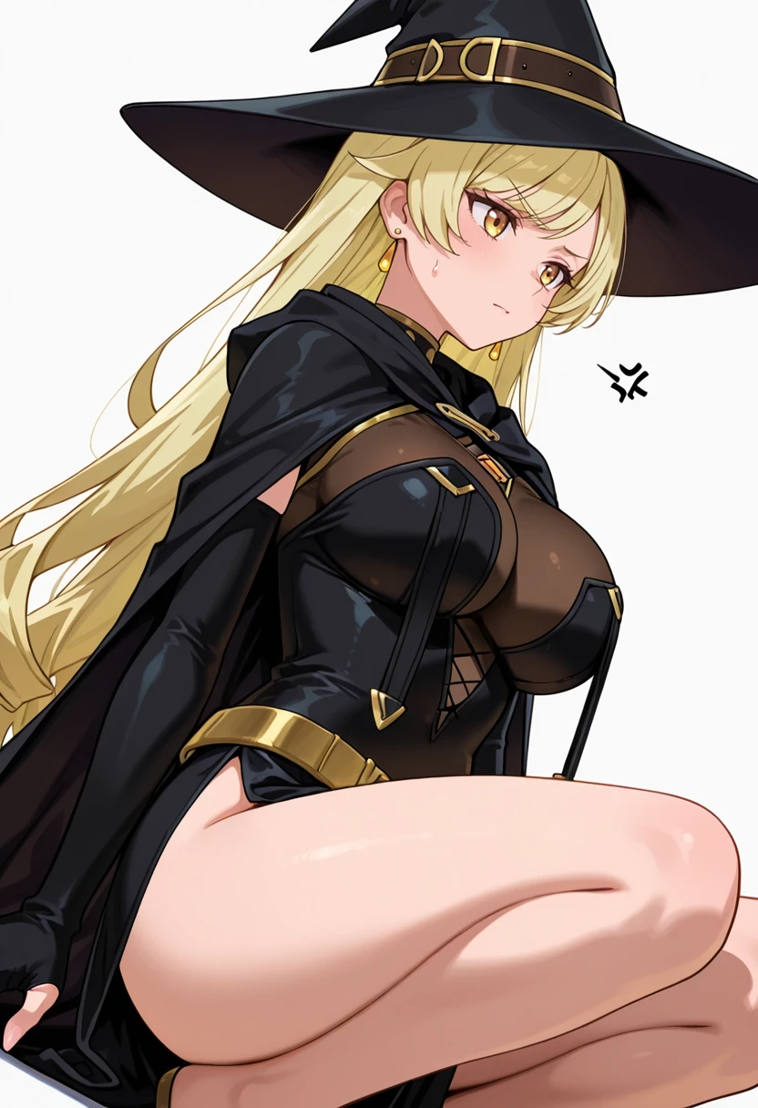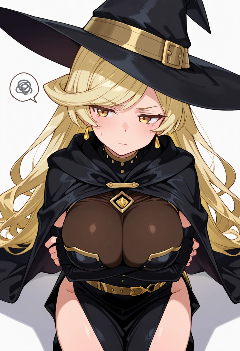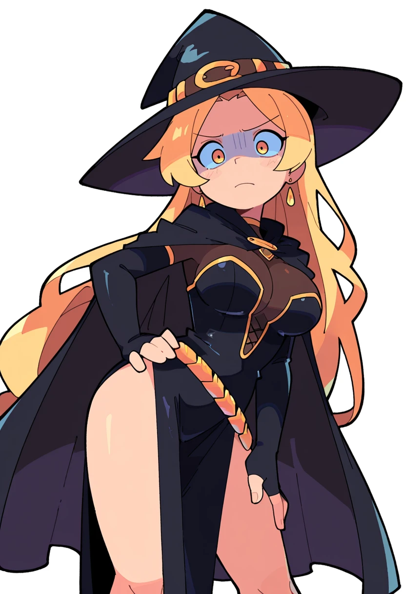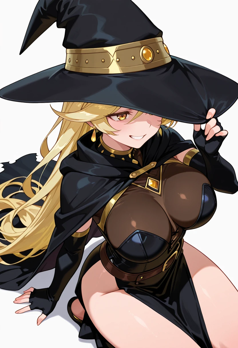 black witch hat,black dress, side slit, cape, black cape,fingerless gloves, black elbow gloves, belt, earrings,witch, Explanation and notes below👇
