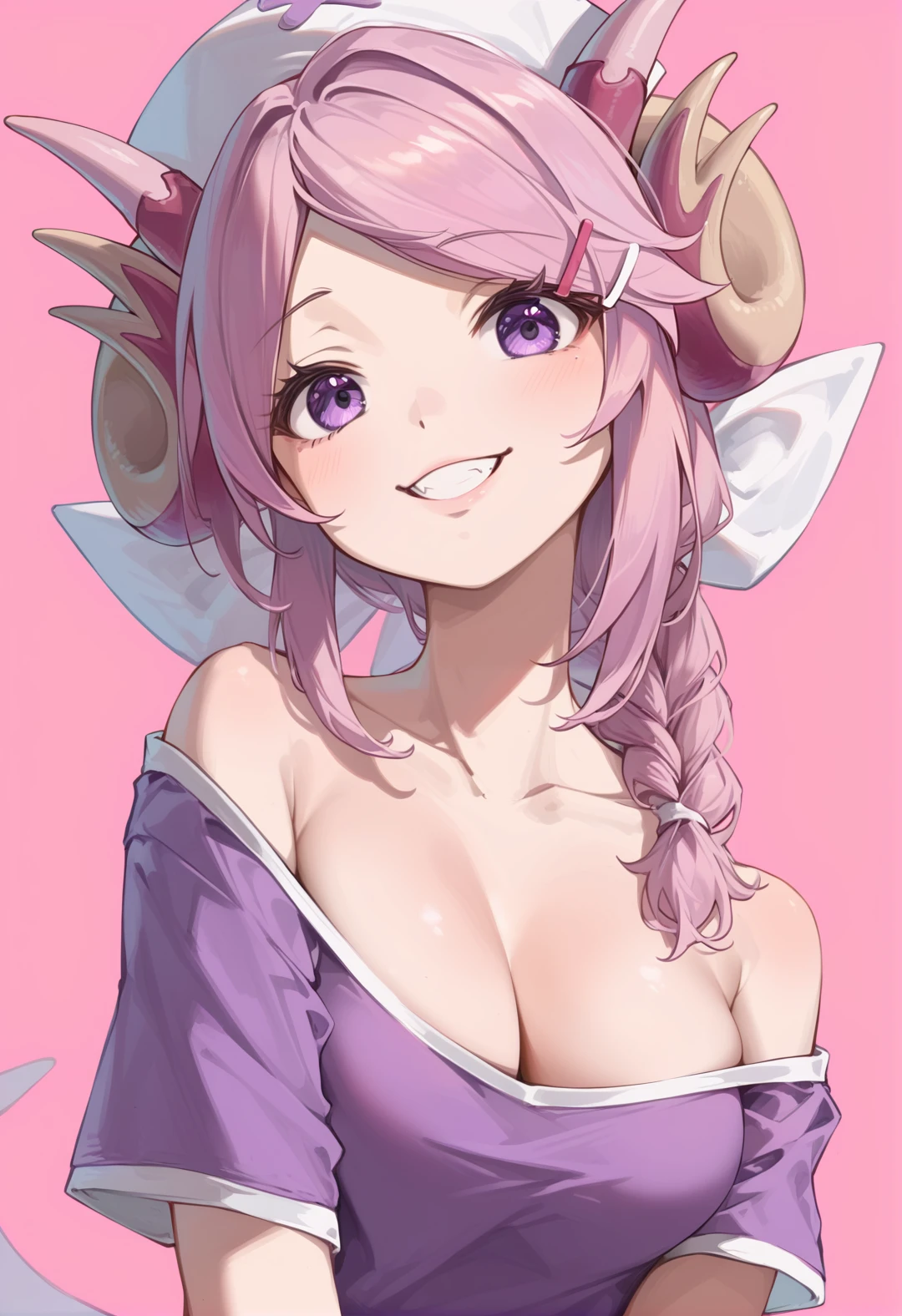 Tags (clothes): white nurse cap, pink wings, pink nurse dress, pink fingerless gloves, pink claws boots, white pantyhose, hairclip,