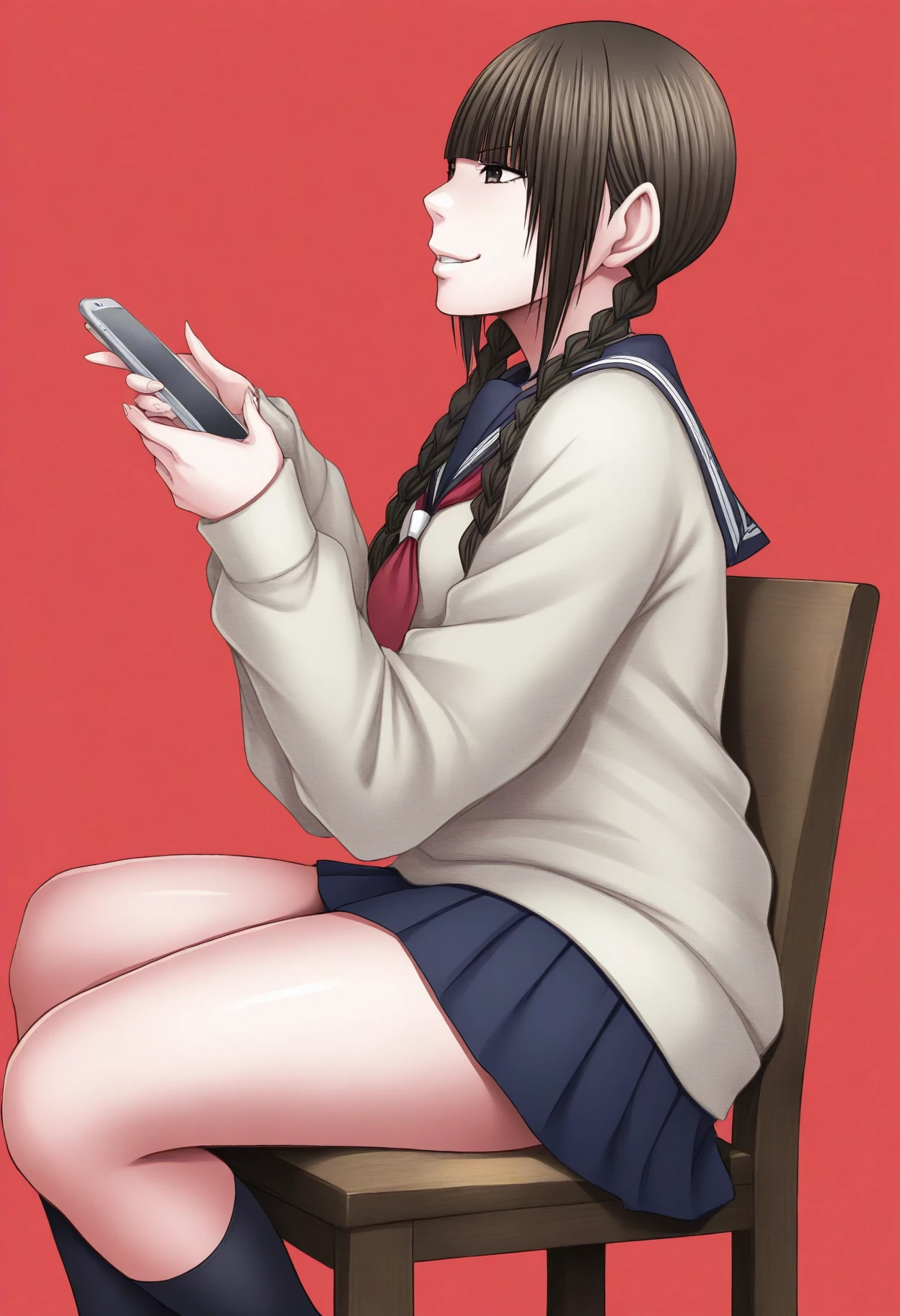 Clothing: blue sailor collar, beige sweater, puffy long sleeves, red neckerchief, blue skirt, pleated skirt,
