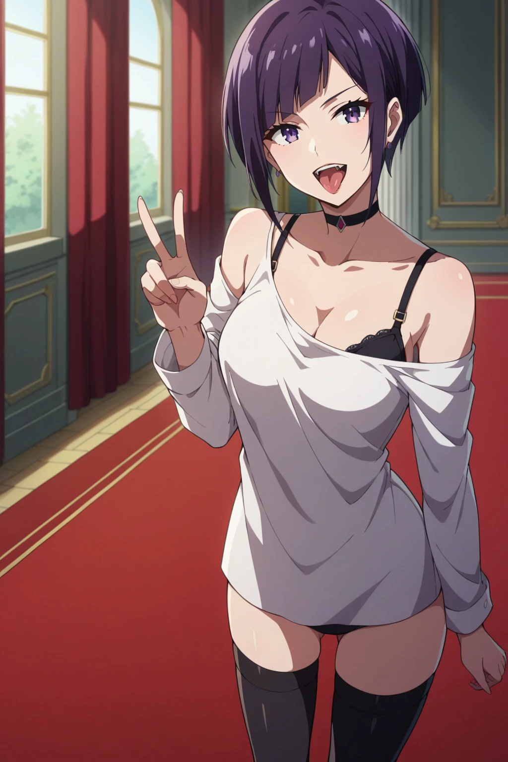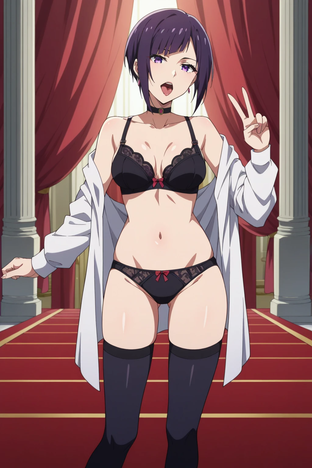 KJOranko, dark purple hair, purple eyes, bangs, short hair, red lipstick,