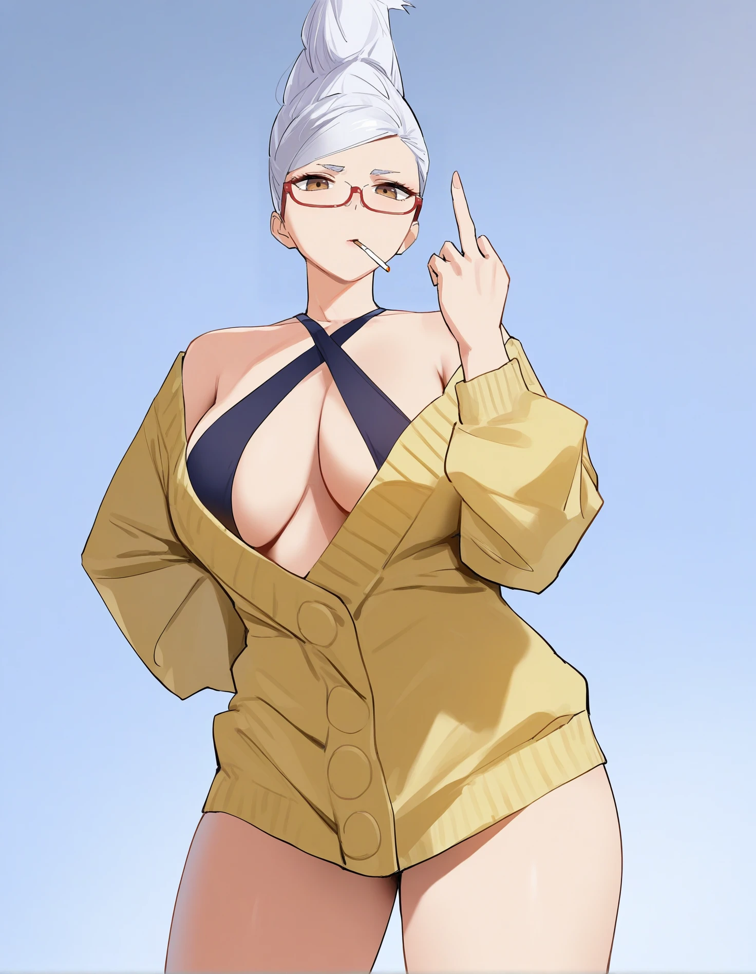 "ayasehal, letterman jacket, red-framed eyewear, criss-cross halter, brown eyes, updo, yellow sweater, blue jacket, cleavage, c no pants, long sleeves, white hair"