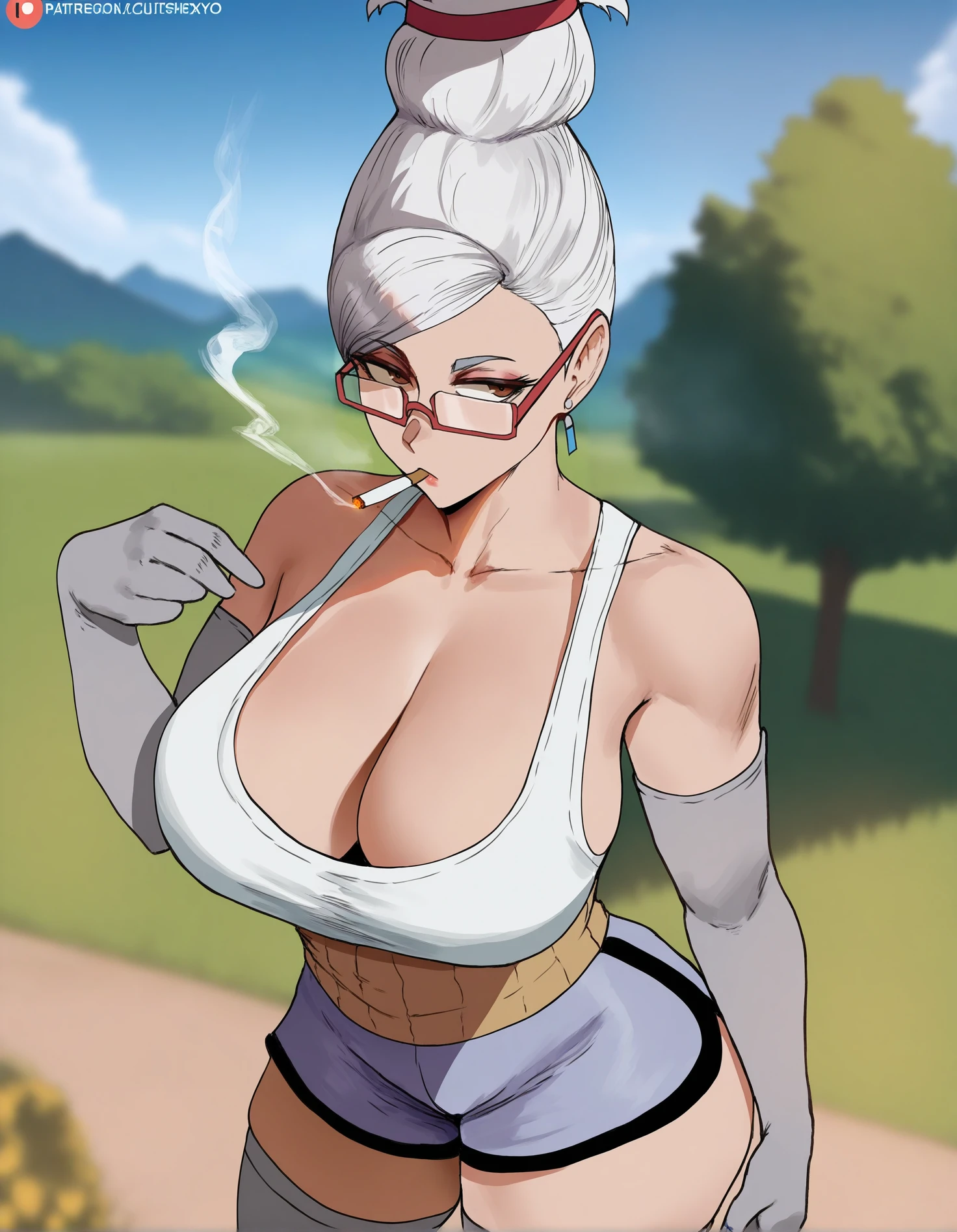 ayasegy,haramaki, large breasts, grey thighhighs, cleavage, short shorts, white hair, updo, red-framed eyewear, white tank top, dolphin shorts, blue shorts, grey elbow gloves, brown eyes