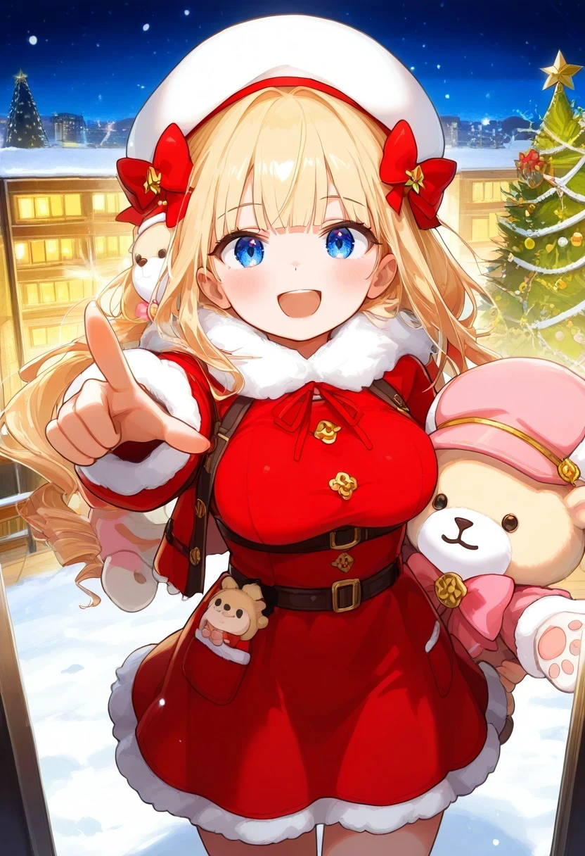white hat,hair bow,red dress,fur trim,stuffed toy,New Year: