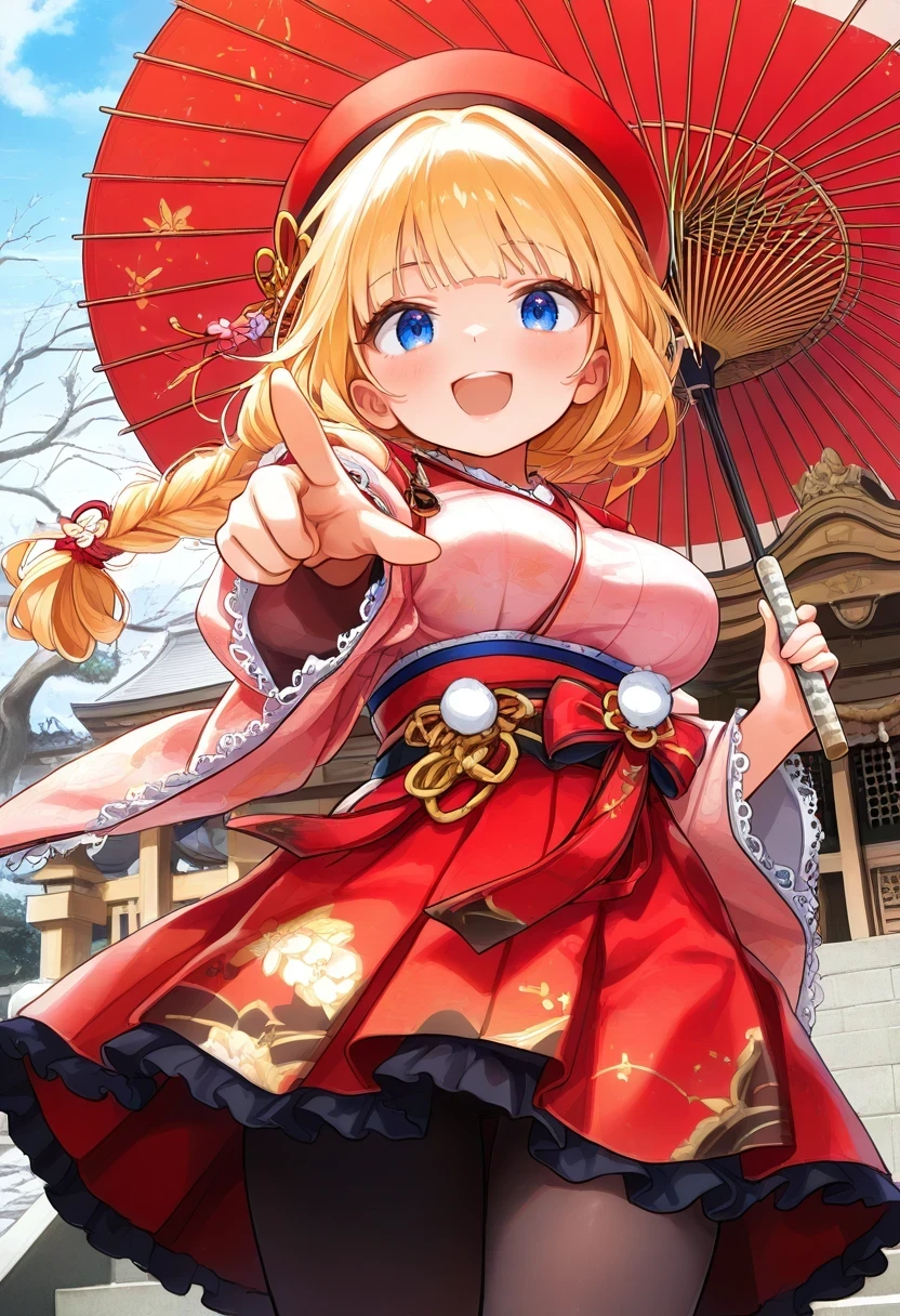 braid,pink kimono,red dress,oil-paper umbrella,red hat,braid,black pantyhose,