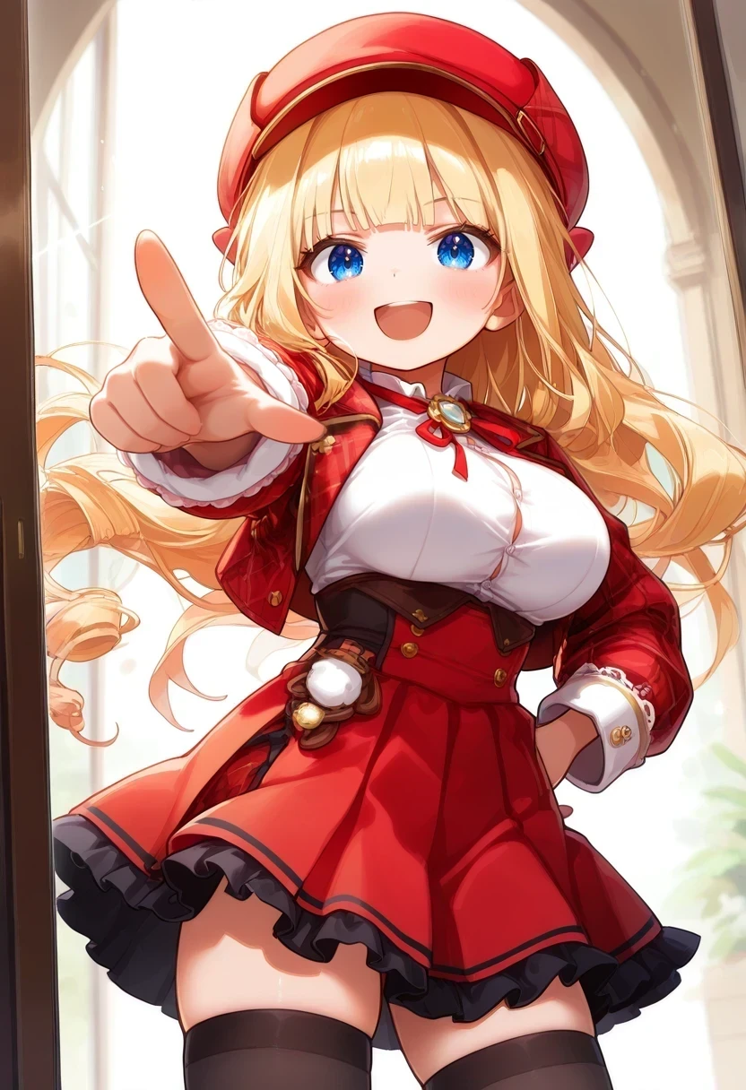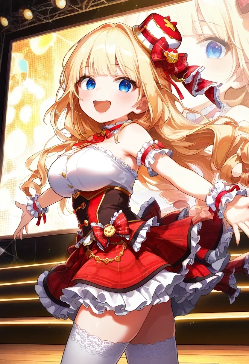mini hat,red ribbon,red skirt,miniskirt,plaid skirt,white thighhighs,bare shoulders,arm strap,frilled straps,plaid bow,