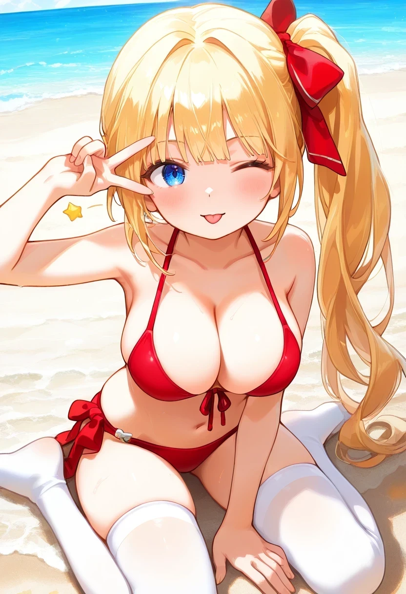 side ponytail,hair ribbon,red bikini,white thighhighs,Description