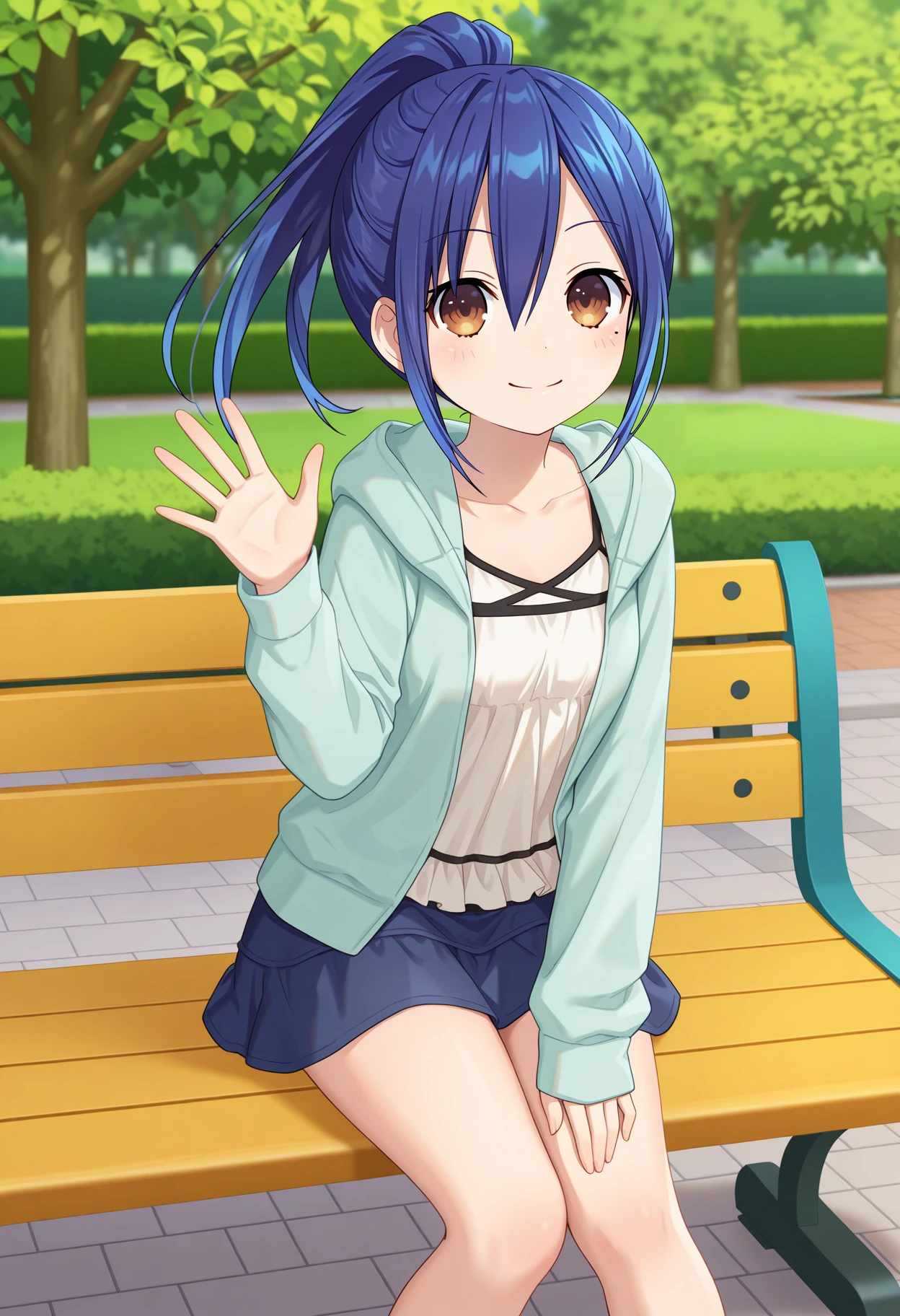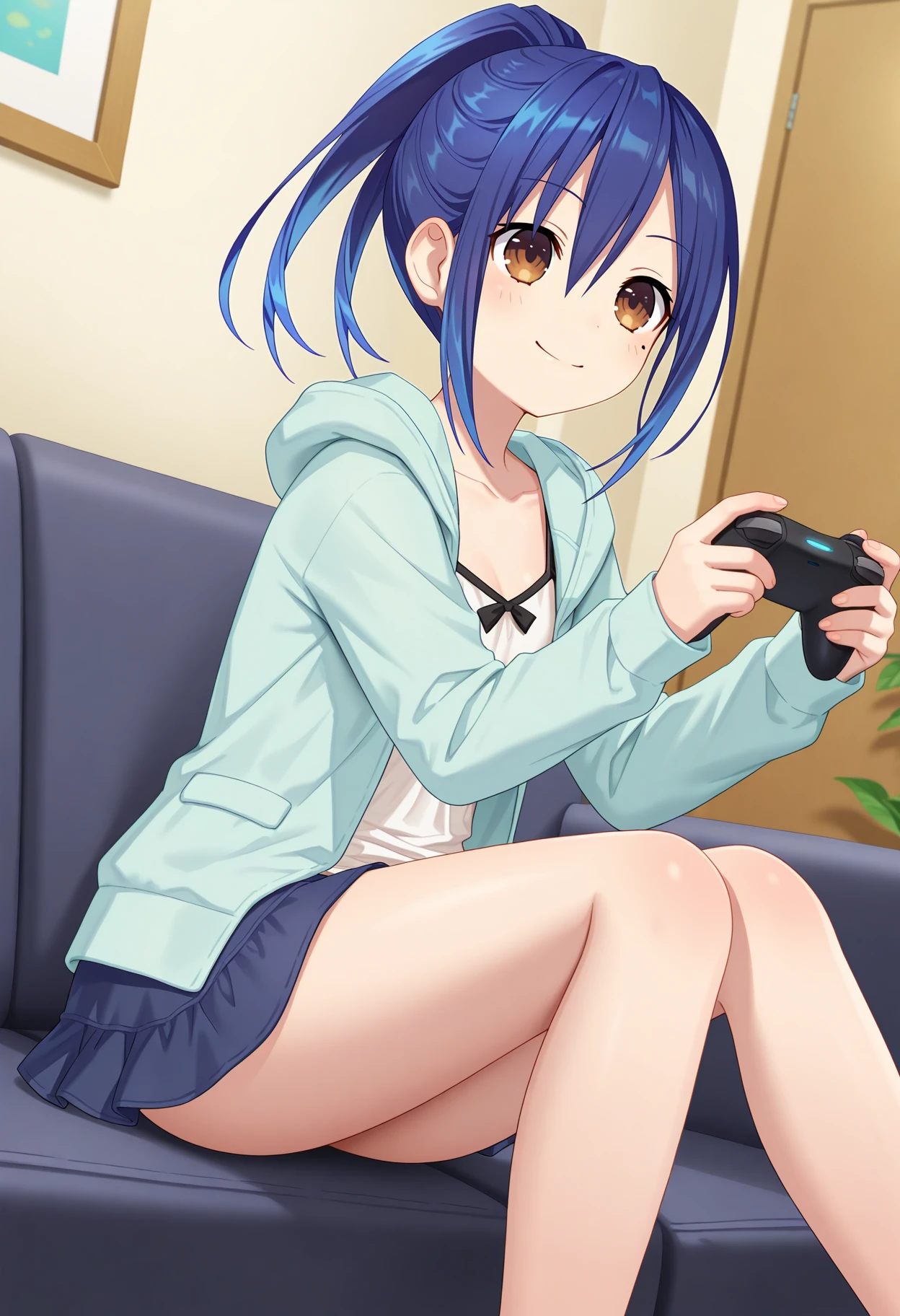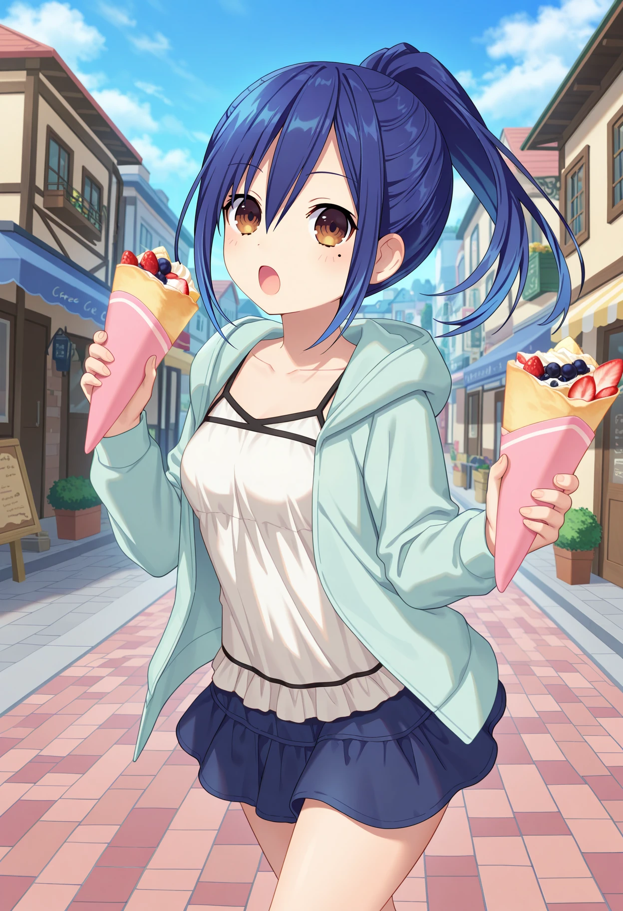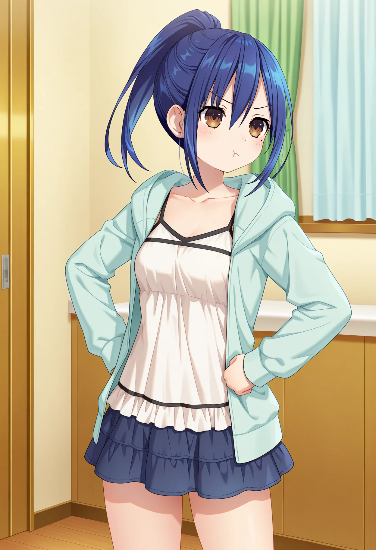 aamana, long hair, blue hair, ponytail, brown eyes, mole under eye, white camisole, hooded jacket, blue jacket, long sleeves, blue skirt