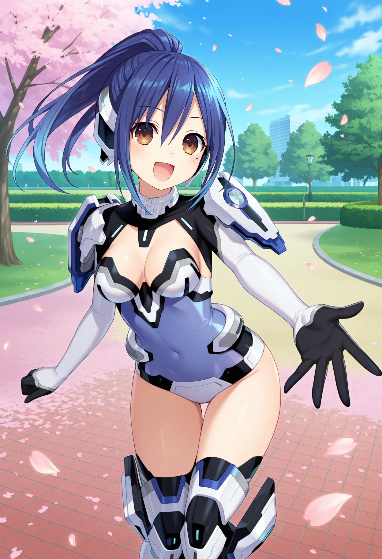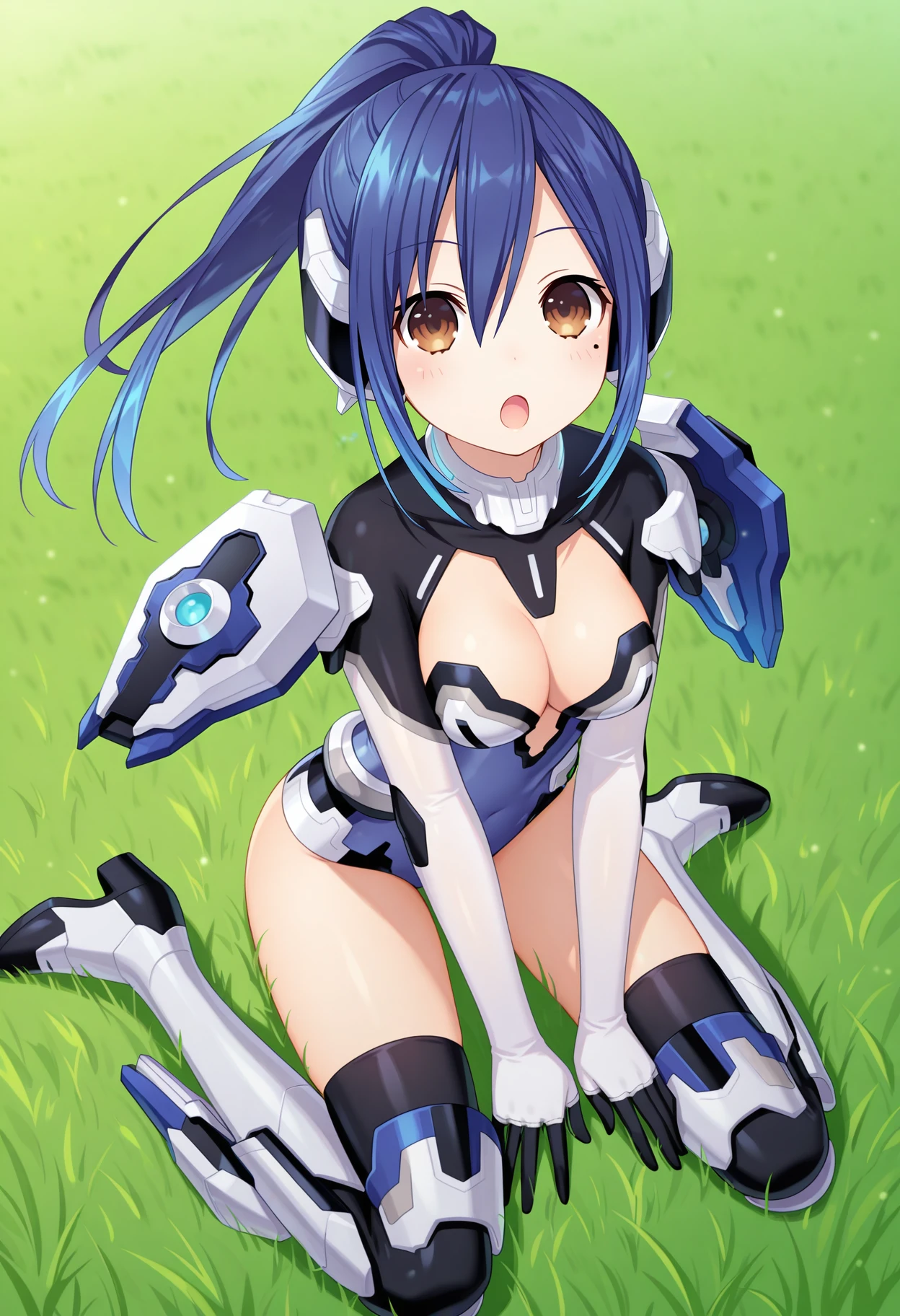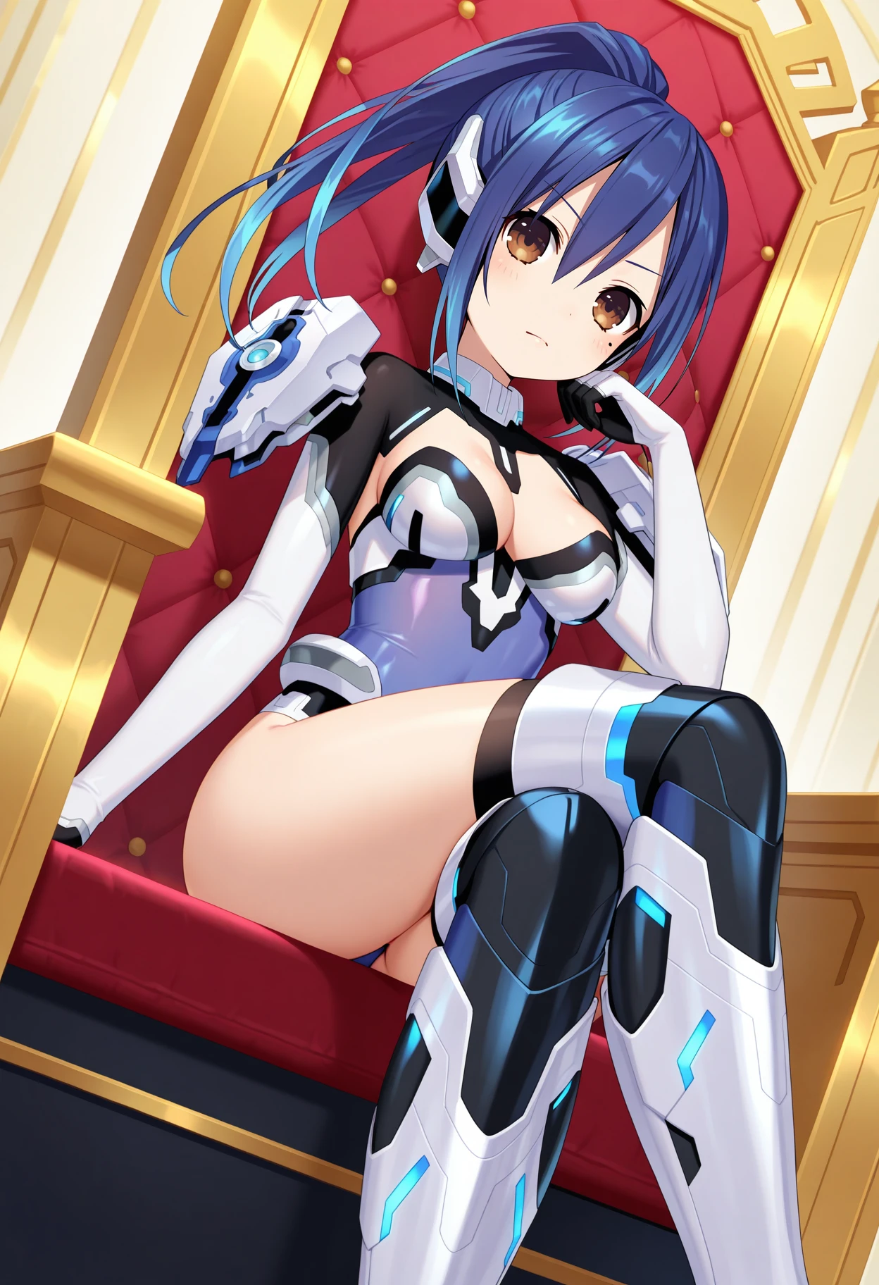 outfit1aamana, long hair, blue hair, ponytail, headgear, brown eyes, mole under eye, armor, clothing cutout, bodysuit, leotard, gloves, thighhighs, armored boots, thigh boots