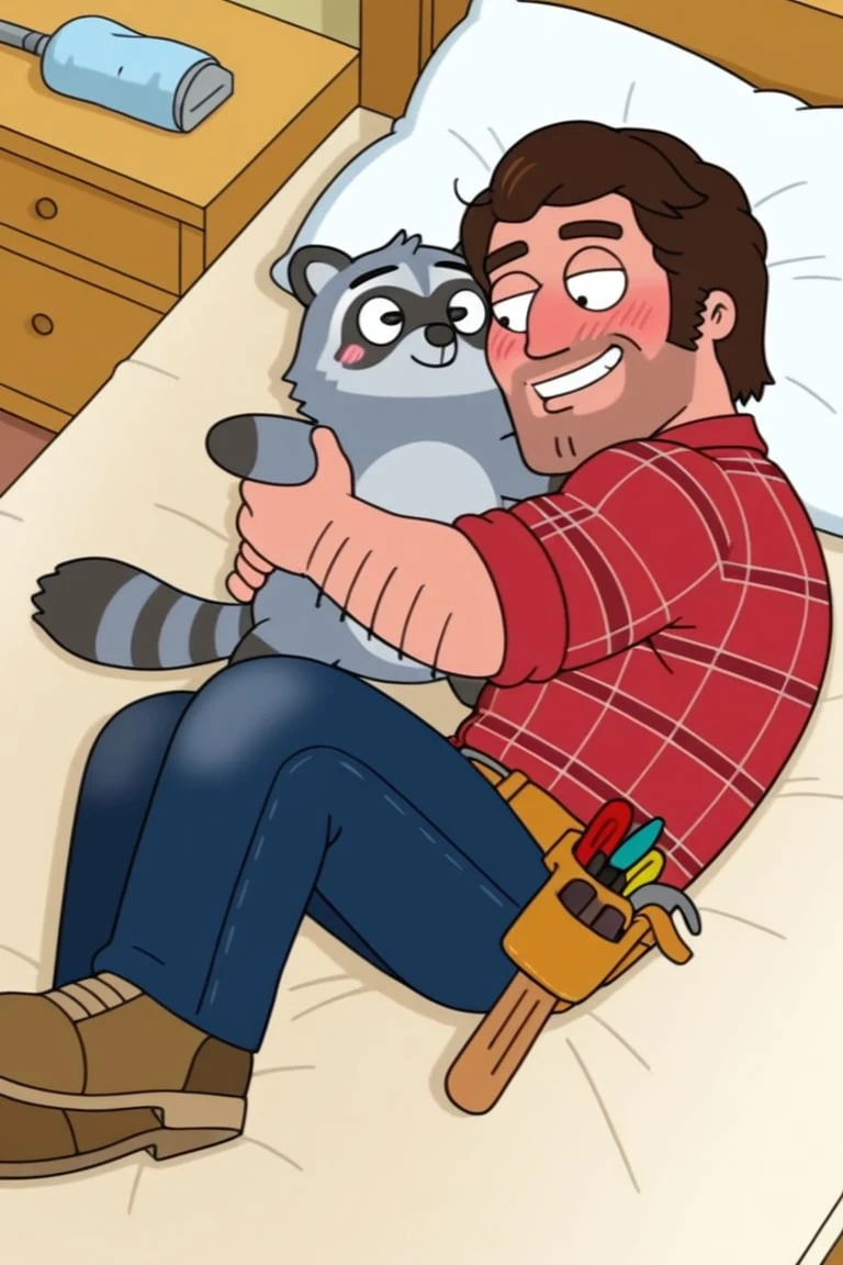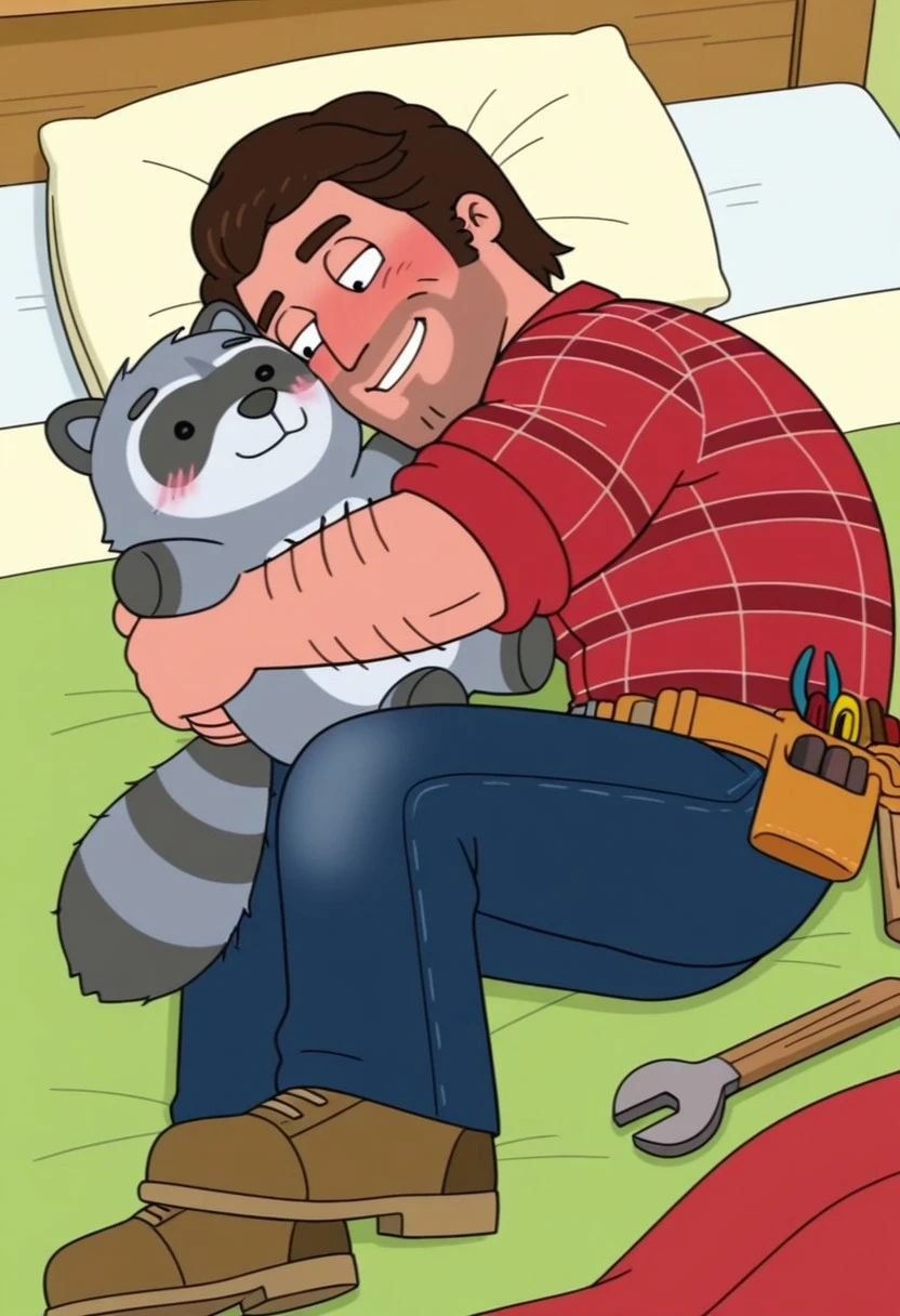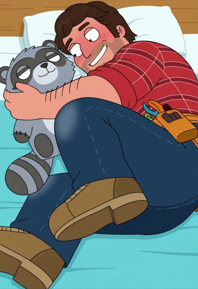 1man,solo,male focus,Jamie Handyman,dark brown hair,thick eyebrows,facial hair,muscular,arm hair,chest hair,red plaid shirt,rolled up sleeves,dark blue jeans,brown shoes,tool belt,